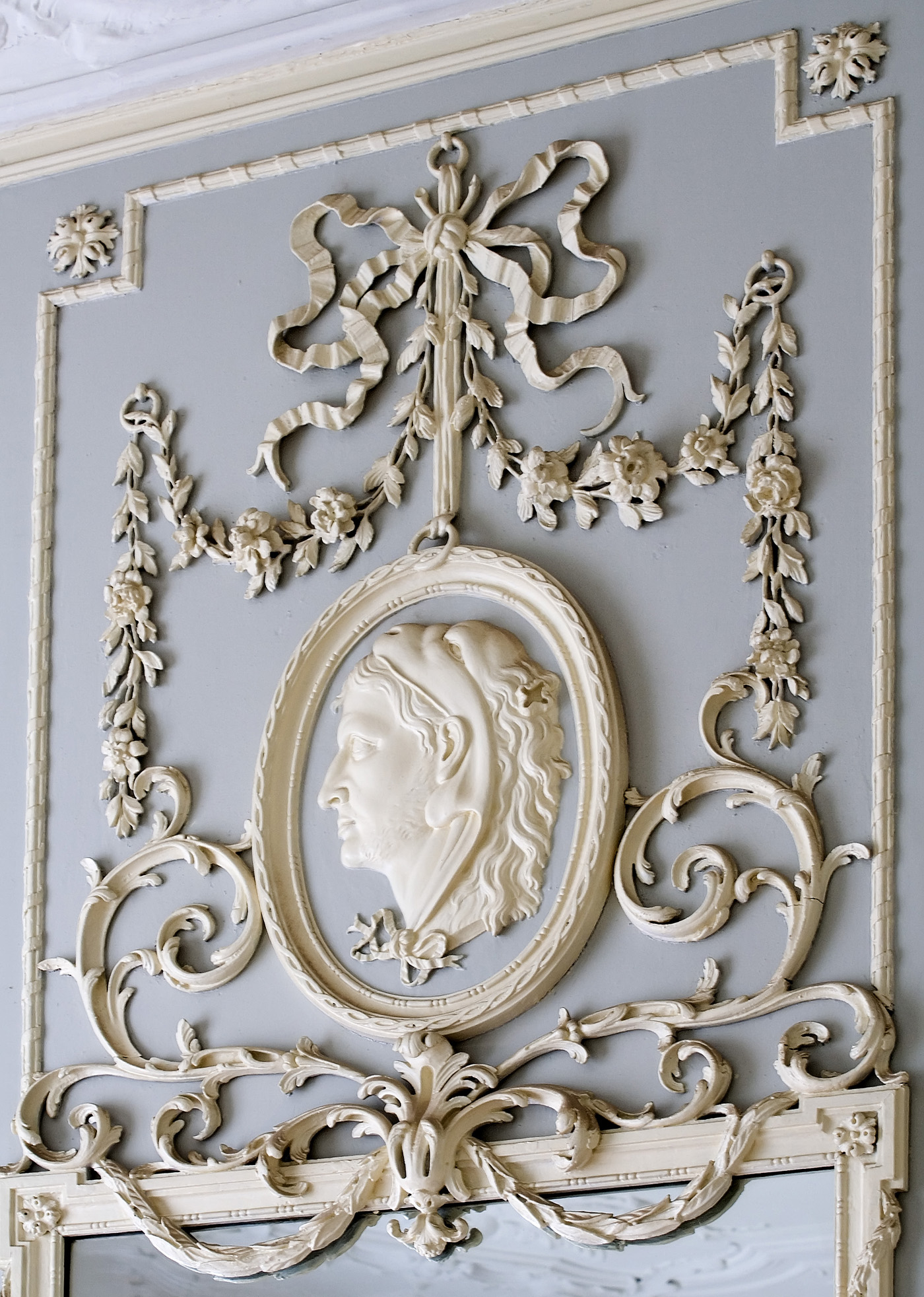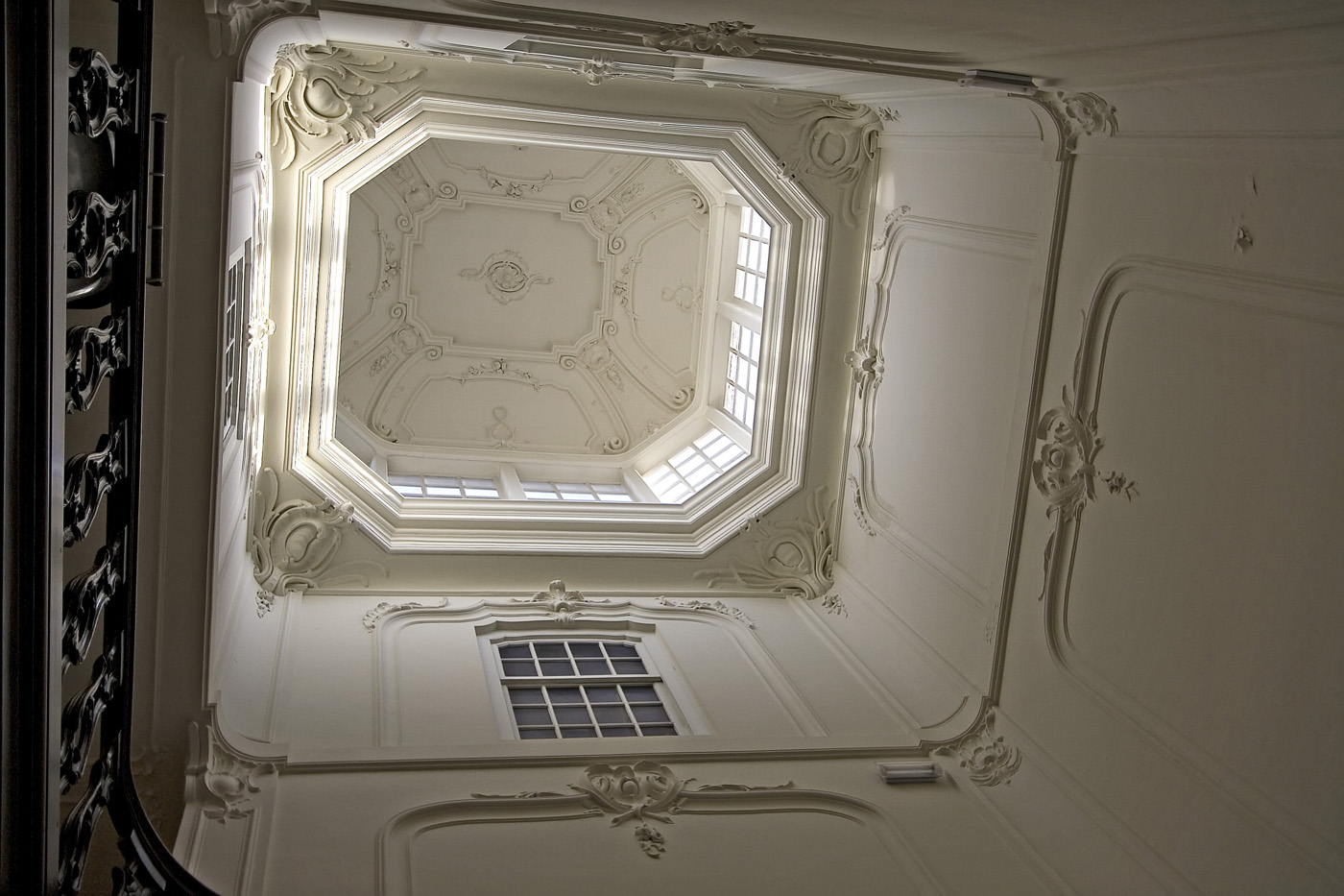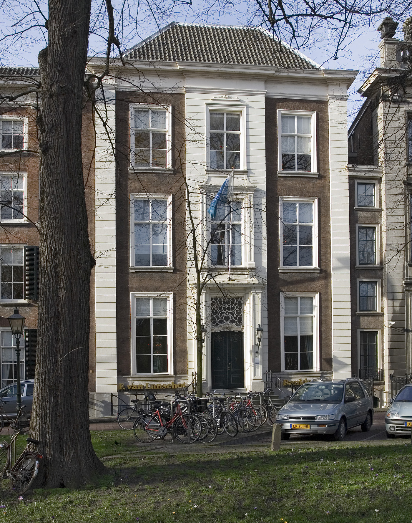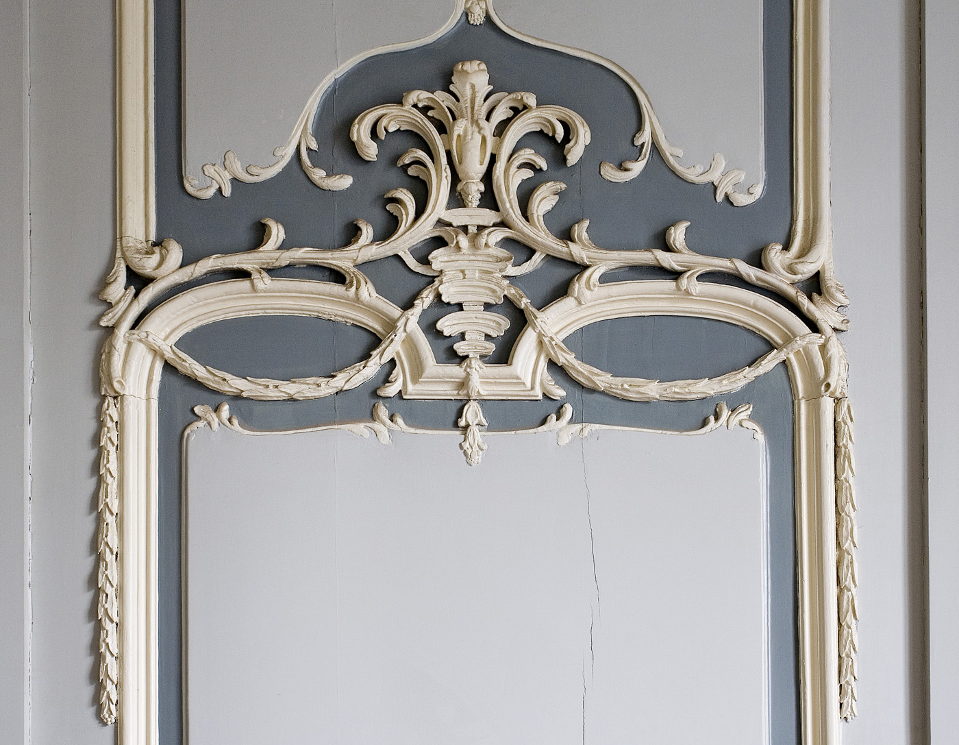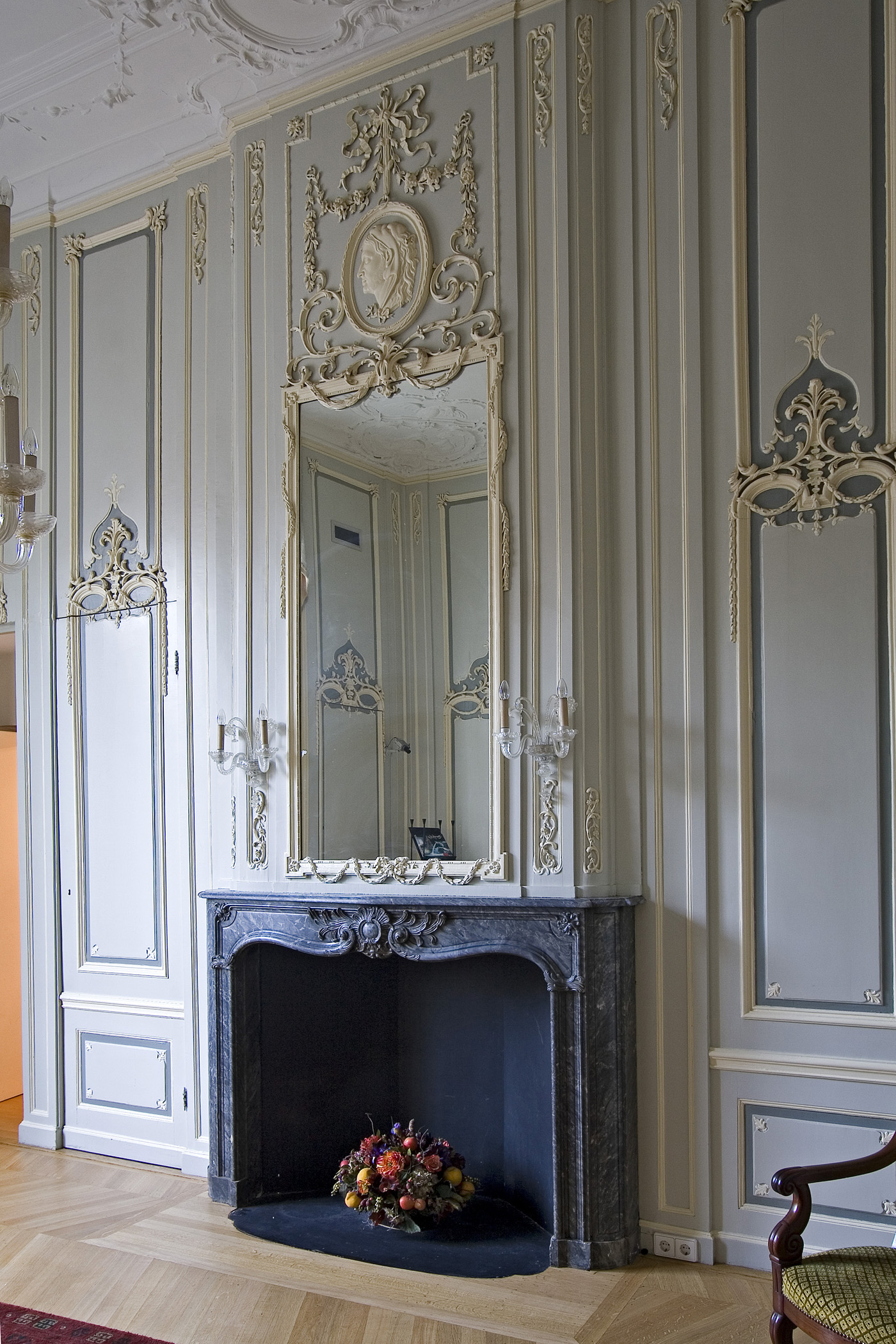 Pand met bakstenen gevel uit het midden van de 18e eeuw met hardstenen plint, middentravee, hoekpilasters en stoep - Lodewijk XV deur met gesneden kalf en bovenlicht - rijk versierd interieur in Lodewijk XVI stijl.