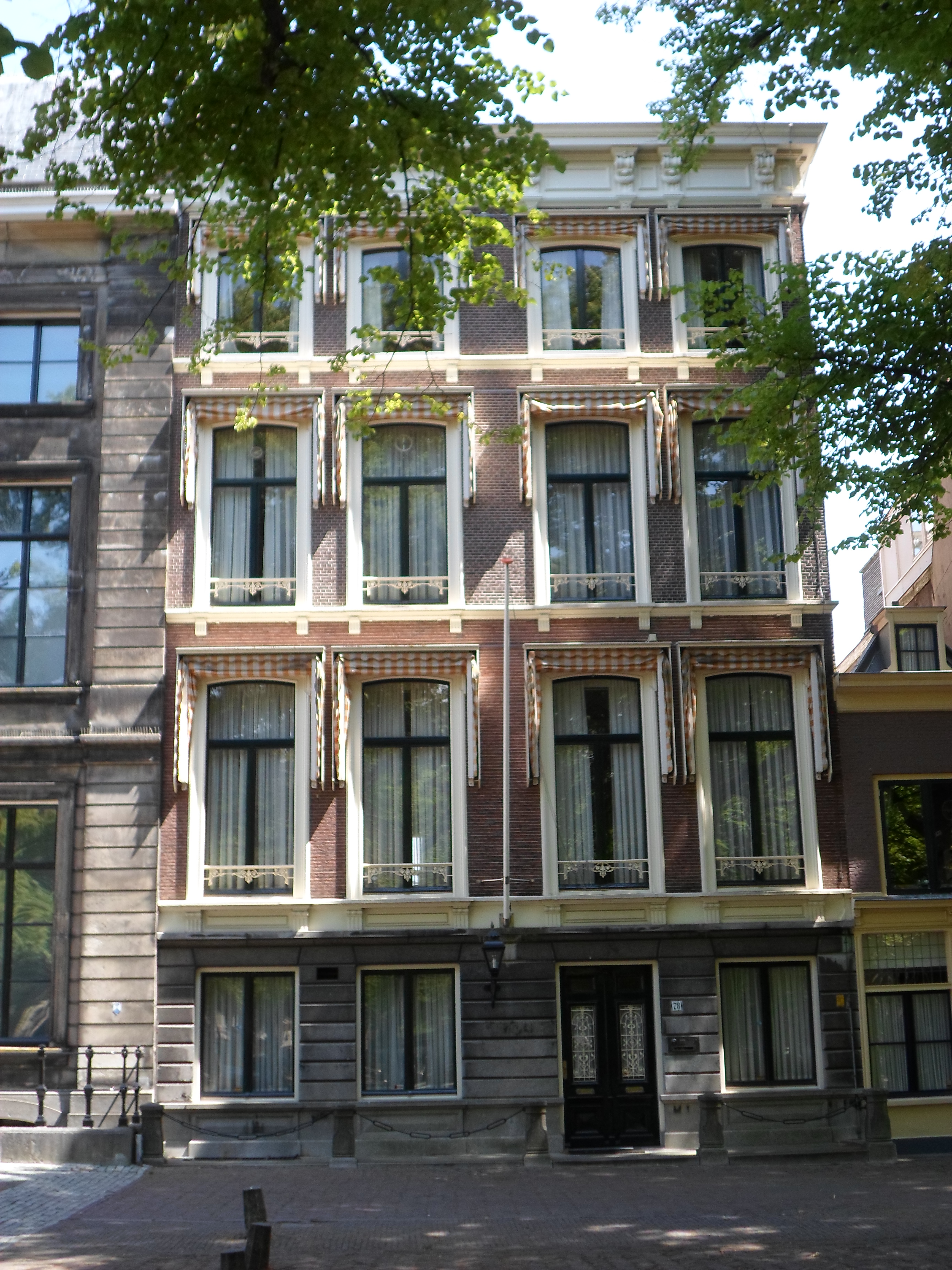 Pand met bakstenen gevel uit de 19e eeuw met kroonlijst op gesneden consoles.