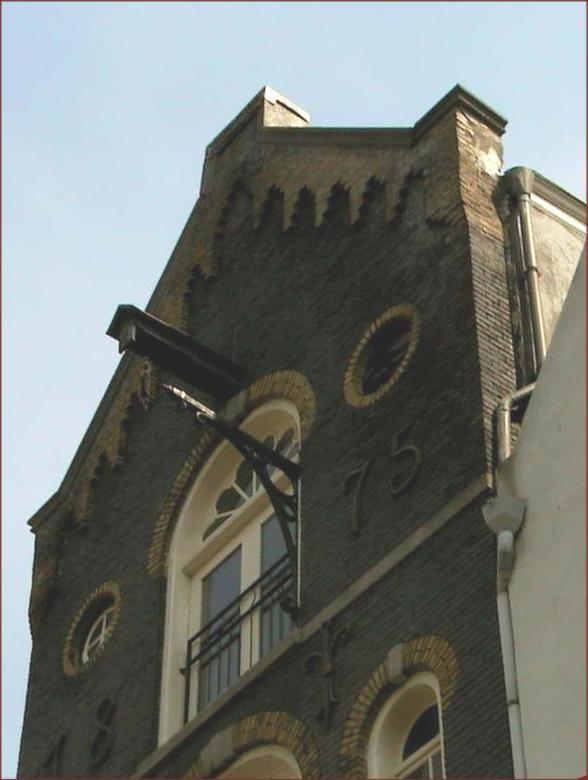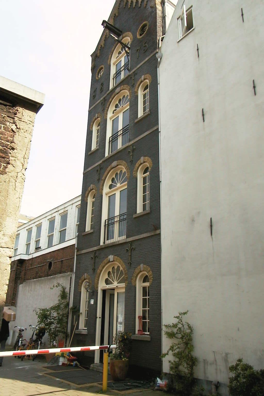 Voormalig pakhuis op rechthoekige plattegrond bestaande uit kelder, parterre, twee verdiepingen en een zolderverdieping onder een met pannen gedekt zadeldak. De gevels zijn opgetrokken in schoon metselwerk; de zijgevels zijn blind uitgevoerd. De voorgevel, een later zwart gesausde drie-assige tuitgevel, bevat brede rondboogvensters in de middenas (luiken vervangen door glasdeuren; bovenlichten met oorspronkelijke ster- en lobvormige roedeverdeling); in de zijassen kleinere vensters. De waterlijsten, dorpels en sluitstenen zijn van natuursteen. Boven de vensters is gele baksteen toegepast, evenals voor het oplopend fries in de top. De top heeft natuurstenen afdeklijsten en een smeedijzeren sierstuk. Voorts zijn er jaartal-ankers. Roosters voor de gevel bedekken de drie lichtkolken van de kelder. Tegen de linkerzijgevel is later een uitgebouwde schoorsteen opgemetseld. De achtergevel is een bakstenen tuitgevel. In de jaren zeventig en tachtig zijn de oorspronkelijke ongedeelde ruimten verbouwd tot woonruimte. Waardering.