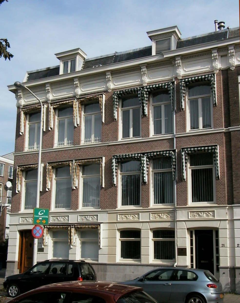 Pand uit 1881-1882, bestaande uit lage, gepleisterde parterre, twee verdiepingen en afgeknot zadeldak met dakkapel. Breedte drie venster assen. Hardstenen plint, geprofileerde lijst tussen de eerste en tweede verdieping. Houten kroonlijst met panelen en rijk gesneden neo-Lodewijk XIV consoles. Onder de vensters van de eerste verdieping panelen met rijke stucversieringen.