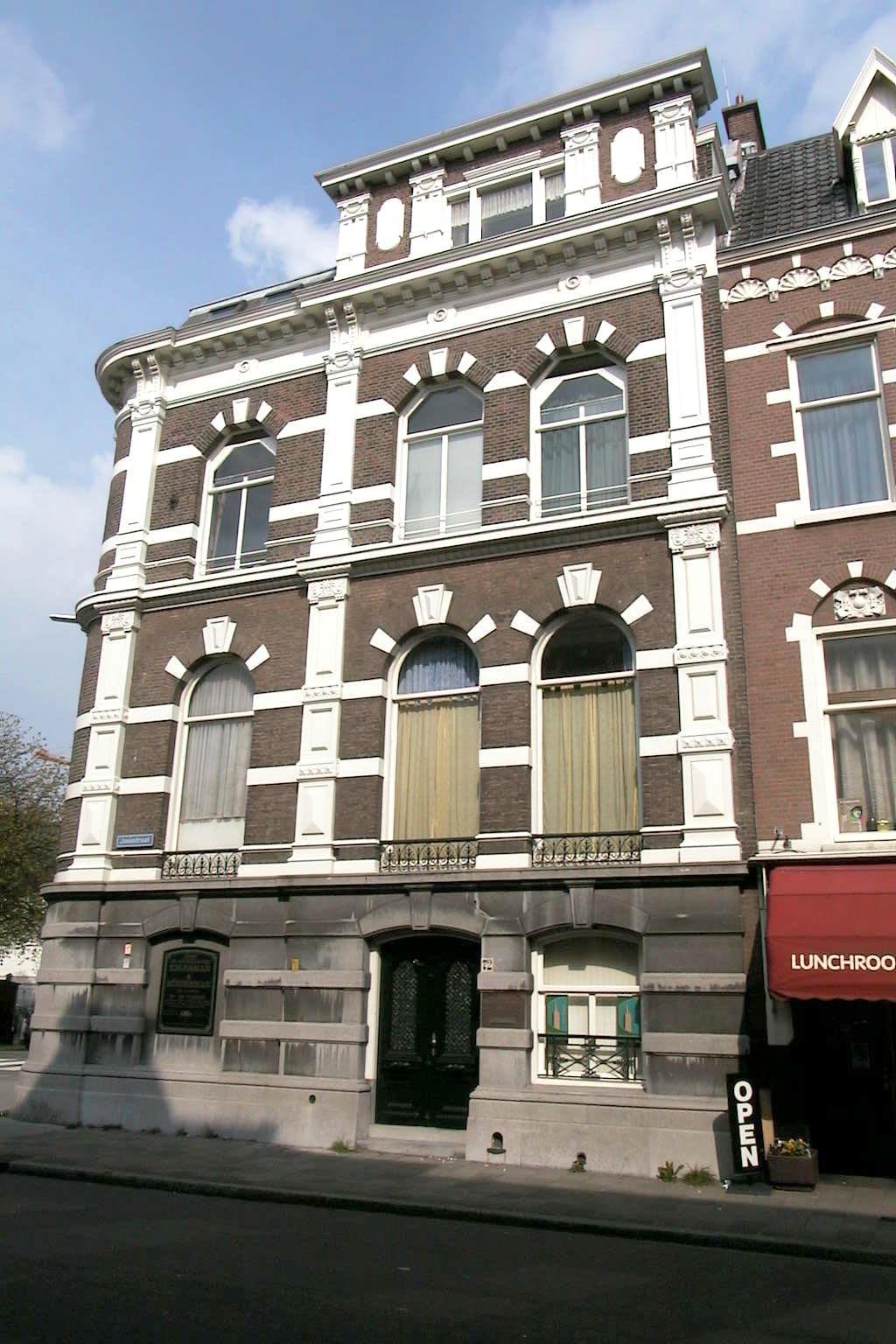 Monumentaal hoekpand in eclectische neorenaissancestijl uit de jaren tachtig van de 19de eeuw. Het herenhuis bestaat uit een lage parterre, belétage en verdieping met kapverdieping in het Mansardedak. Het pand is drie vensterassen breed en vier assen diep. De hoektravee bezit een afgerond gevelbeloop.