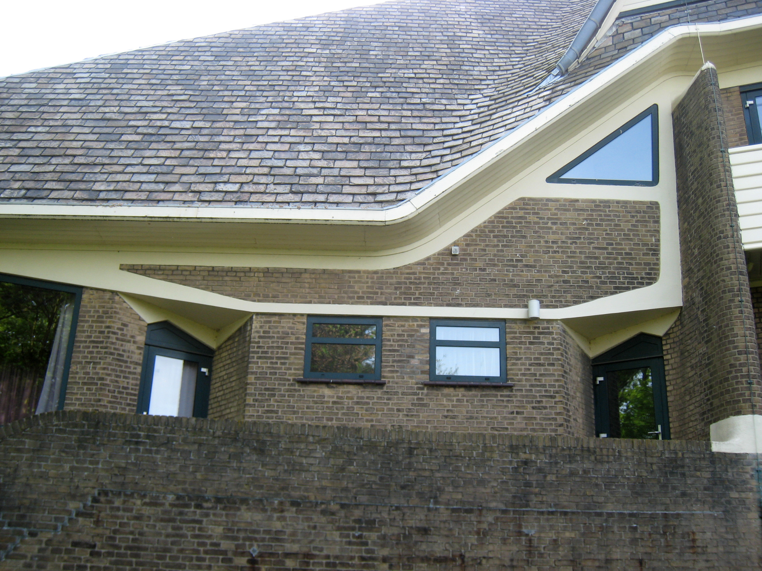 Aan de zuidzijde bevindt zich de ingangsportiek met schuine muren en luifel en met de gebeeldhouwde deur met afgeschuinde hoek uit de bouwtijd als hoofdtoegang; aan de Z.W.-zijde is een driezijdige erker uitgebouwd over de eerste en tweede bouwlaag waar in oorsprong respectievelijk de eetzaal en een conversatiekamer waren ondergebracht en waarbij op de verdieping een hoekbalkon is aangebracht met uitkragende houten borstwering en waarbij het gebouw een verspringing vertoont en een afgeronde hoekpartij die beide in de kap worden gemarkeerd; hieromheen is een terras met lage tuinmuur gesitueerd, met een trap aan het westelijk eind. De vertrekken aan de oostzijde zijn minder geprononceerd, zij het dat ook hier afgeschuinde zijden en een ingangsportiek voorkomen alsmede een lage tuinmuur. De gehele partij, waarin het centrale trappenhuis is ondergebracht, krijgt uitwendig nog een extra accent doordat de kap hier het hoogste punt - met schoorsteen - bereikt langs een steile helling.