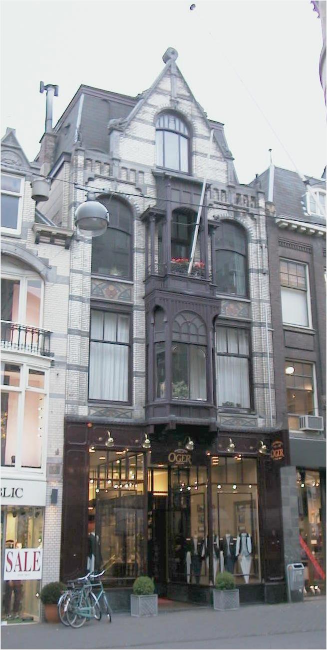Pand ter breedte van drie vensterassen, hoogte: parterre en twee ver diepingen. Gevel in Art Nouveau, bekleed met witte, geglazuurde steen, afgewisseld door blauwe en gele banden. De middelste vensteras heeft een houten erker waarboven een loggia. De beide zijassen worden geleed door hoge rondboognissen waarin de verdiepingsvensters. Tussen deze vensters decoraties in Art Nouveau. De gevel wordt bekroond door een puntgevel met gebeeldhouwde versieringen op de afdekkende lijst. Het pand is gebouwd in 1901 naar ontwerp van L.A.H. de Wolf. Storende pui.