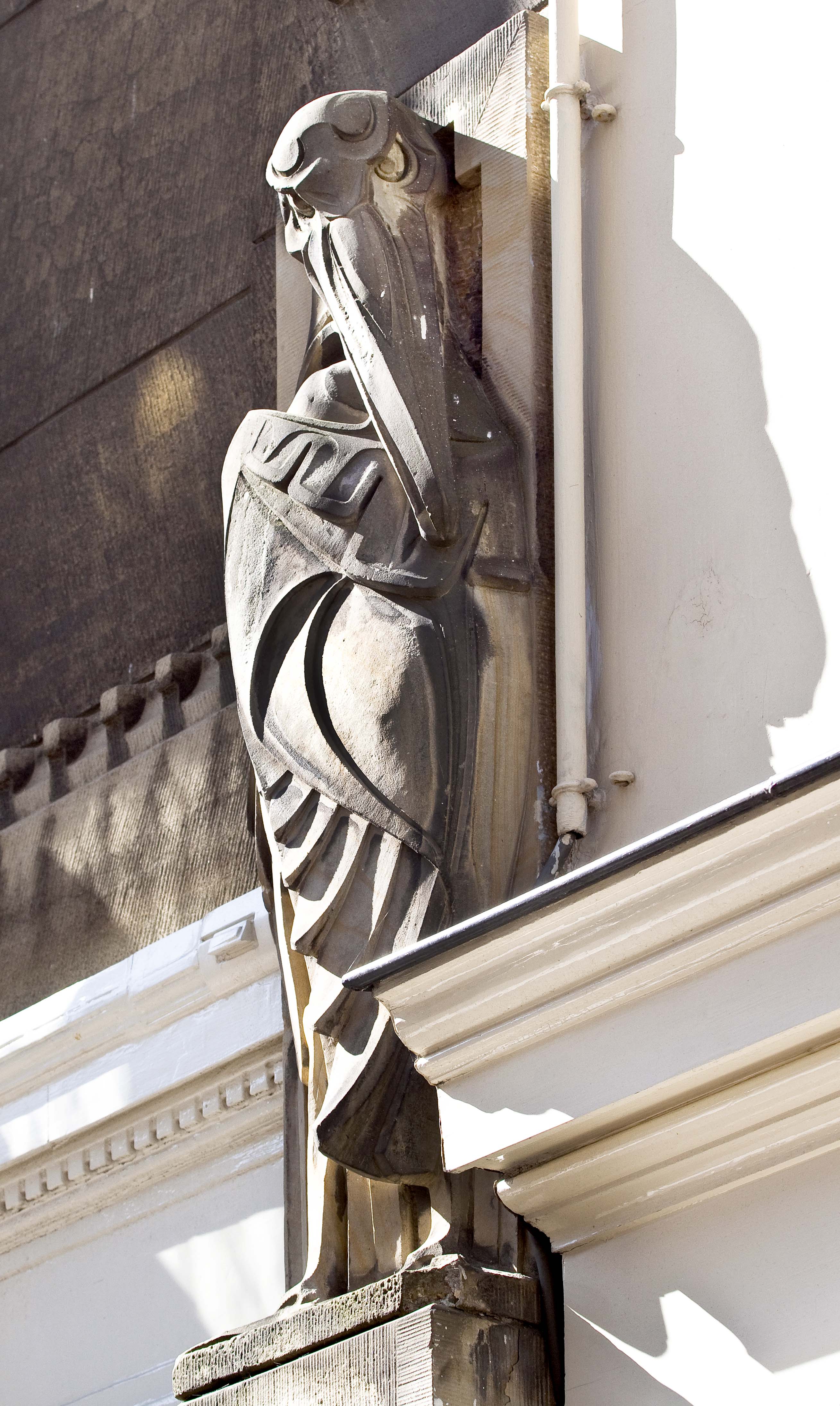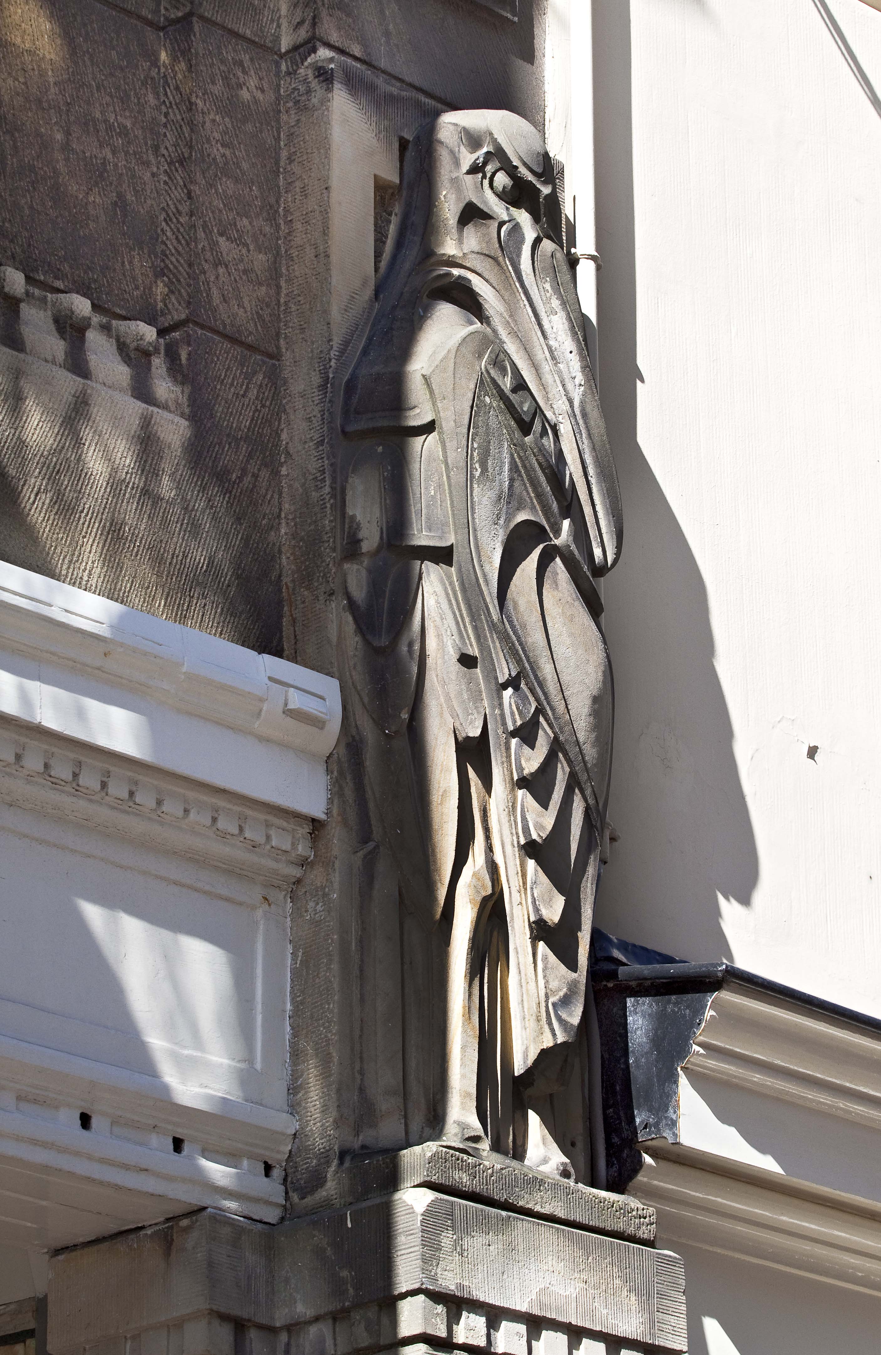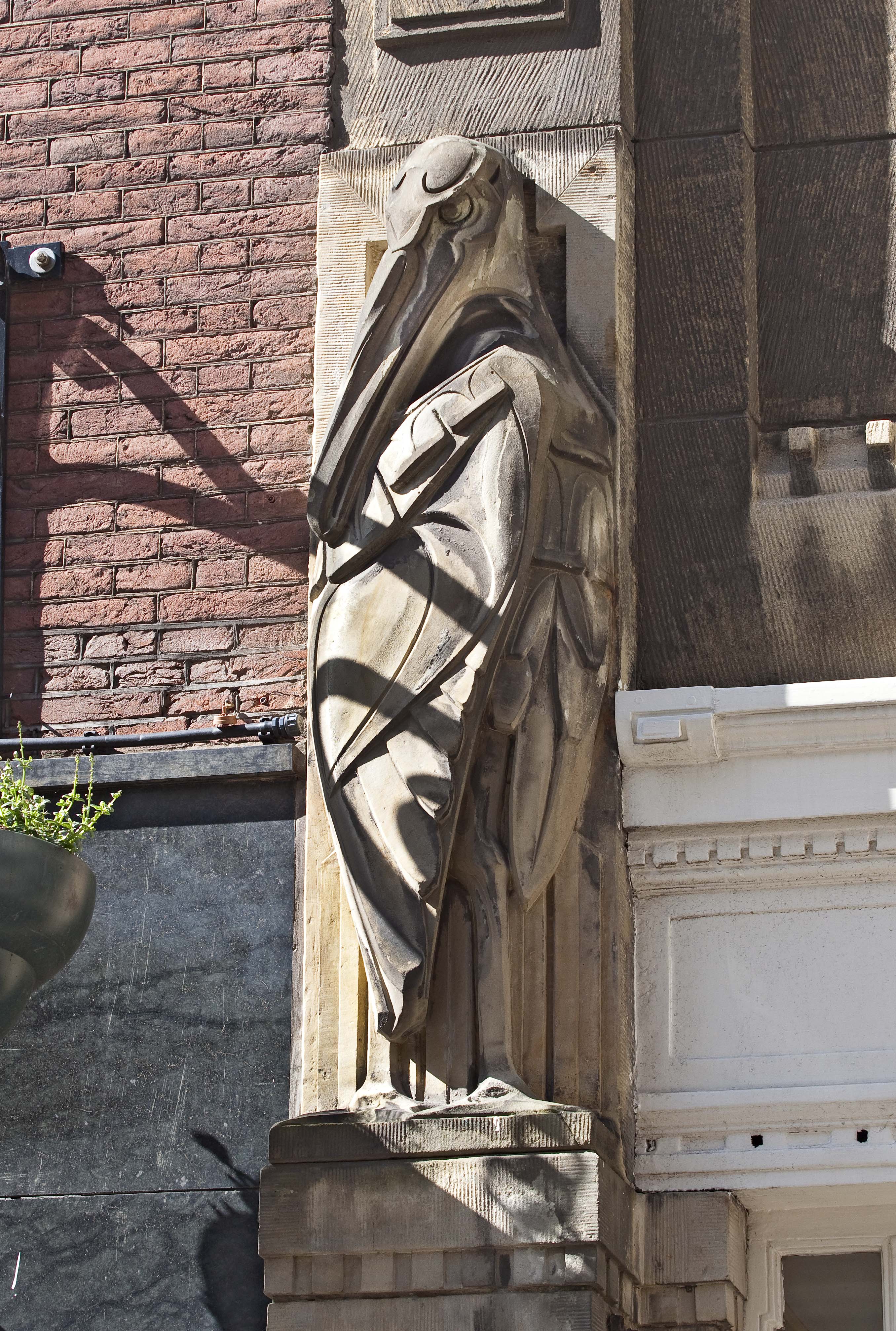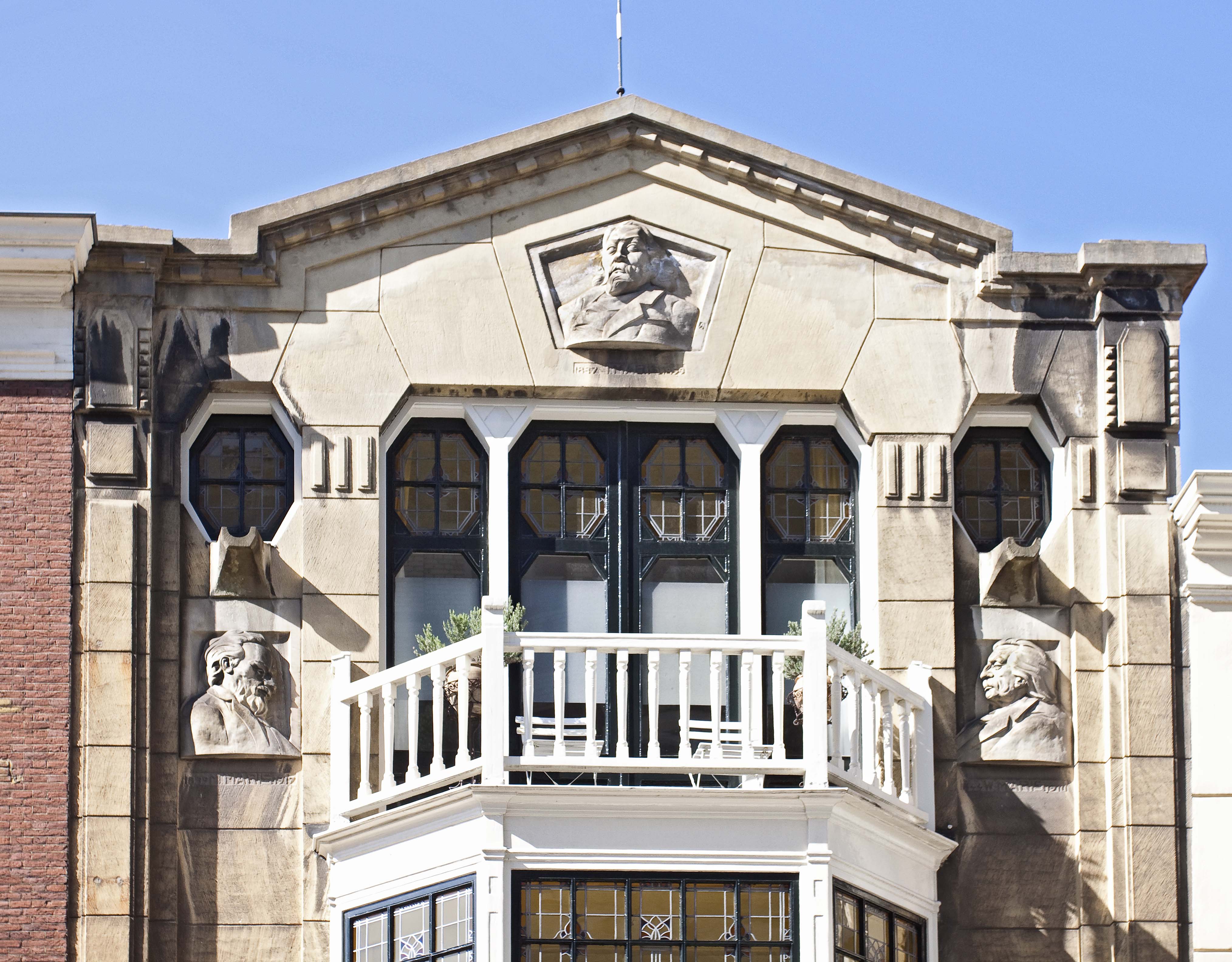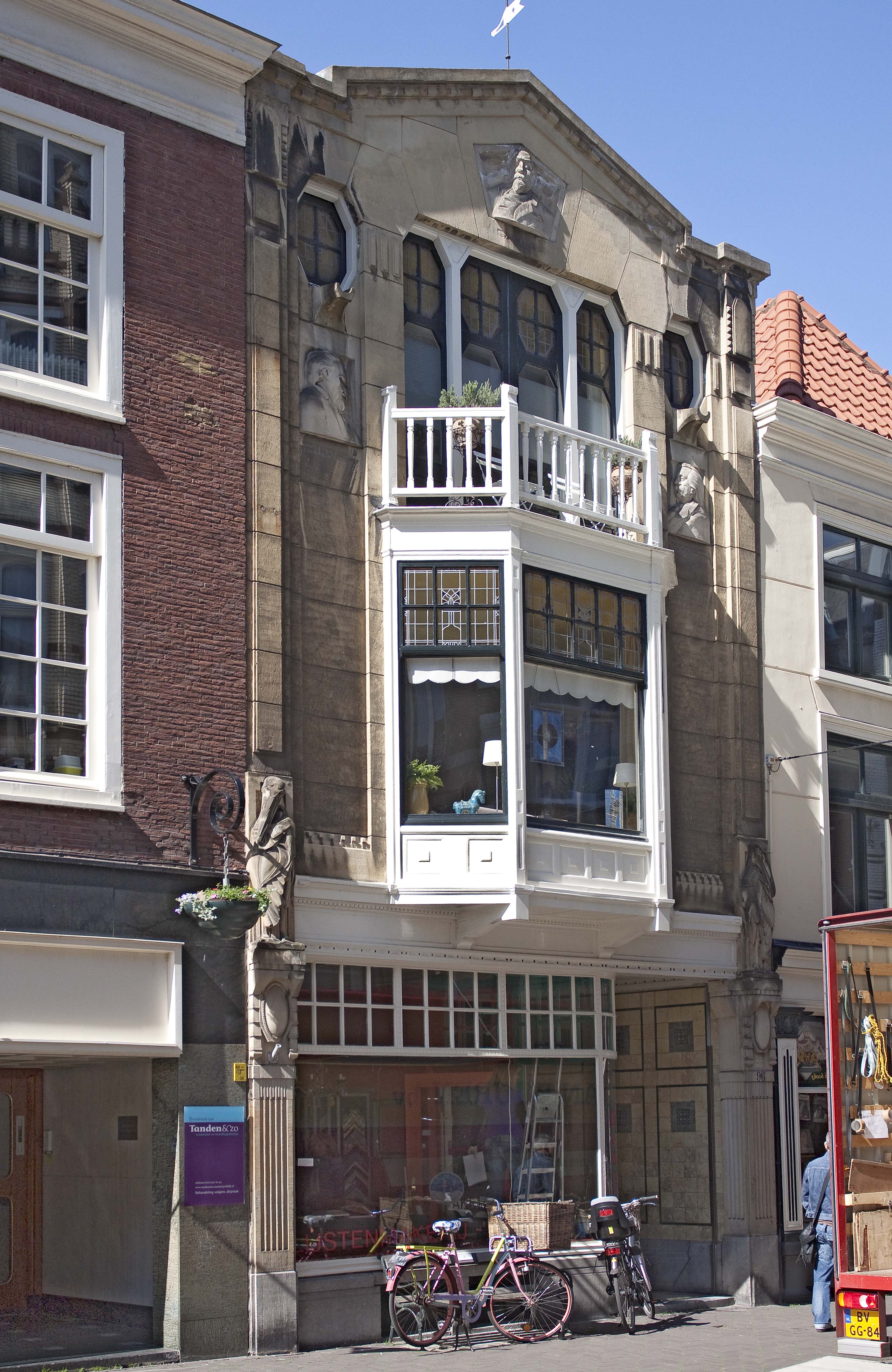 Omschrijving.: Pand op rechthoekige plattegrond bestaande uit kelder en drie bouwlagen. Hoewel het pand van oorsprong 17e eeuws is, werd het in 1916 dermate ingrijpend verbouwd dat van de oude structuur vrijwel niets meer is bewaard gebleven. De met natuursteen beklede voorgevel bezit ornamentiek in de stijl van de "Um-1800 Bewegung". De gevel heeft een tympaanvormige beëindiging en bezit een houten erkeruitbouw tegen de 1e verdieping. De meerhoekige bovenlichten van de balkondeuren op de 2e verdieping en de eveneens meerhoekige vensters zijn voorzien van glas-in-lood. De authentieke winkelpui heeft bovenlichten met kleine roedenverdeling. De natuurstenen pilasters aan weerszijden bezitten een gestileerd medaillon, omgeven door een gestileerde guirlande. Daarboven een fors reliëf in natuursteen van een pelikaan. In de penant is de signering van de architect aangebracht. Een kwartrond gebogen etalageraam vormt de overgang van winkel naar de ingang in het portiek. De rechterzijde van het portiek is bekleed met geglazuurde tegels. Het eveneens door J. Duynstee ontworpen winkelinterieur, geinspireerd op de Lodewijk XVI-stijl is deels bewaard gebleven. De oorspronkelijk in het pand gevestigde kunsthandel D. Sala en Zonen, verkocht veel werk van de Haagse School schilders de gebroeders Jacob, Matthijs en Willem Maris. In 1944 werden in opdracht van deze kunsthandel drie natuurstenen portretrelief van de gebroeders Maris in de voorgevel aangebracht. De reliefs zijn vervaardigd door J. Altorf.