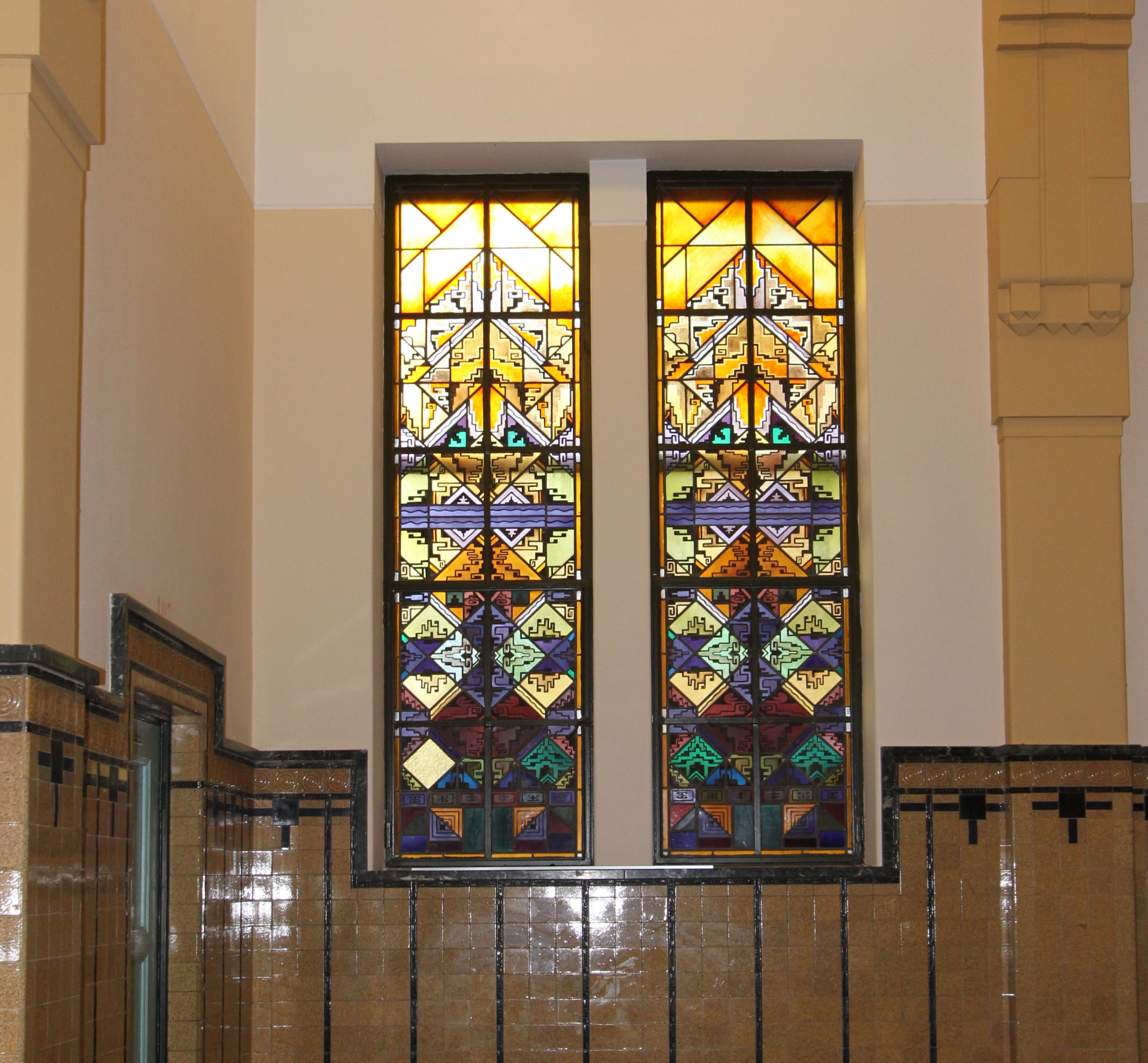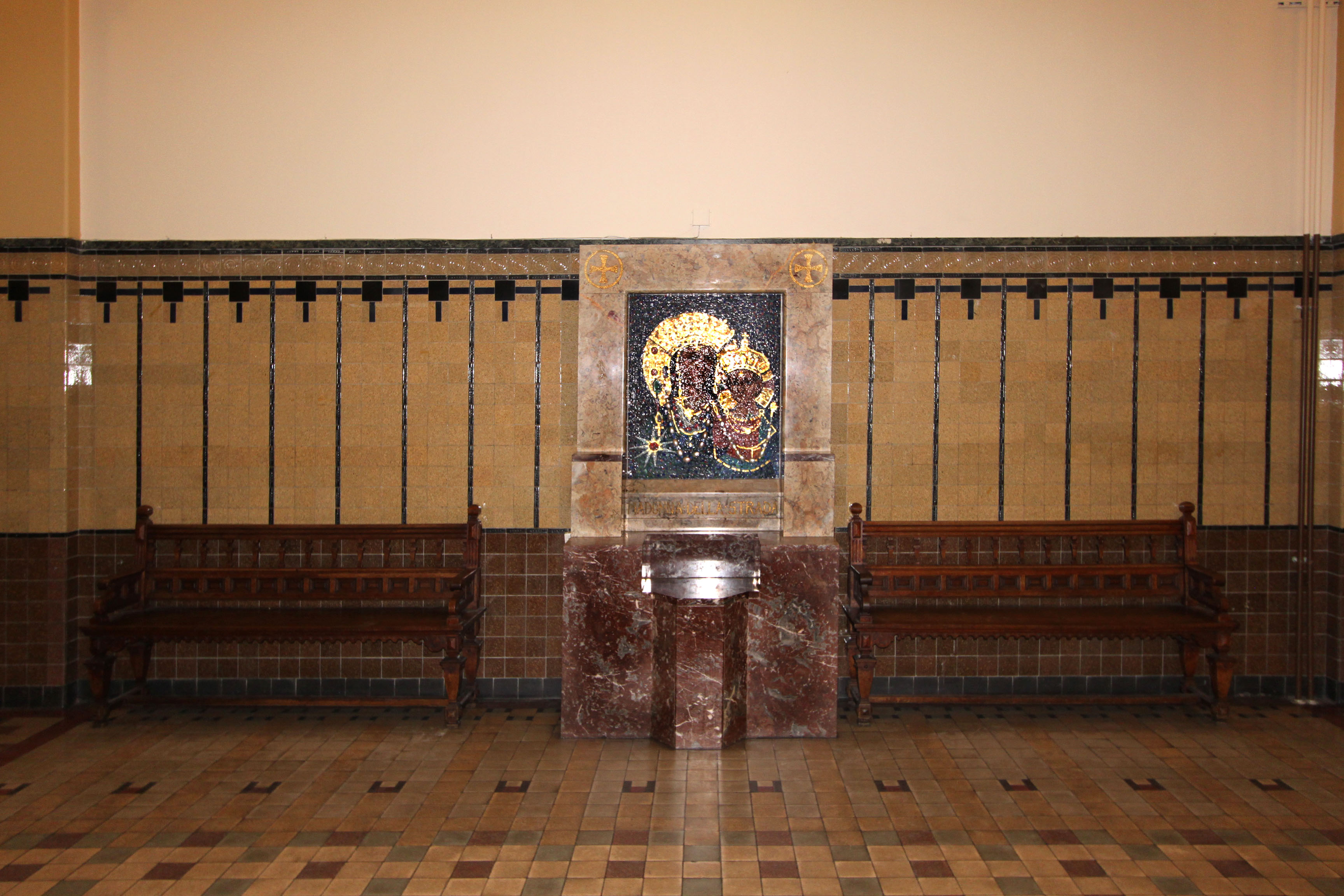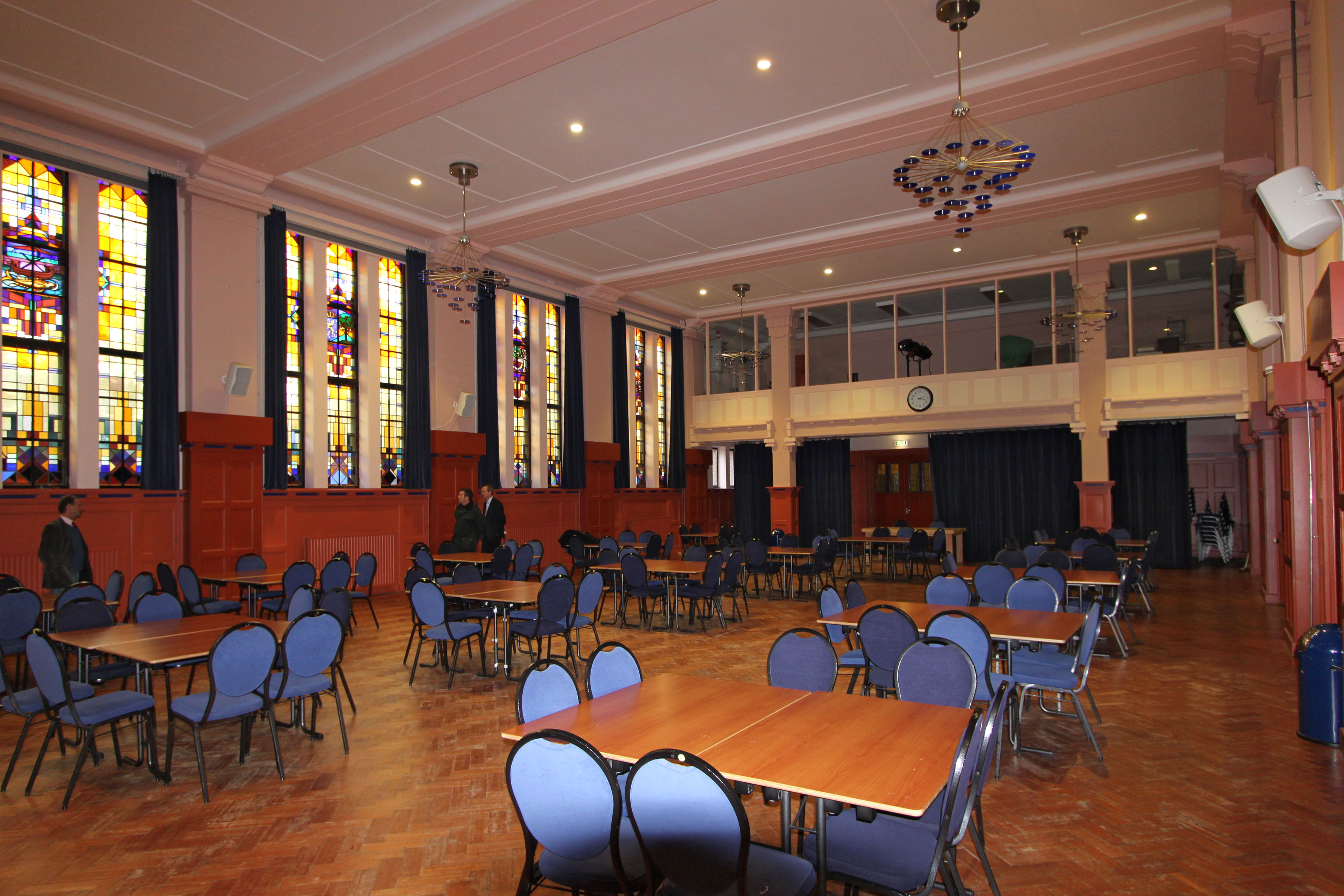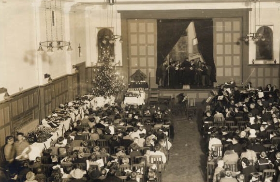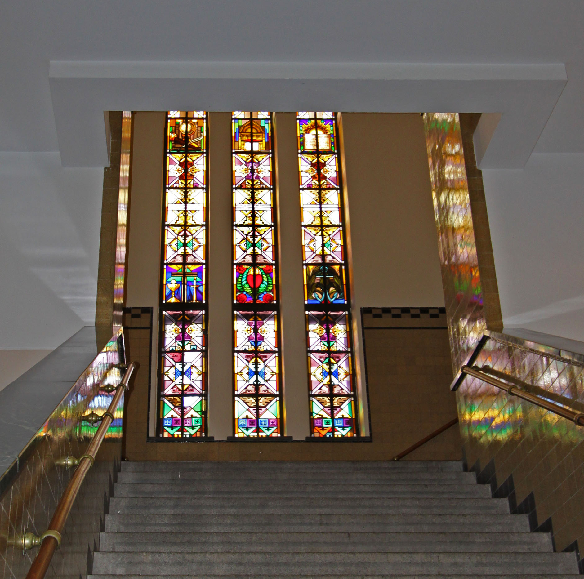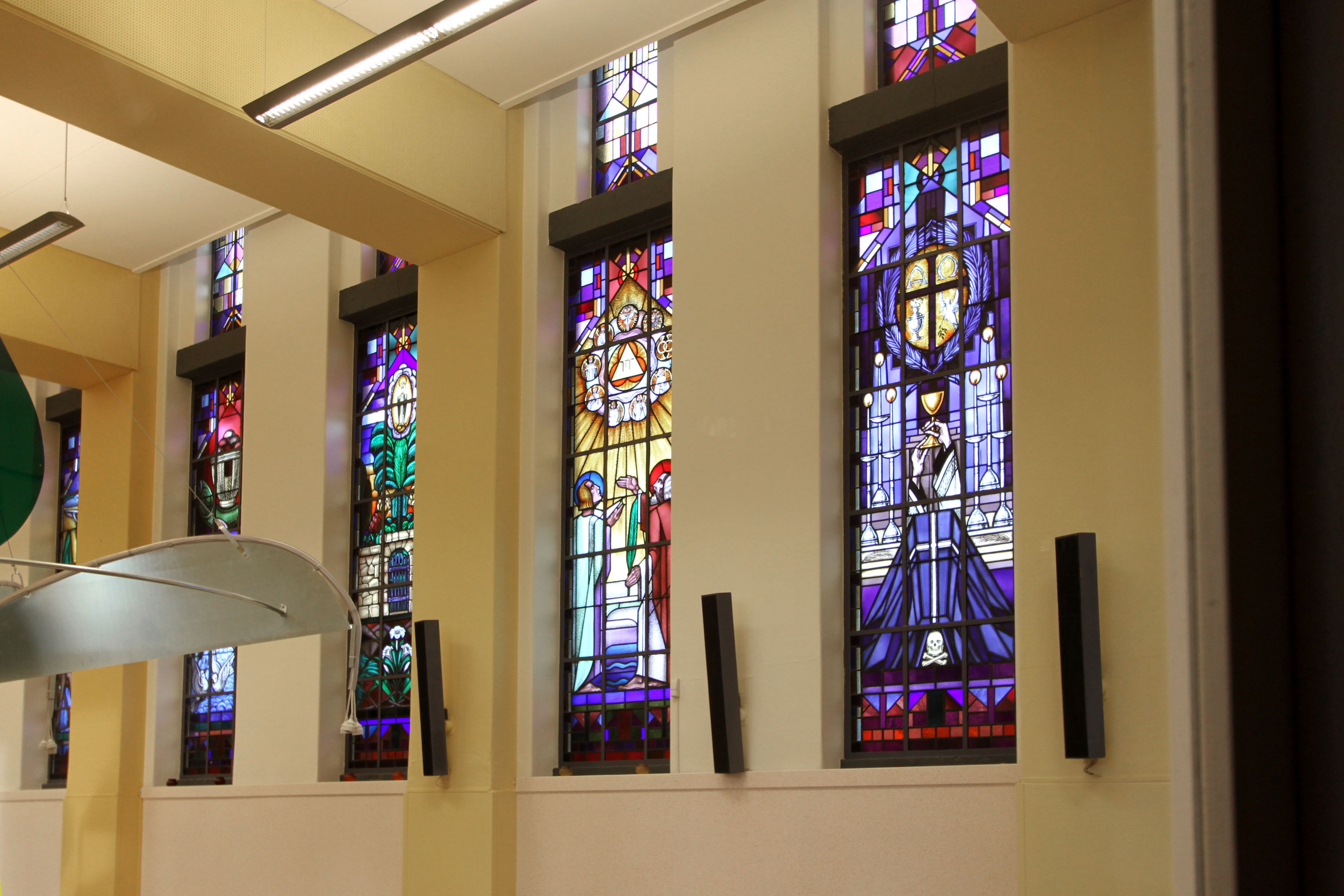 De ingangshal met hoofdtrap is vrijwel geheel in oorspronkelijke staat bewaard gebleven met rijke interieurafwerkingen (onder meer in patronen gelegde vloertegels en houten banken langs de muren waarboven en waarlangs tegelafwerkingen in Art Decostijl). Ook de aula heeft veel nog veel originele afwerkingen waaronder hoge houten paneellambrizeringen. De vroegere kapel is in de loop der tijden ingrijpend verbouwd en sinds circa 1960 niet meer als zodanig in gebruik. Zeer waardevol in deze drie ruimten zijn de grote glas-in-lood ramen, vermoedelijk allen van de glazenier Lou Asperslagh met bijbelse voorstellingen in de kapel en meer ornamentele ramen in de hal en aula.