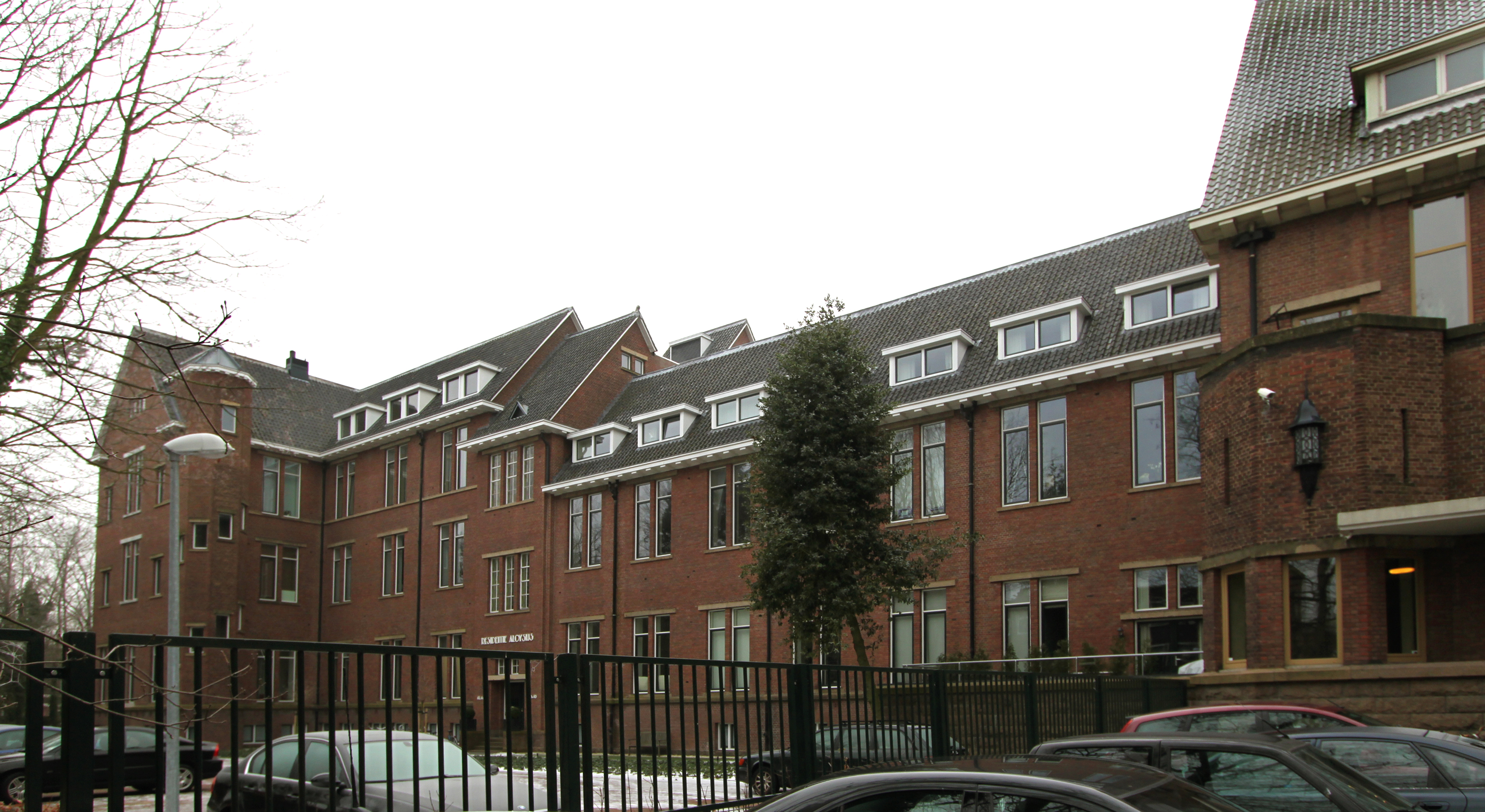 Langs de Oostduinlaan en 't Hoenstraat zijn de gebouwen door een breed terrein van de straat gescheiden door op metselwerk geplaatste ijzeren hekwerken.
