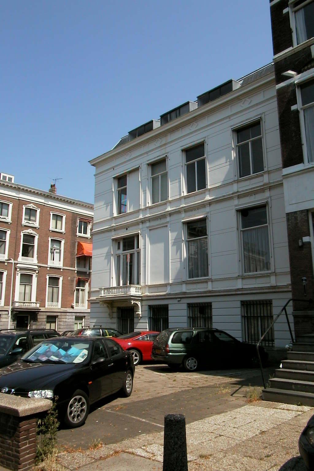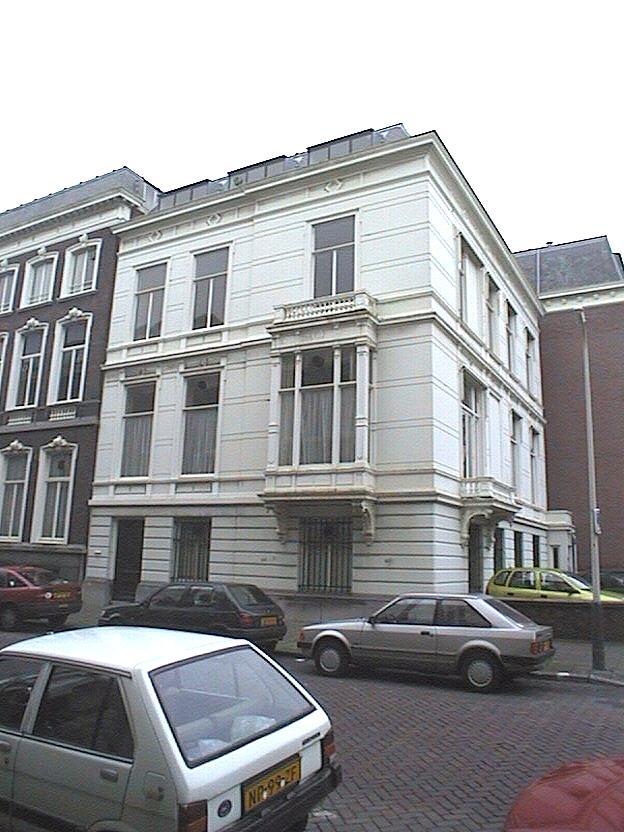 Voormalig herenhuis in eclectische stijl uit omstreeks 1870 op de hoek van de Oranjestraat en de Paleisstraat. Het gepleisterde huis omvat een lage parterre, belétage en verdieping en wordt gedekt door een laag, omlopend schilddak. De lijstgevel aan de Paleisstraat telt vier, die aan de Oranjestraat drie vensterassen, waarvan de rechter breder is en als risaliet behandeld. De parterre vertoont een hardstenen plint en een gebosseerde bepleistering. Aan de Oranjestraatzijde een houten erker op consoles; tegen de gevel aan de Paleisstraat een balkon met balustrade, gedragen door consoles. De parterrevensters bezitten traliewerk.