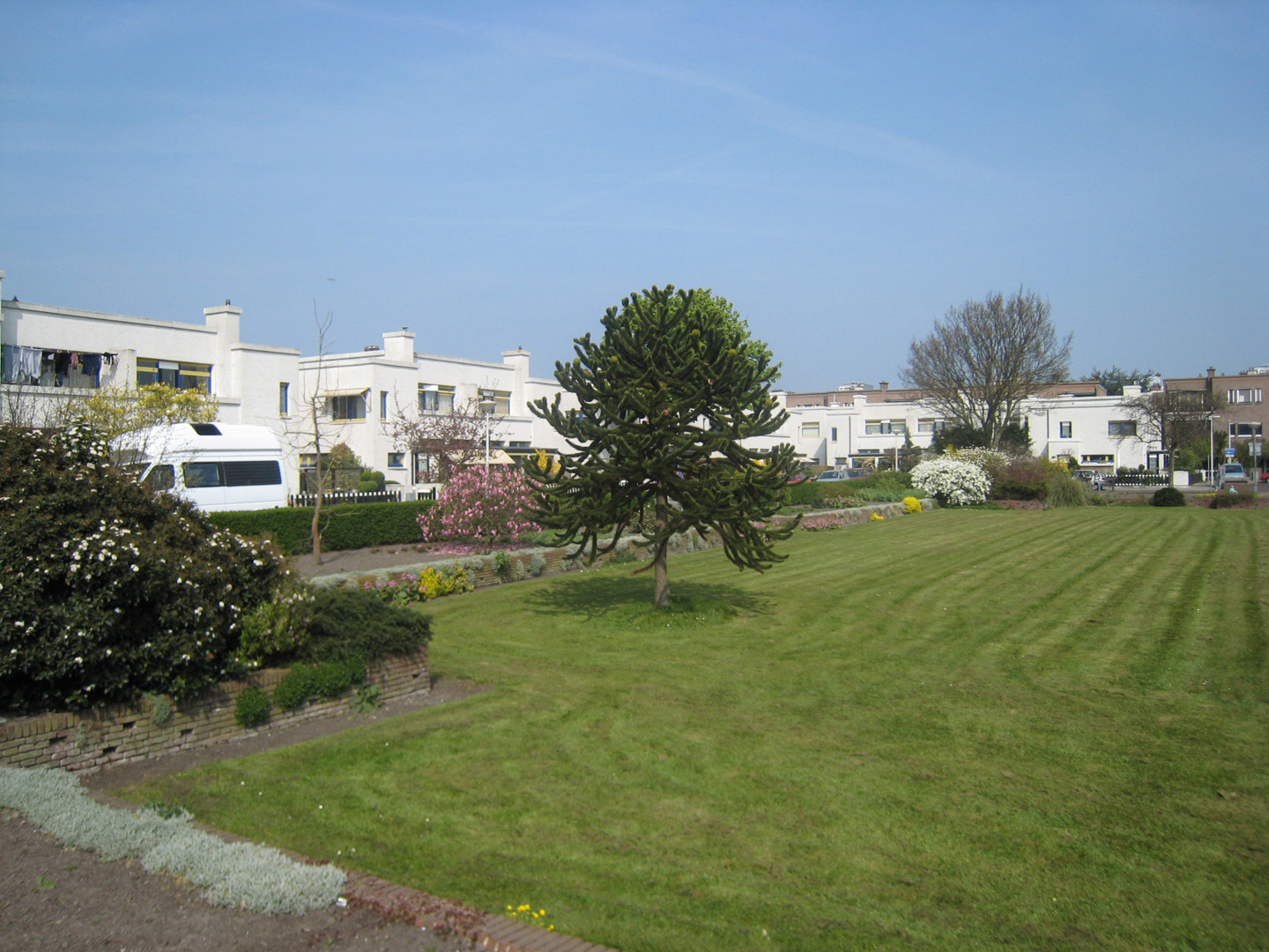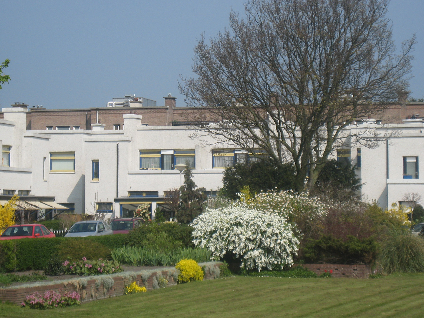 De woningen hebben elk een eigen tuin, omgeven door een houten hek op een lage sokkel tussen blokvormige pijlers van beton; aan de erkers zijn telkens gemetselde bloembakken aangebouwd.