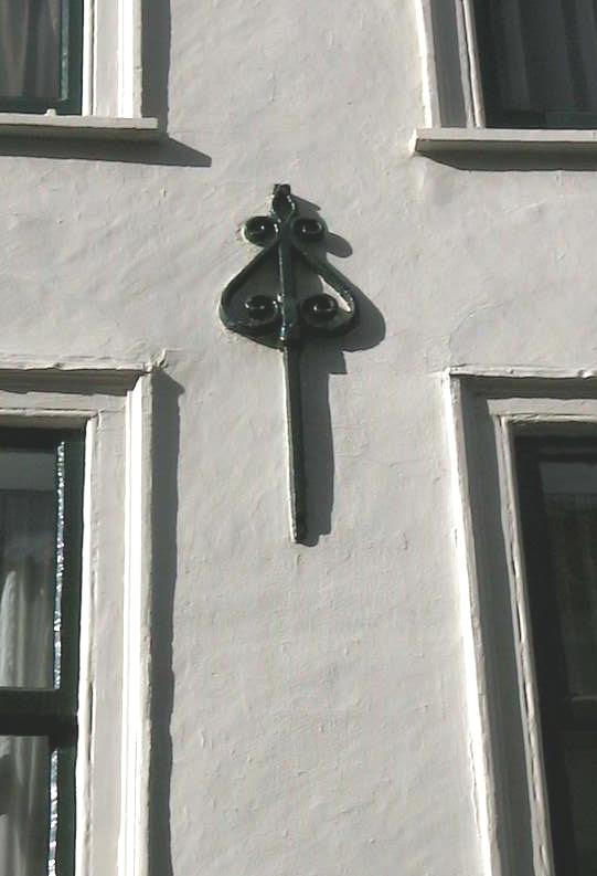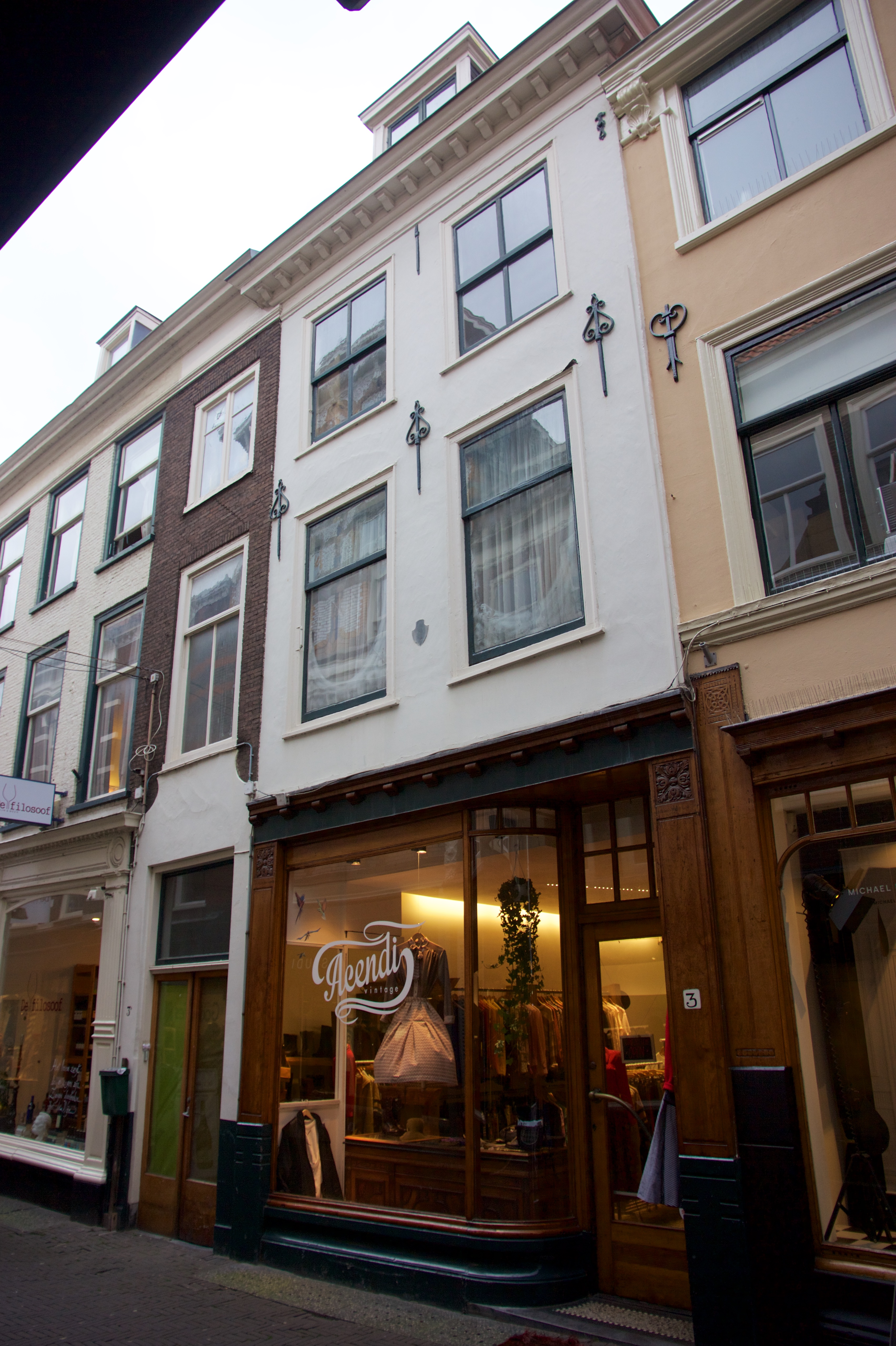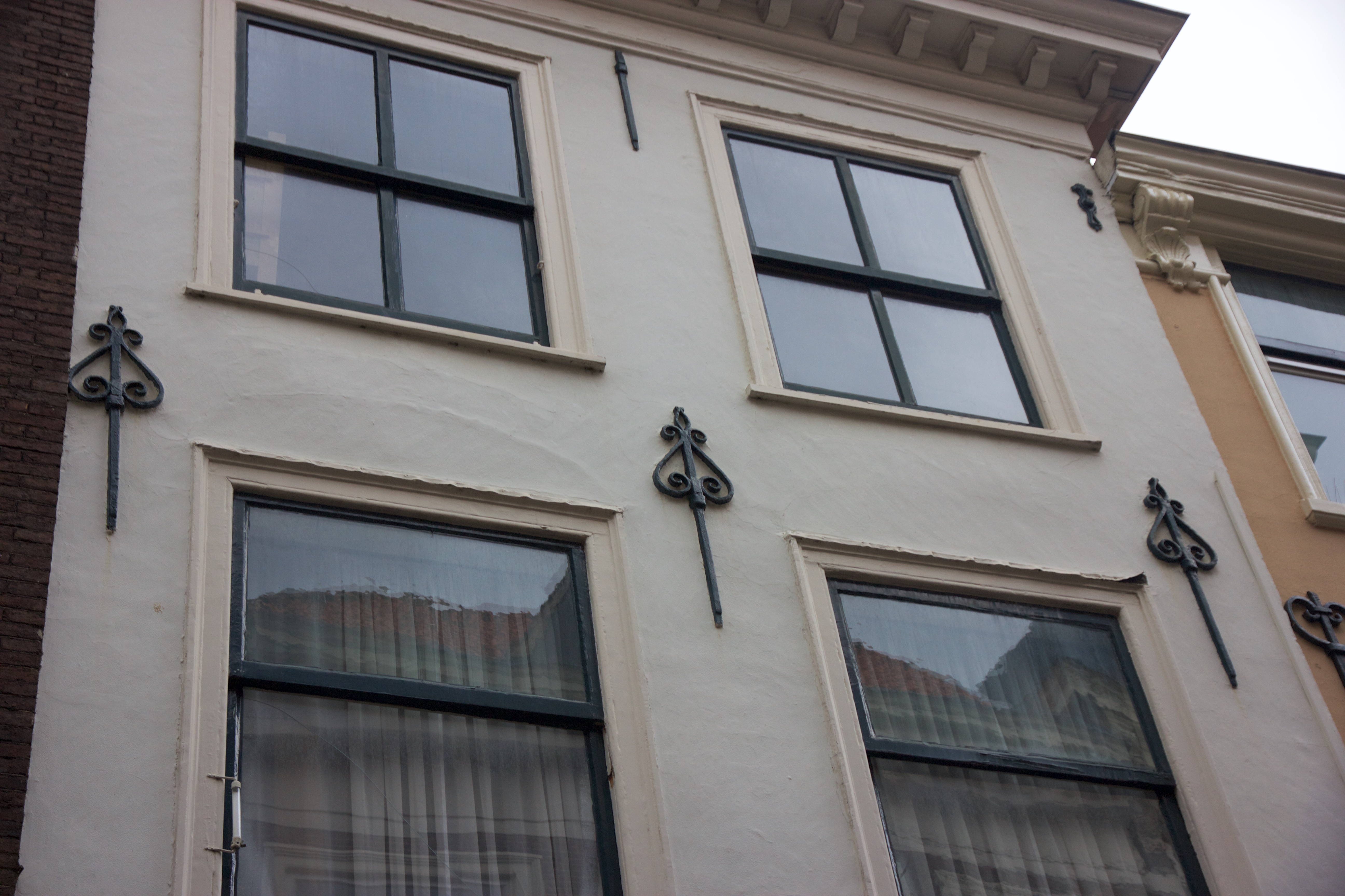 Zeventiende eeuws pand met twee-assige gepleisterde lijstgevel van negentiende-eeuws karakter, bestaande uit parterre en twee verdiepingen. Winkelpui uit ca. 1915 met kroonlijstje op klossen. Vensters met geprofileerde houten omlijstingen en dorpels. Vier zeventiende eeuwse muur- ankers. Recht hoofdgestel met klossen.
