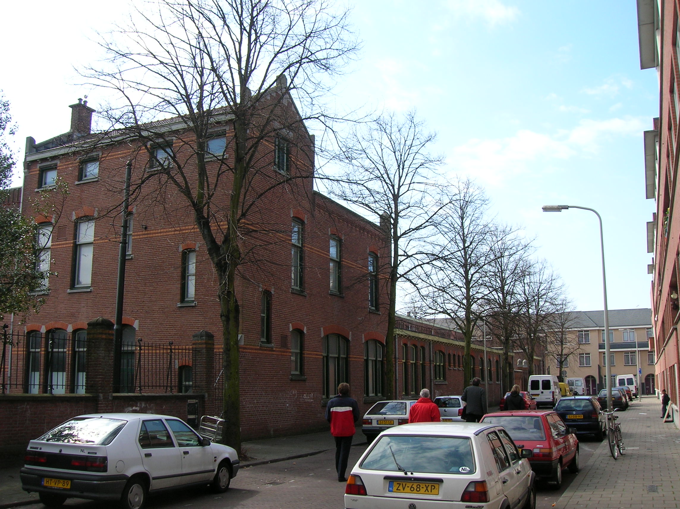 PEKELREMISE EN WERKPLAATS. Vrijstaande, plat afgedekte, pekelremise ter lengte van vijf vensterassen en met afgeschuinde zijde op de zuidhoek; alle gevels voorzien van getoogde vensters met kleine stalen onderverdeling, in de lange en korte gevel aan de binnenplaats twee dubbele inrijdeuren in dezelfde trant als die van het remisegebouw, alsmede een aanbouw, in oorsprong bestemd als paardestal en andere dienstruimten, deels met gewijzigde gevel, doch met rechts de oorspronkelijke ingangsdeur.