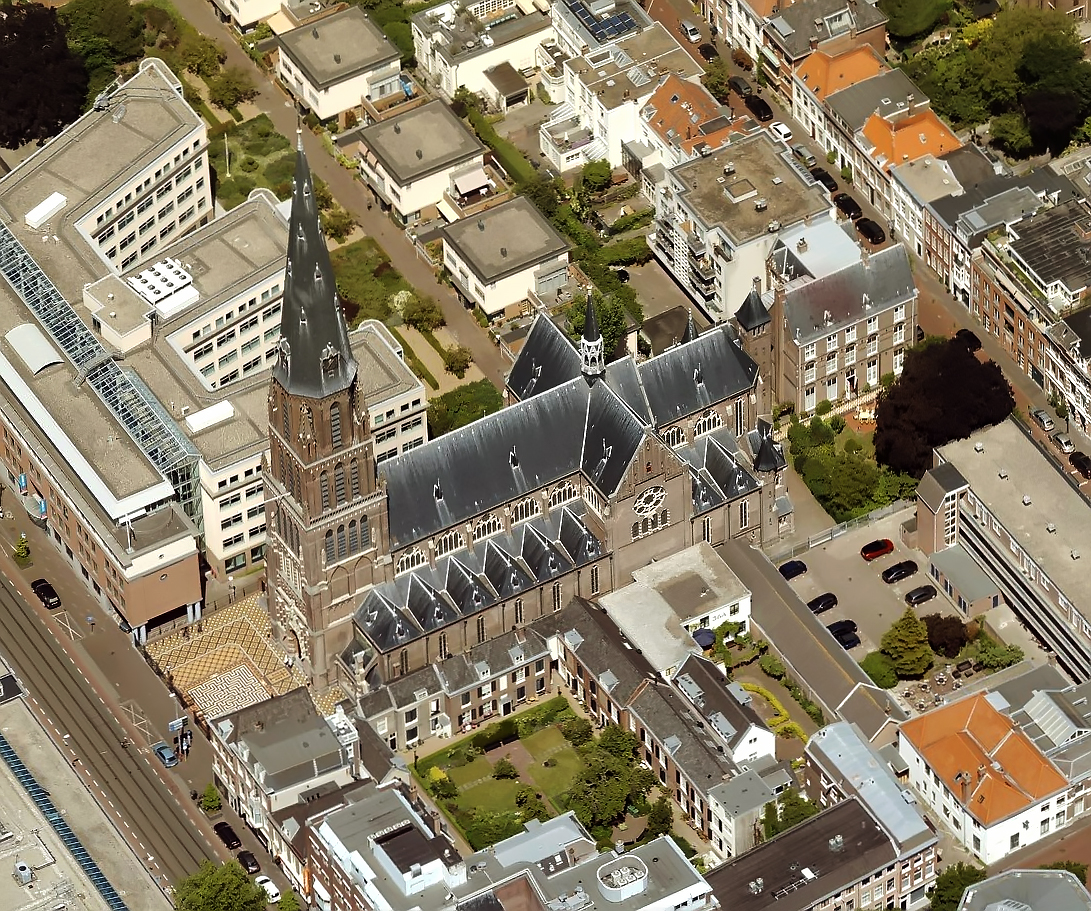 R.K. KERK van de H. Jacobus de Meerdere gebouwd in 1875-1878 naar ontwerp van P.J.H. Cuypers in neogotische stijl; smeedijzeren hek met sierlantaarns aan de Parkstraat.