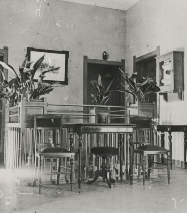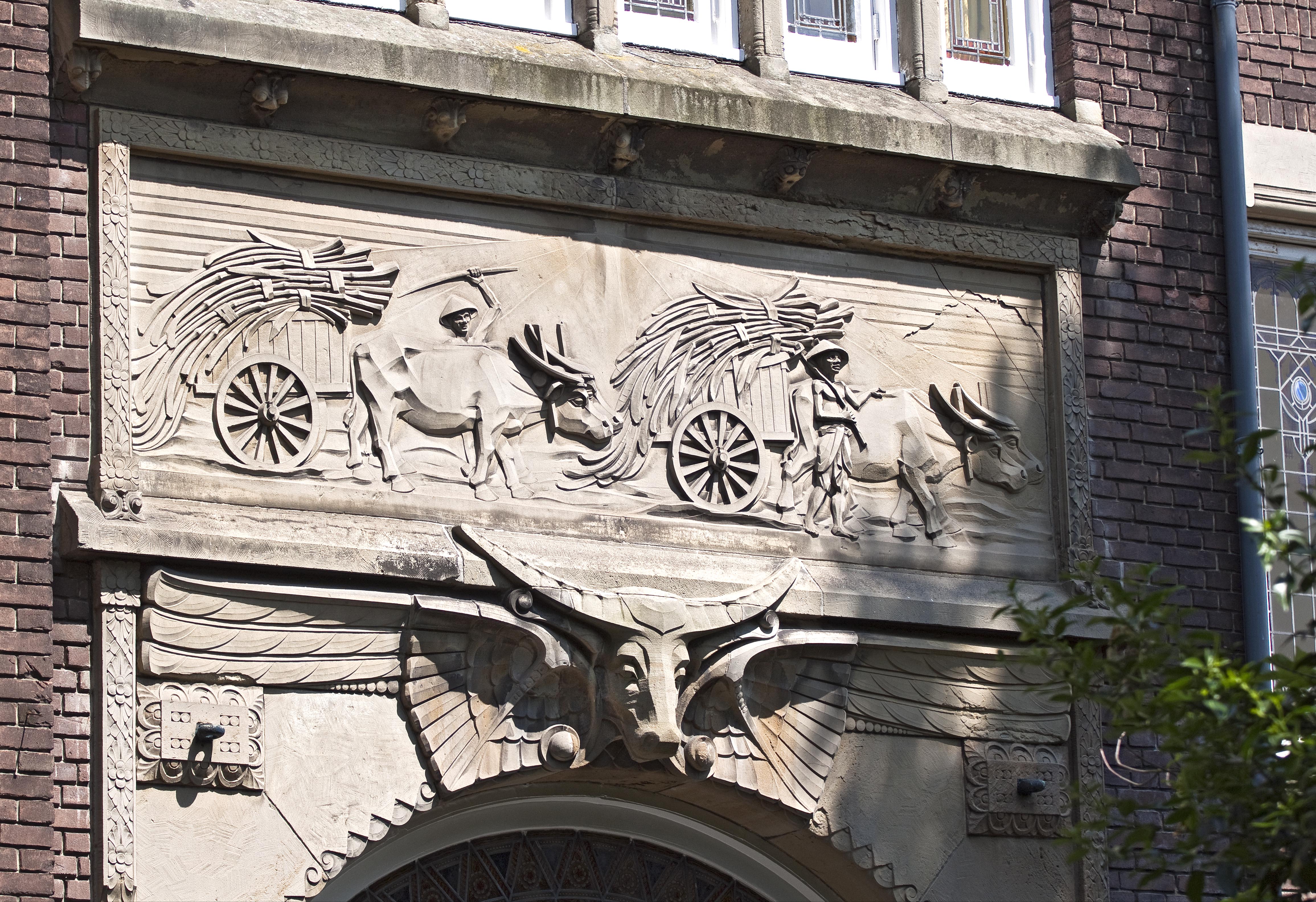 De ingangspartij omvat een deur in een getoogde omlijsting, waarin opgenomen een gebrandschilderd glas-in-lood met voorstelling van Wajangpoppen en als sluitsteen een gevleugelde karbouwenkop. Hierboven een reliëf, waarop een transport van suikerriet op door karbouwen getrokken wagens is afgebeeld. Deze sculpturen zijn vervaardigd door F. V. Broese van Groenou.