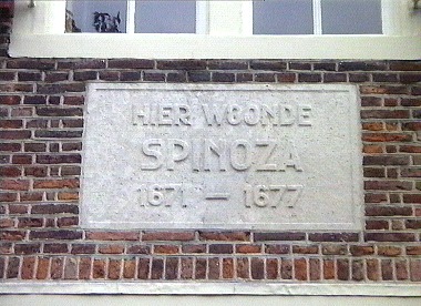 Pand met 17e eeuws ingezwenkte, recht afgedekte halsgevel. Sterfhuis van Spinoza.