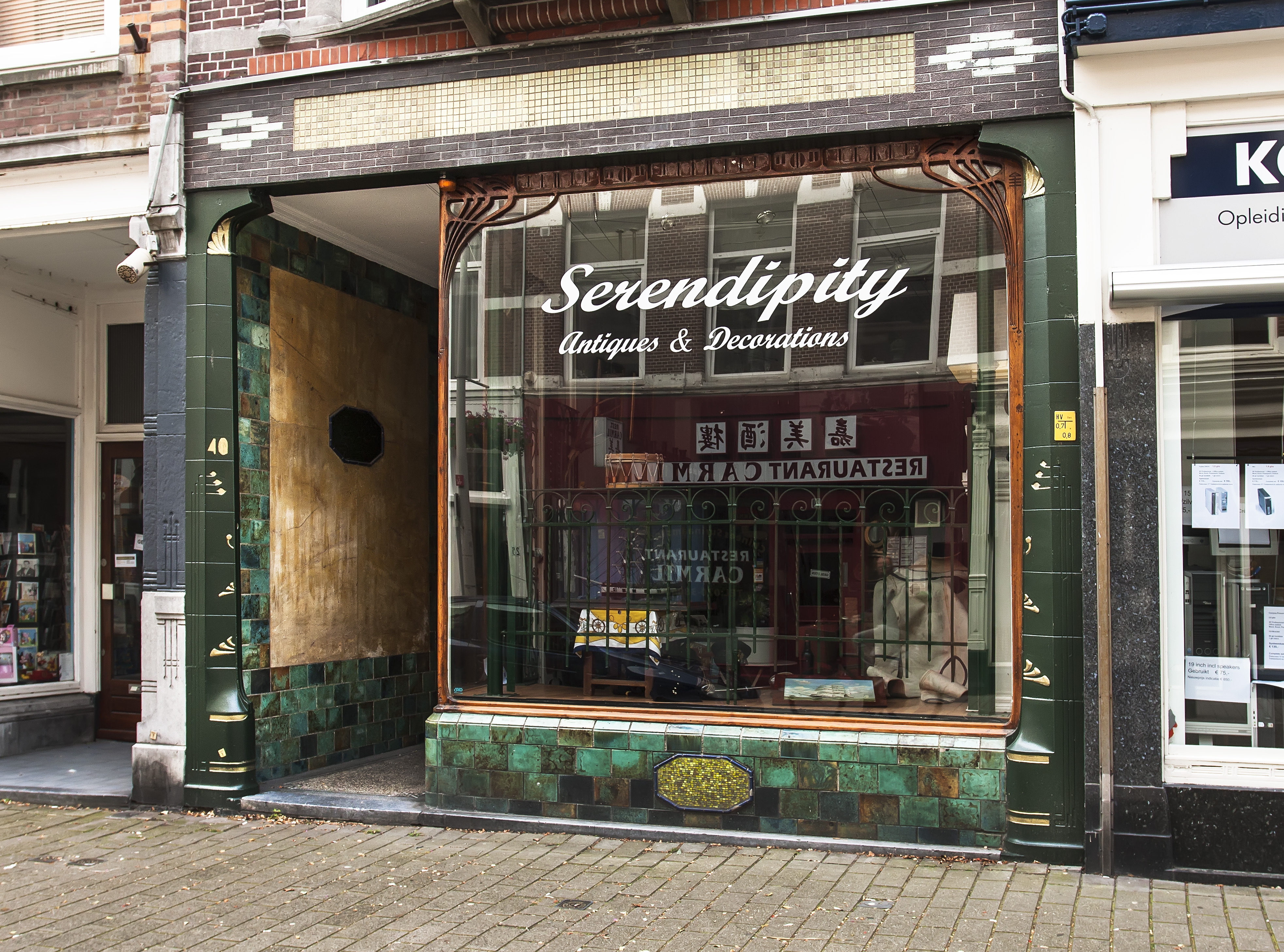 In contrast tot de sober uitgevoerde achtergevel staat de rijk versierde voorgevel aan de Piet Heinstraat. De bakstenen lijstgevel bezit één brede vensteras en heeft een kroonlijst met art-nouveauconsoles. De opvallende dakkapel bezit opengewerkte wangen in deze decoratieve stijl. De eerste verdieping heeft een ondiepe driezijdige erker met bovenlichten voorzien van decoratief uitgevoerde roedeverdeling. Bijzonder rijk uitgevoerd is de winkelpui in art nouveau met diep gelegen portiek. Het gelakt houten kozijn van de etalageruit heeft aan de bovenzijde rijk gesneden houten art-nouveaudecoraties. In het portiek ligt een granitovloer en de bovenzijde wordt beëindigd met een stukplafond voorzien van lijstwerk. Het opvallend gekleurde tegelwerk in het portiek, de borstwering onder de etalage en op de puibalk dateren vermoedelijk uit de jaren twintig van de vorige eeuw en zijn kenmerkend voor de art deco die in die tijd gangbaar was.