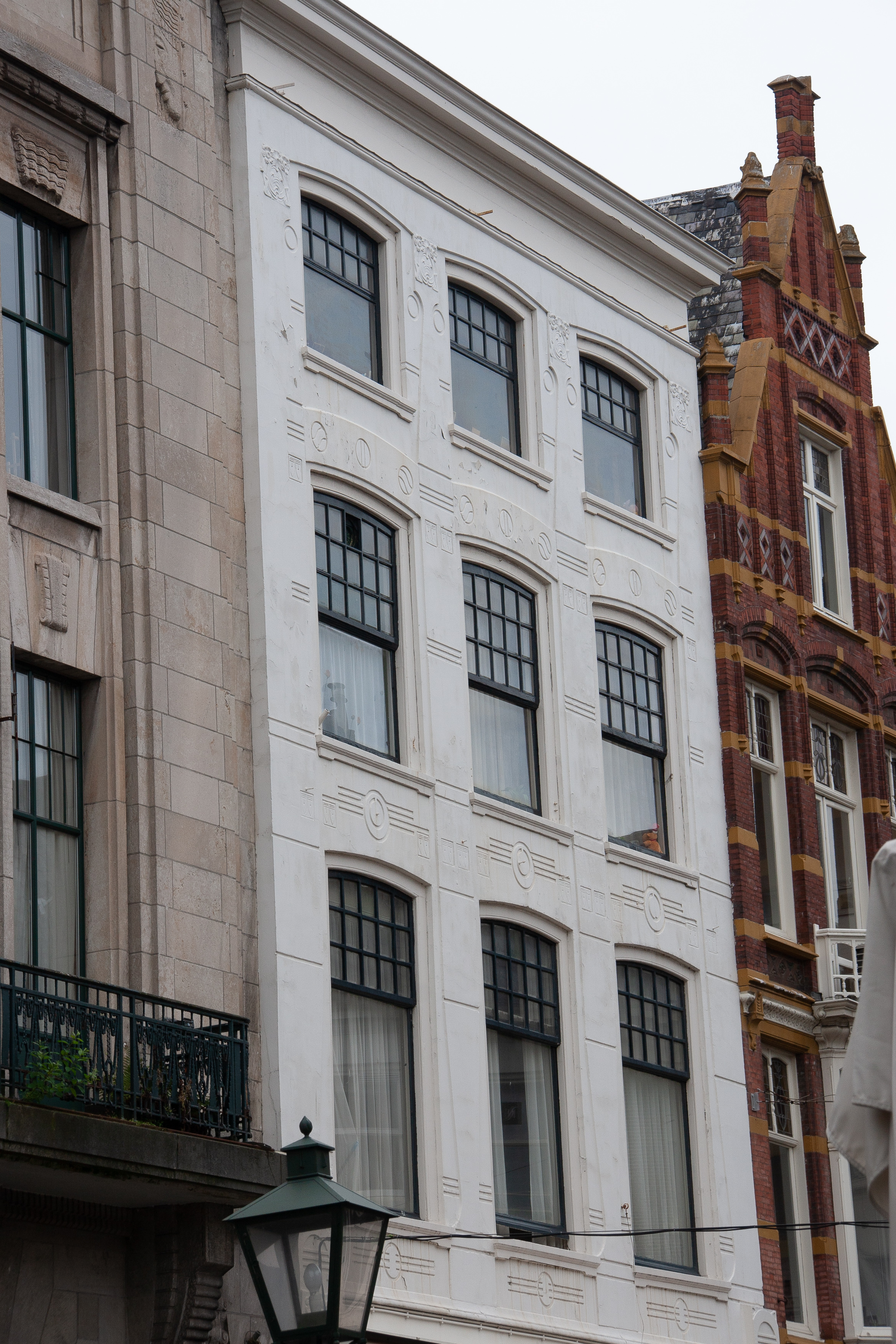 Van oorsprong ten minste achttiende-eeuws pand bestaande uit een voorhuis en twee achterhuizen gescheiden door binnenplaatsen of lichthoven. Het pand is grotendeels onderkelderd.