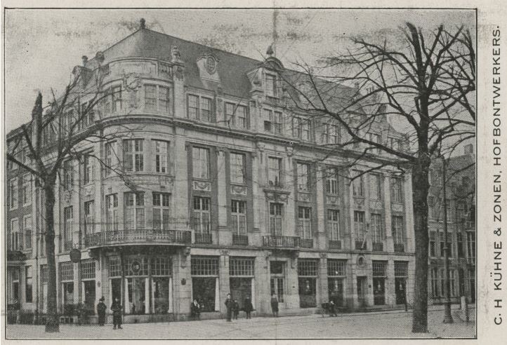 Winkelpand op de hoek van de Kneuterdijk en de Plaats in de stijl van de "Um Achtzehnhundert Bewegung", gebouwd in 1908 naar ontwerp van de architecten Johan Mutters Jr. en J.J. Gort, in oorsprong bestemd als modemagazijn Kuhne.