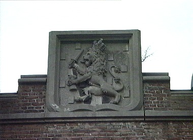 Boven de poort zijn eveneens kantelen waaronder een hardstenen lijst en een gebeeldhouwd wapenschild met de Nederlandse leeuw is aangebracht.