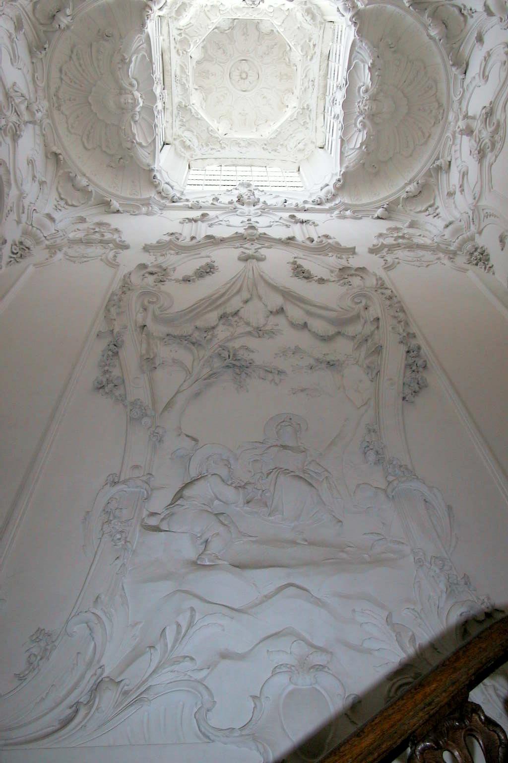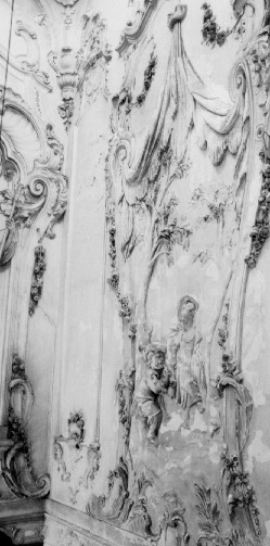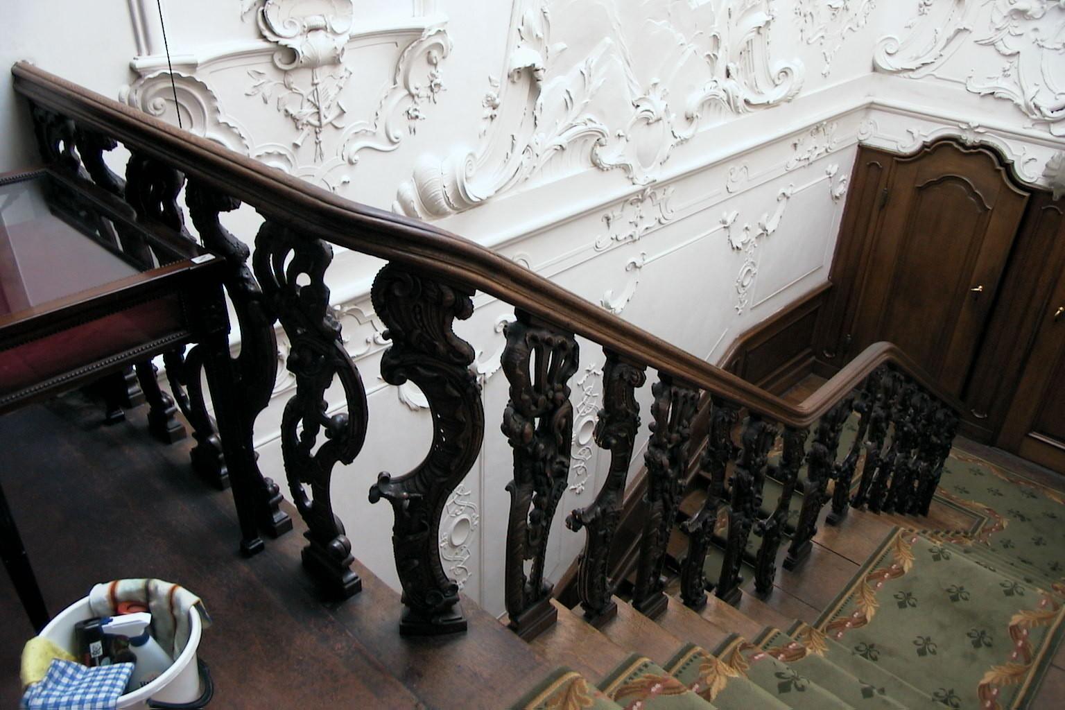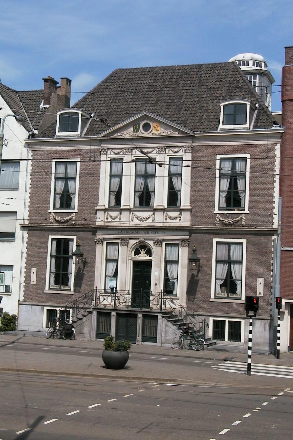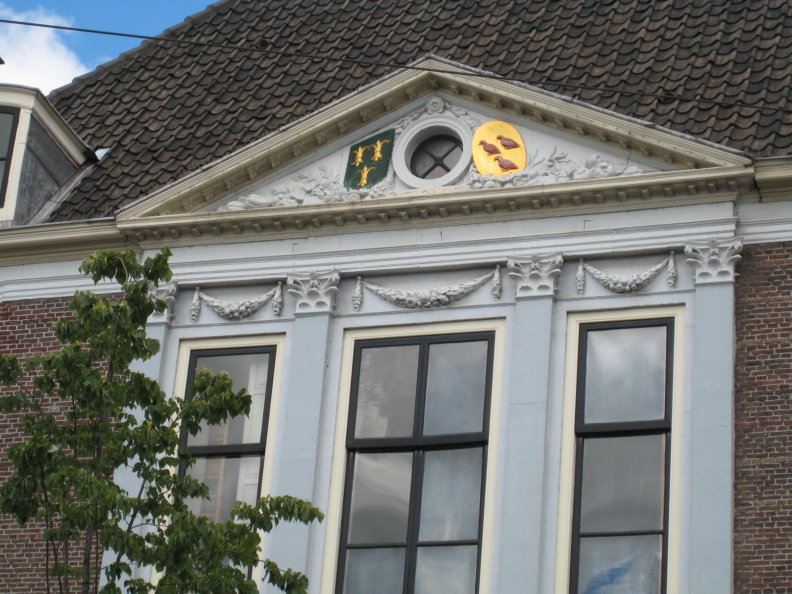 Pand met gepleisterde bakstenen gevel uit plm 1650 op hardstenen plint - stoep - rijk versierde middenpartij - zeer belangrijke 18e eeuwse interieurs.