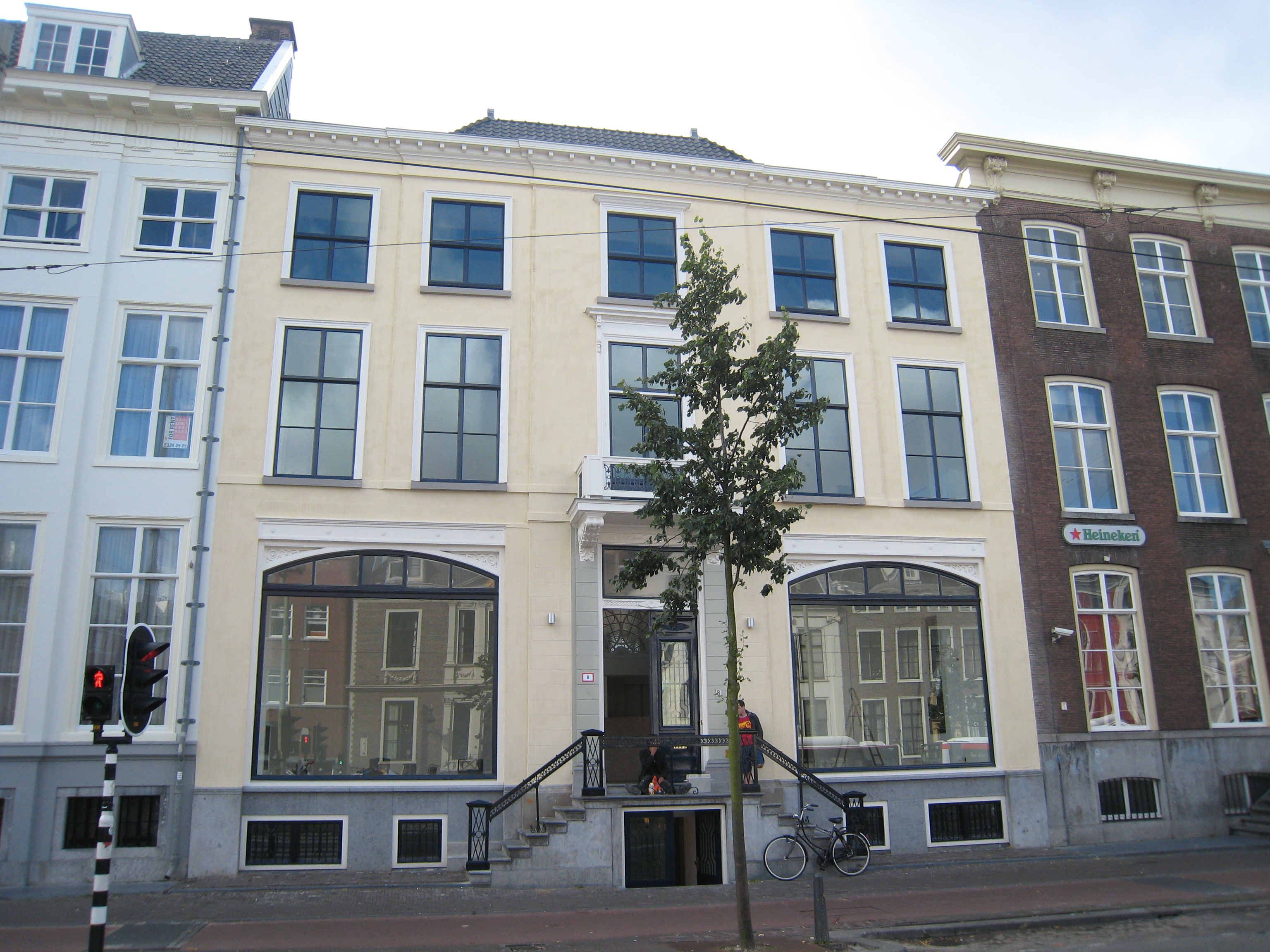Pand met 19e eeuwse gevel met rechte kroonlijst en hardstenen stoep.