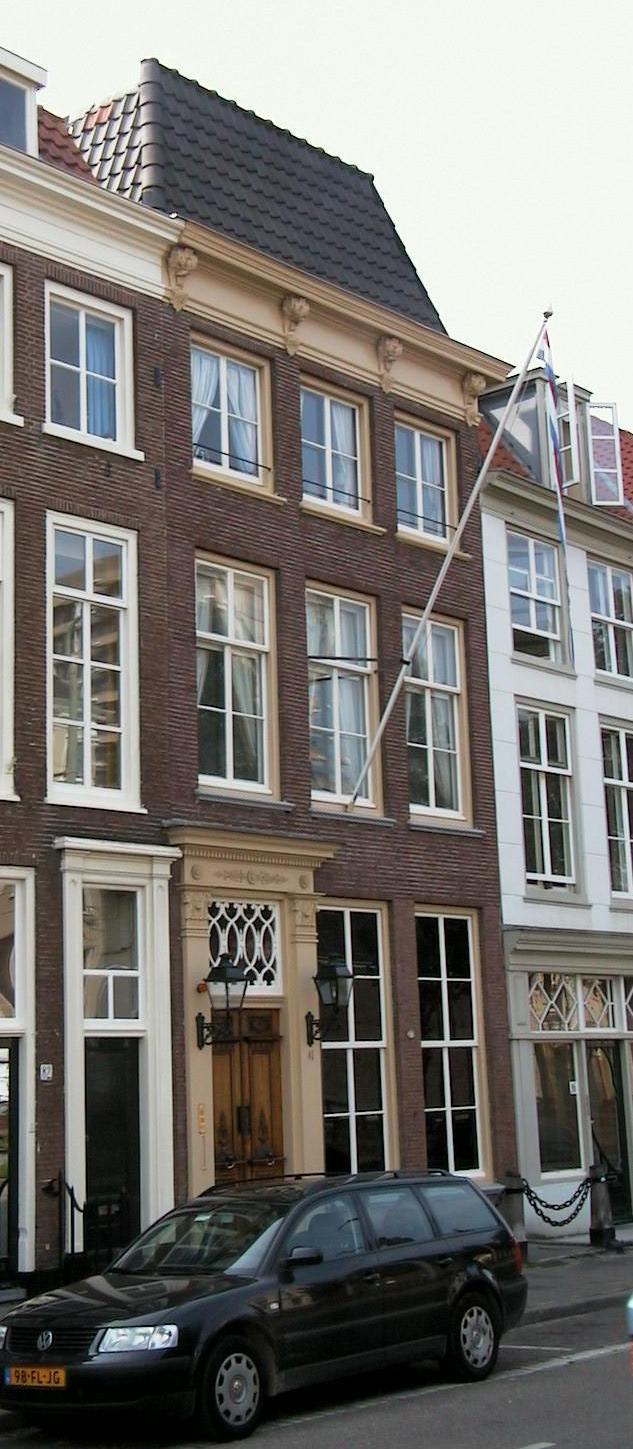 Pand met midden 18e eeuwse gevel met kroonlijst op gesneden consoles, vroeg 19e eeuwse deuromlijsting.