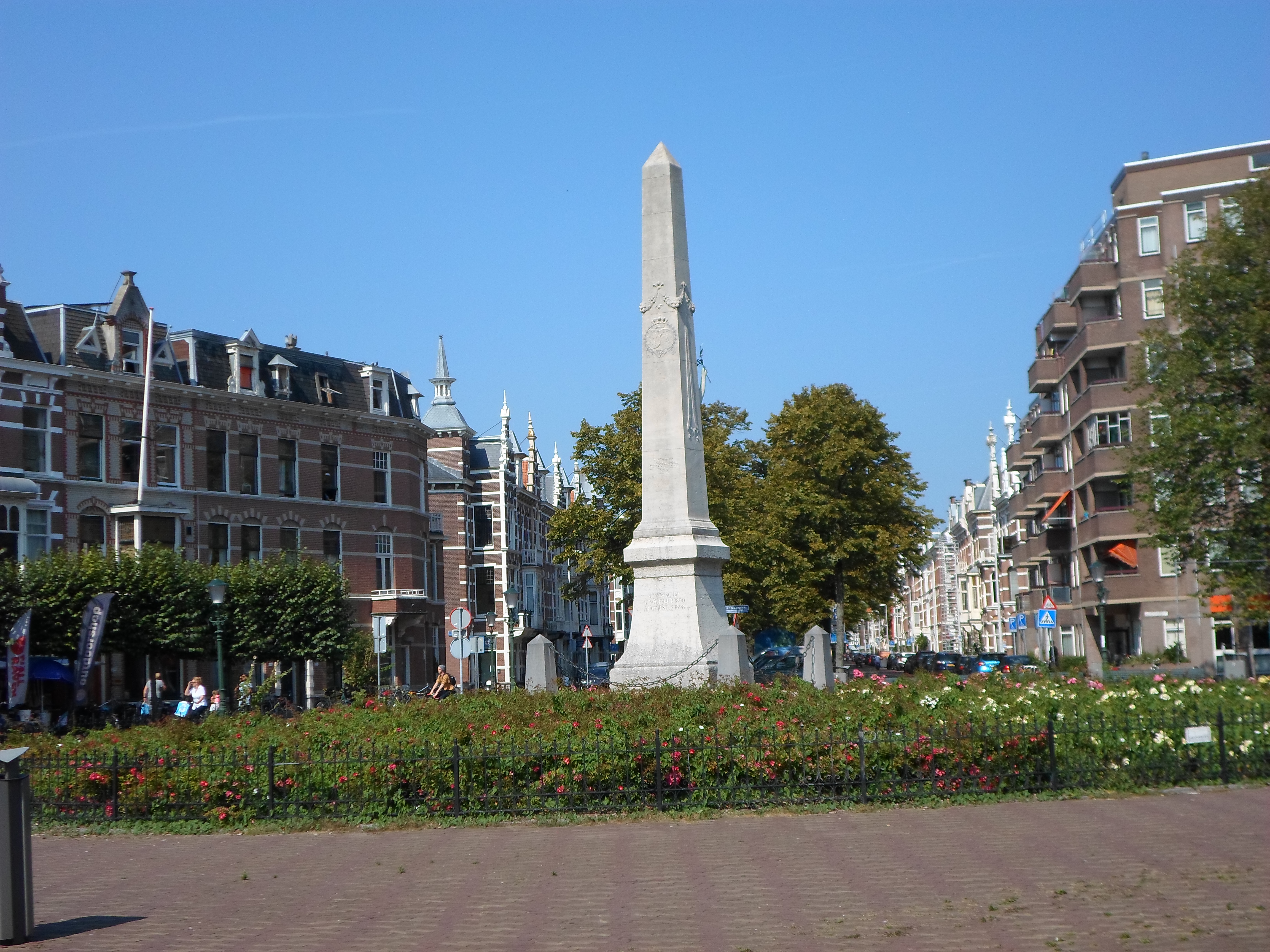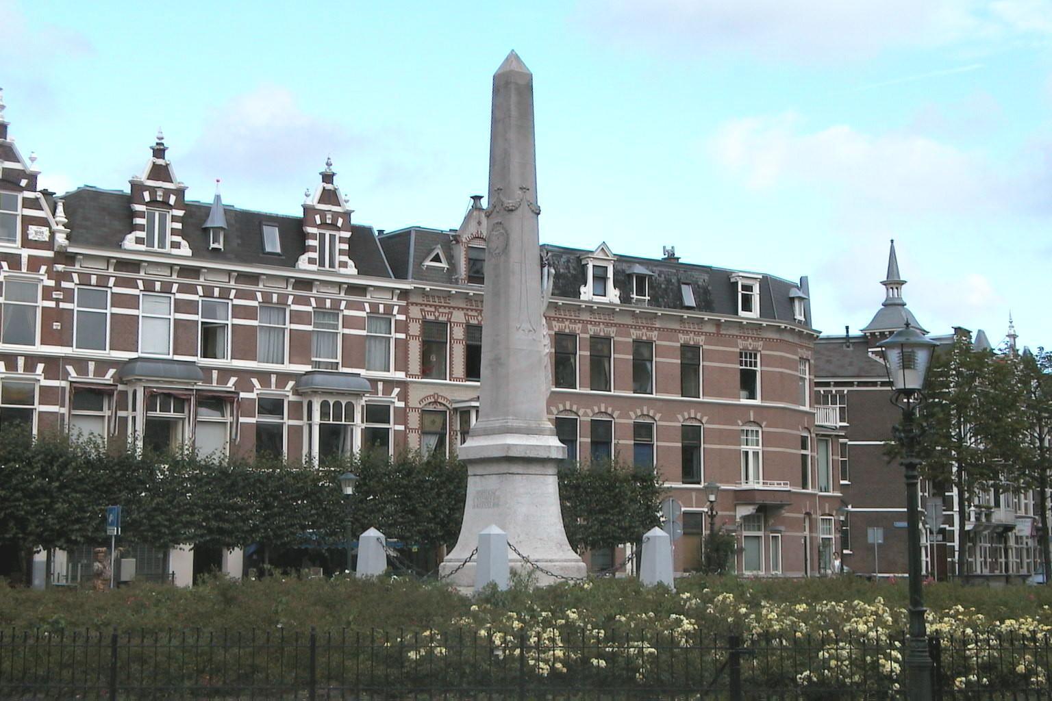 Natuurstenen obelisk, geplaatst op een verhoging in het midden van een plantsoen dat oorspronkelijk omgeven werd door een smeedijzeren sierhek.