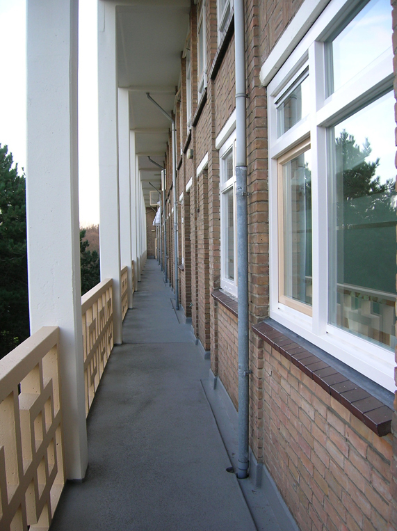 Complex bestaande uit vier, tussen binnentuinen gesitueerde langwerpige woonflats in traditionele vormgeving uit 1954 naar ontwerp van de architecten Joh. A. Schothorst en H. Musegaas.