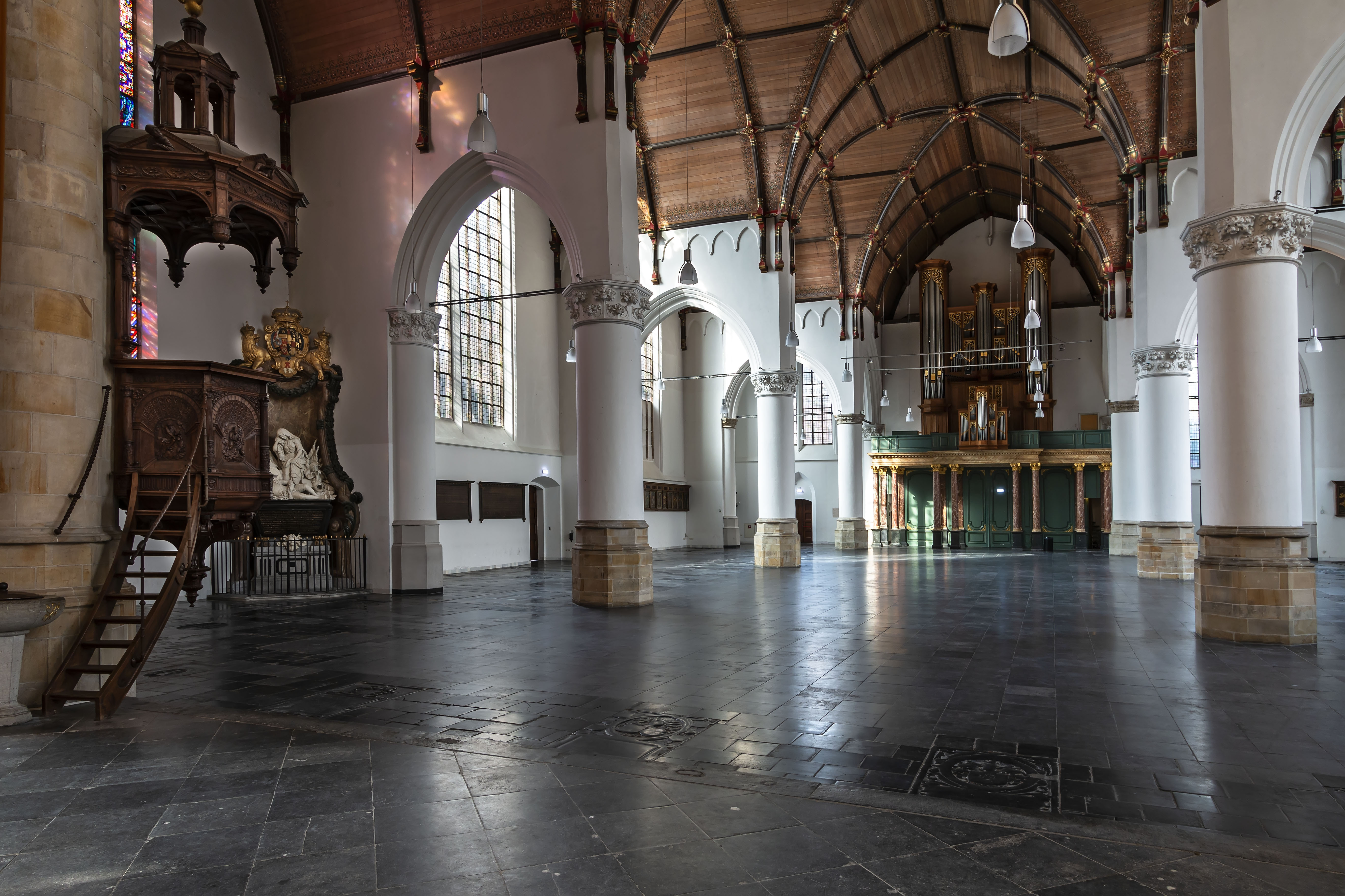 Laat-gotische kerk, bestaande uit een zeszijdige toren, schip met dwarse zijkapellen en een hoog basilicaal koor. Preekstoel van 1550 met rijk snijwerk, vroeg renaissance graftombe voor Gerrit van Assendelft en zijn vrouw, grafmonument voor Jacob van Wassenaar-Obdam uit 1667 door B. Eggers, monument voor Philips van Hessen-Phlipsthal, een aantal epitafen en zerken, 34 panelen met wapens en namen van ridders van het Gulden Vlies, wapenborden, gebrandschilderde glazen.
