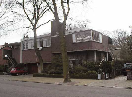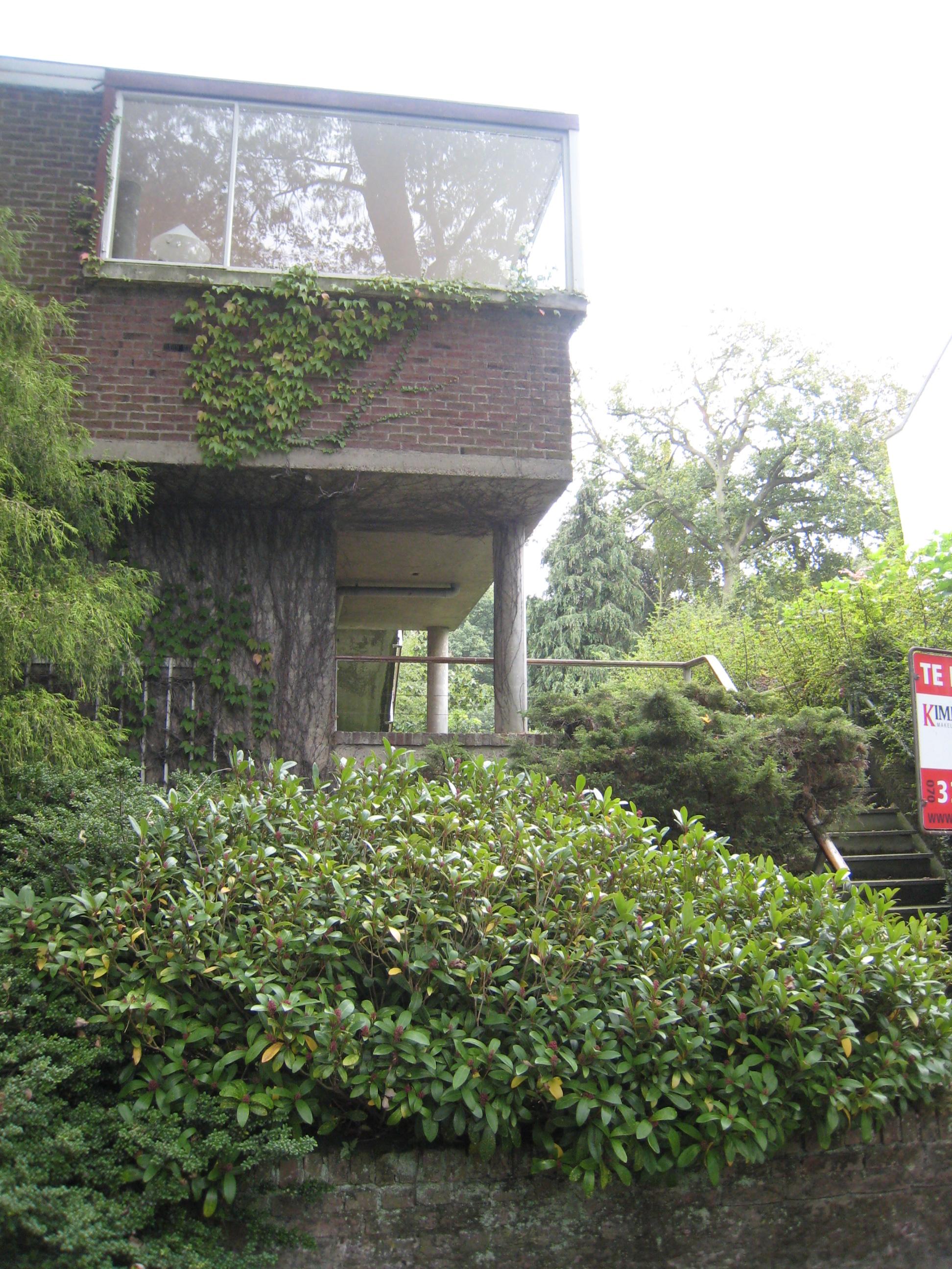 BUNKERHUIS met TERRASSENAANLEG en TUIN. De woning is opgetrokken in baksteen en beton op een min of meer rechthoekige plattegrond. De kozijnen zijn van staal. De woning zelf heeft geen verdiepingen. Intern zijn er geen trappen. Doordat de woning gebouwd is op een bunker zijn er wel niveauverschillen.