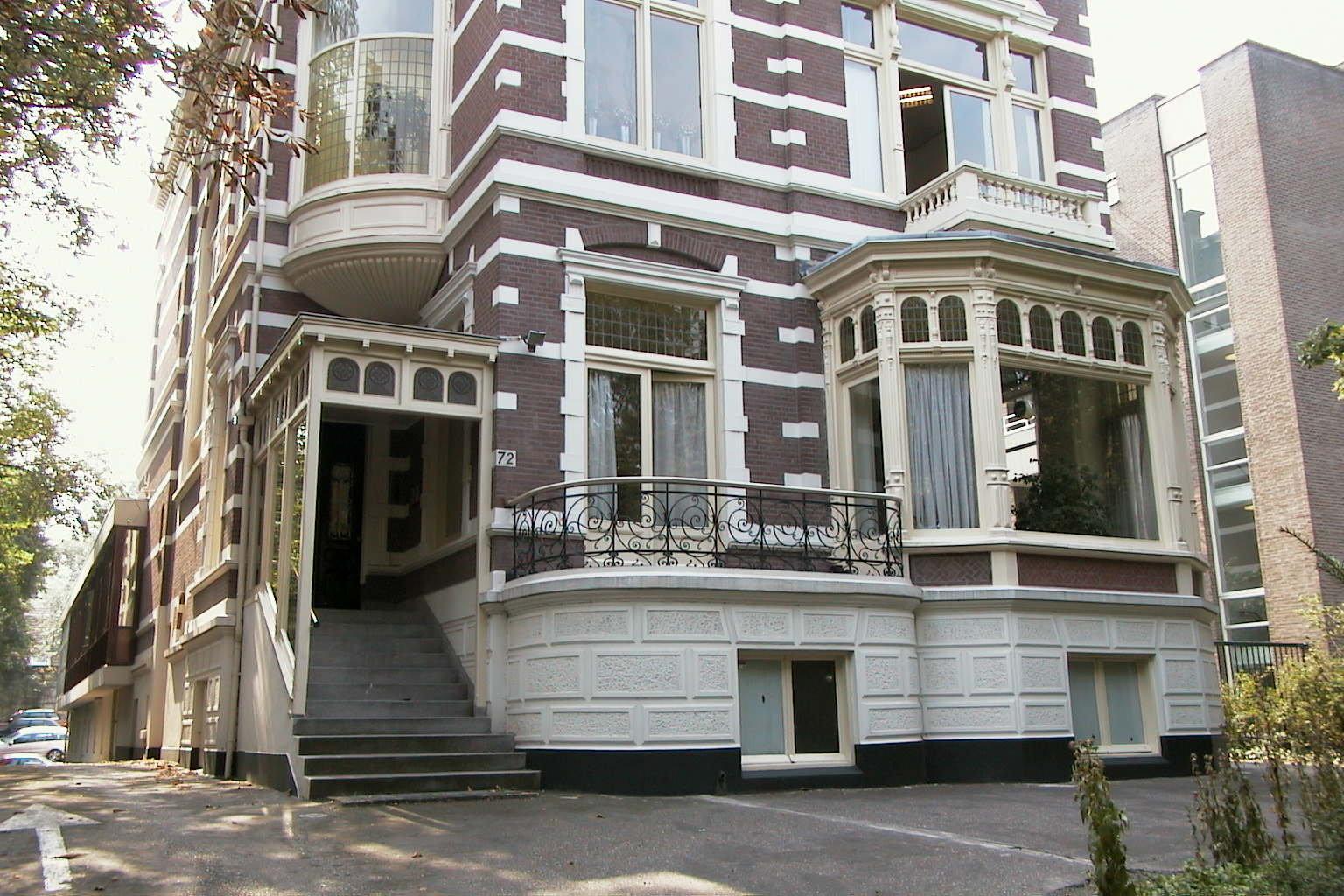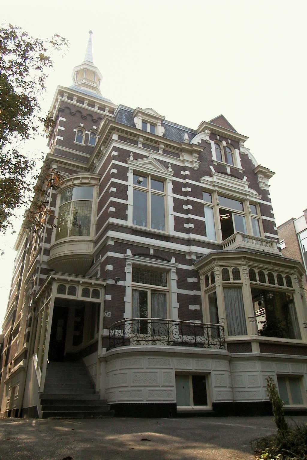 De gevels zijn ter plaatse van de verdiepingen in schoon metselwerk uitgevoerd, afgewisseld met de voor de neo-renaissance kenmerkende horizontale witte speklagen en hoekblokken. Aan de rechterkant van de beletage is een veelhoekige erker uitgebouwd met rondboogvormige glas-in-lood bovenlichten tussen geprofileerde pilasters. Boven de erker bevindt zich een klein balkon met balusters. Links van de erker boven het souterrain is een bordes met een smeedijzeren hek. De ingang met smeedijzeren panelen is aan de linkerkant in een portiek met kleine rondboogvormige bovenlichten van glas-in-lood. Hierboven in de hoek een kwartrond uitgebouwde erker.