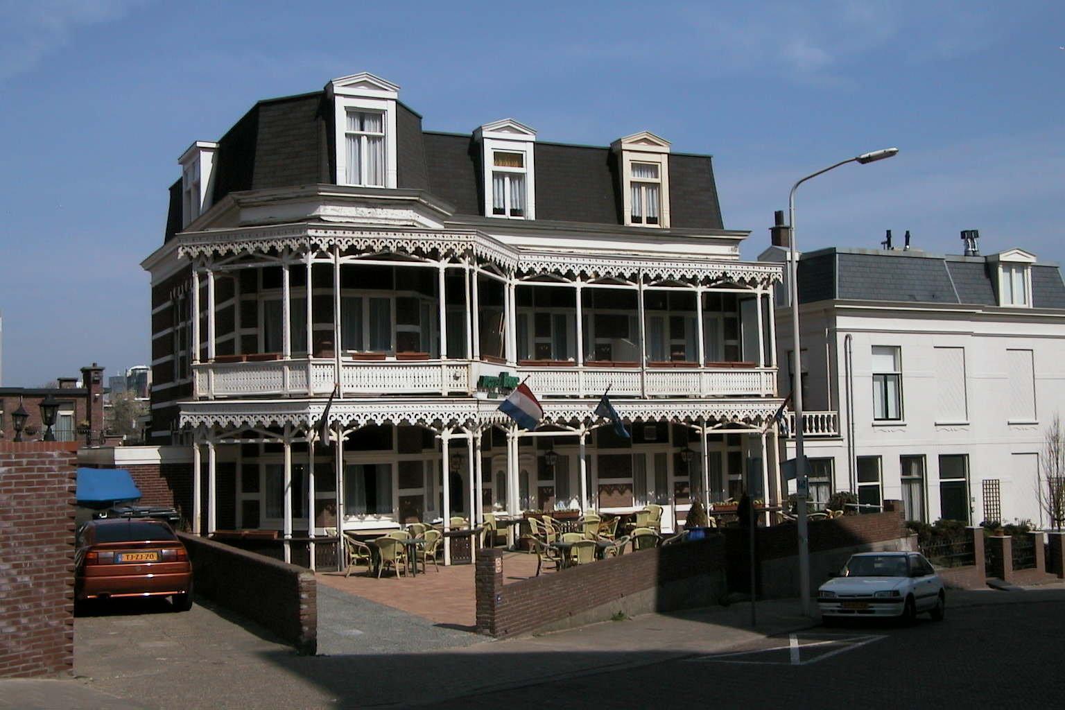Het acht traveeën brede pension telt twee bouwlagen en heeft een zolderverdieping in een met shingles gedekt afgeknot schilddak. In de kap zijn drie dakkapellen met frontonbekroningen. De gevels zijn in schoon metselwerk opgetrokken met gepleisterde sierbanden en worden afgesloten door een geprofileerde gecorniste houten kroonlijst. Aan de voorzijde is het linker deel driezijdig naar voren uitgebouwd. Over de volle breedte van de voorgevel is op de parterre en de eerste verdieping een open houten veranda in de trant van de chaletstijl. De dragers van de veranda's zijn houten pijlertjes. De lijsten van beide veranda's zijn versierd met rijk gesneden ornamenten. De borstwering van de veranda op de eerste verdieping is van hout en opengewerkt.