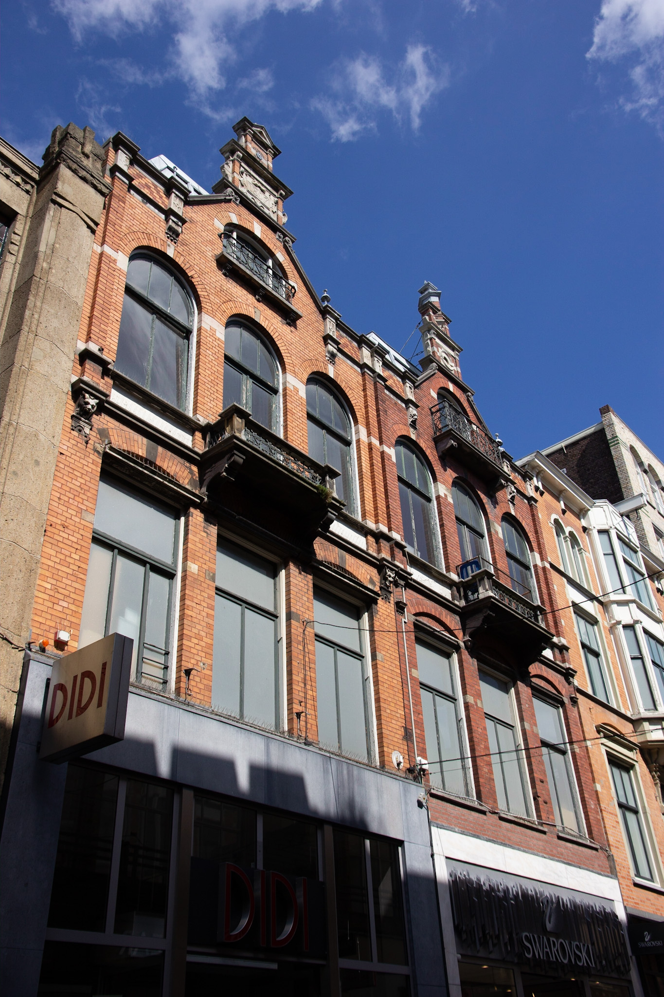 De twee nagenoeg identieke gevels zijn ieder drie assen breed en vormgegeven in een rijke neo-renaissancestijl. De oorspronkelijke winkelpuien waren wel verschillend uitgewerkt. Deze winkelpuien en achtergelegen indelingen op de begane grond zijn meerdere malen gewijzigd (onder meer in 1921 en 1991).