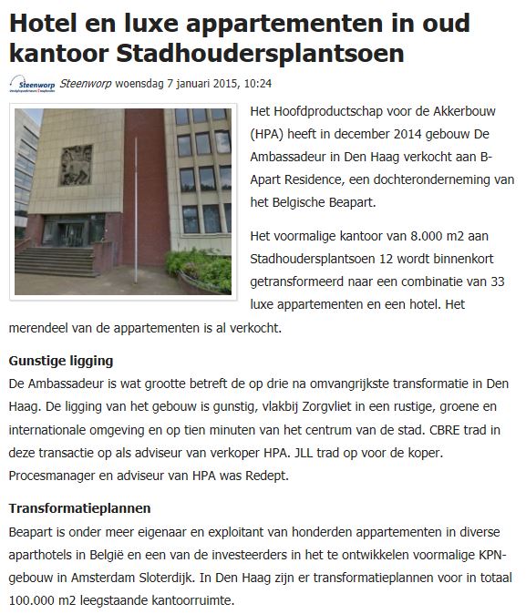 Geheel onderkelderd KANTOORGEBOUW met CONCIERGEWONING en GROENSTROOK met lage OMMURING voor het Hoofdproductschap voor Akkerbouwproducten (HPA), gebouwd tussen 1953 en 1955. Dit is het laatste werk van de Haagse architect J.W.E. Buijs (van het architectenbureau Buijs en Lürsen) waarin hij samenwerkte met architect W. Verschoor en diens zoon W.H. Verschoor. Het kantoorpand van het Hoofdproductschap voor Akkerbouwproducten werd gebouwd in de tijdens de tweede wereldoorlog door de bezetter ontruimde sperrgebiet ingerichte weststrook van Den Haag. Het pand voor het HPA maakte daarmee deel uit van het door W.M. Dudok ontworpen wederopbouwplan. Het gebouw wordt door een weg gescheiden van de brede groenstructuur van het Stadhoudersplantsoen met daarin de licht meanderende Haagse Beek. Aan de westzijde van het pand is een CONCIERGEWONING aangebouwd. Ter plaatse van het eveneens door Buijs ontworpen vroegere kantoor voor het Nederlandsche Rundveestamboek, ten zuidwesten van het HPA-gebouw, bevindt zich thans een ander gebouw. Het kantoorgebouw voor het Hoofdproductschap voor Akkerbouwproducten is in 1970 verbouwd, waarbij onder andere diverse raampartijen zijn vervangen. Het interieur is deels gewijzigd. Het pand is thans (2009) nog altijd in gebruik door het Productschap Akkerbouw.