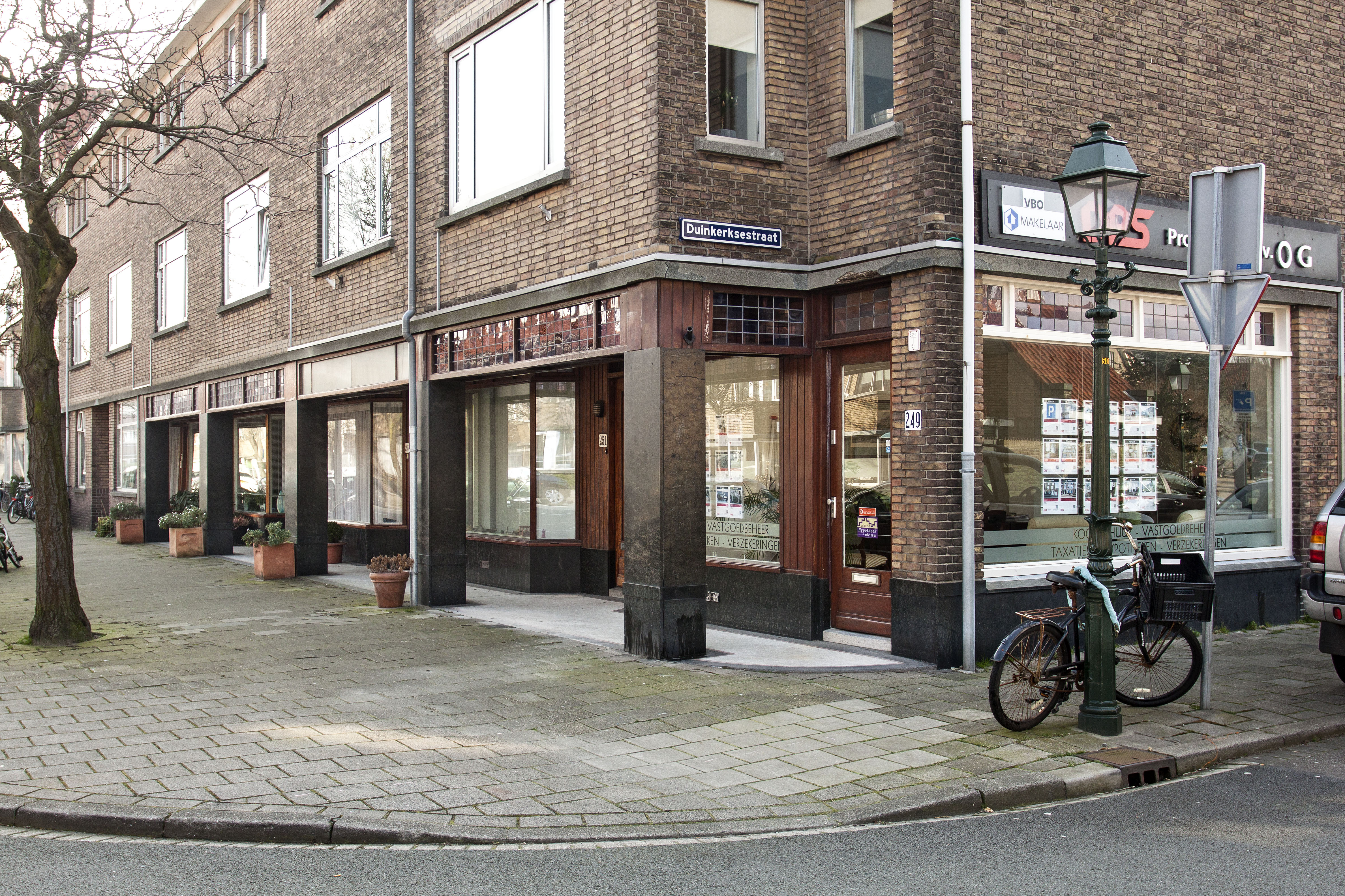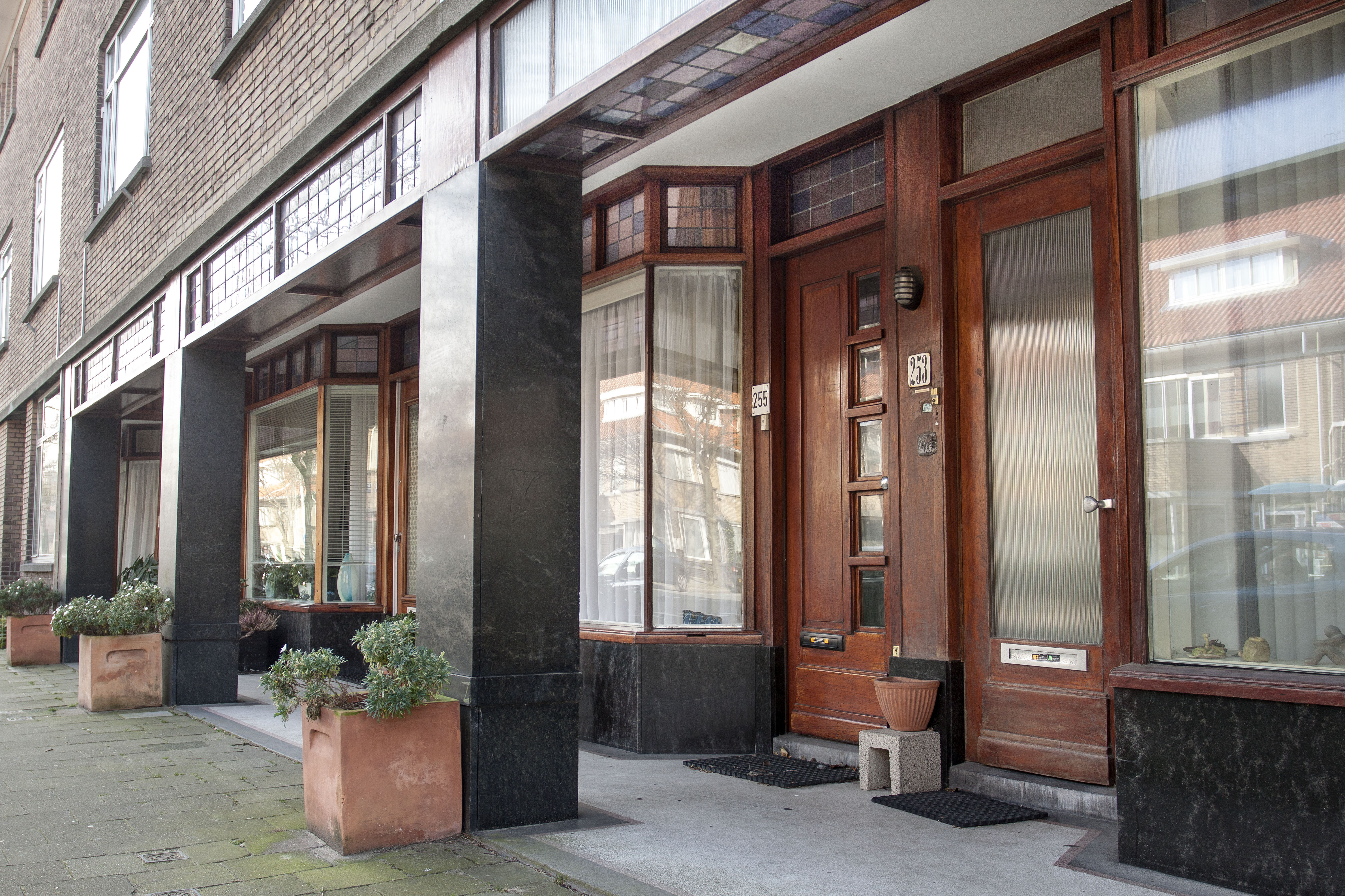 De galerij (251 t/m 259) beslaat het rechtergedeelte van het blok. Het linkerdeel (249 t/m 253) heeft twee terug gelegde portieken met de entree’s tot de woningen. De portieken met voordeuren zijn nog oorspronkelijk in gelakt houtwerk en glas-in-lood in de bovenlichten. De oorspronkelijke stalen ramen in de gevels zijn vervangen door aluminium ramen. De vier winkels die opgezet zijn als winkelgalerij, waren de eerste aanzet om van dit deel van de Stevinstraat een winkelstraat werd. Deze ontwikkeling heeft zich niet doorgezet; het is hier hoofdzakelijk woonstraat gebleven.