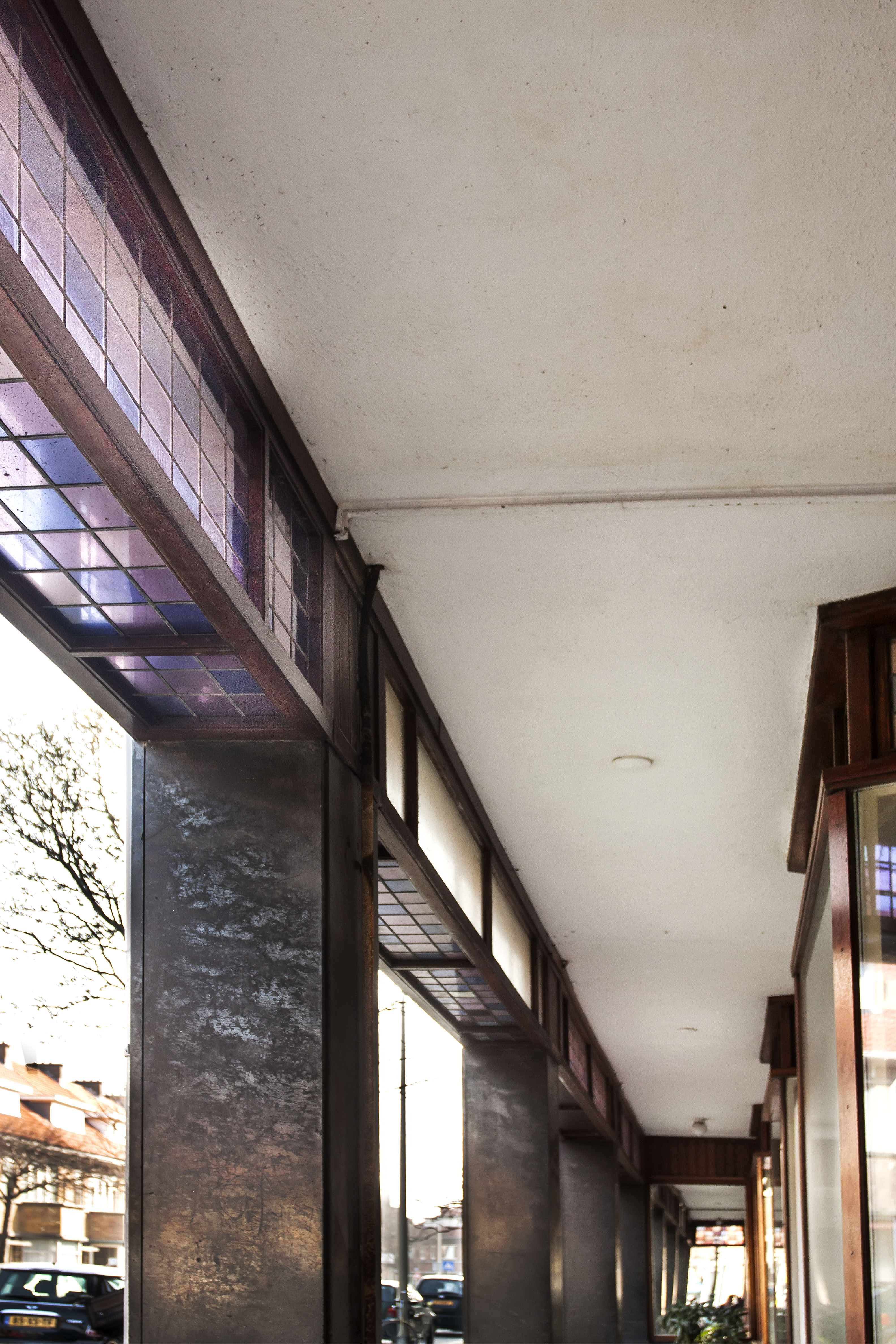 De winkelgalerij heeft uitgebouwde etalages van hout met glas-in-lood bovenlichten, waartussen zich de deuren naar de bovenwoningen bevinden. Zeldzaam en goed bewaard gebleven is de afscheiding in de vorm van een ‘balk’ van glas-in-lood aan de bovenzijde tussen de kolommen. Zowel de voor- en achterkant áls de onderkant zijn voorzien van glas in lood; een bijzondere luchtige en elegante beëindiging van de diepzwarte kolommenrij.