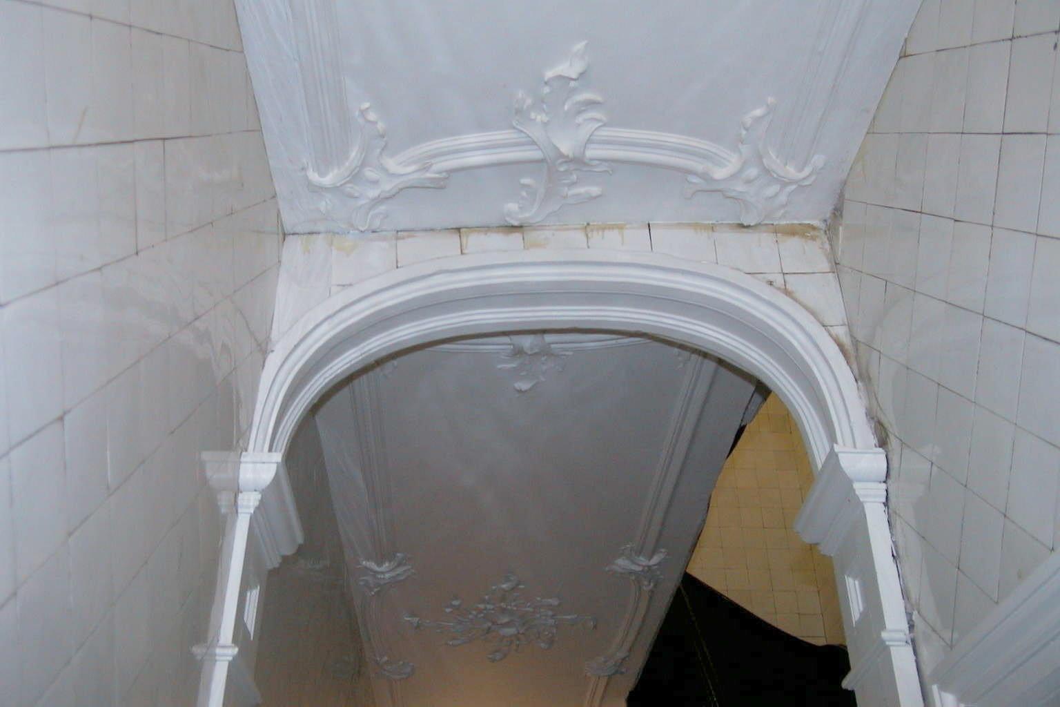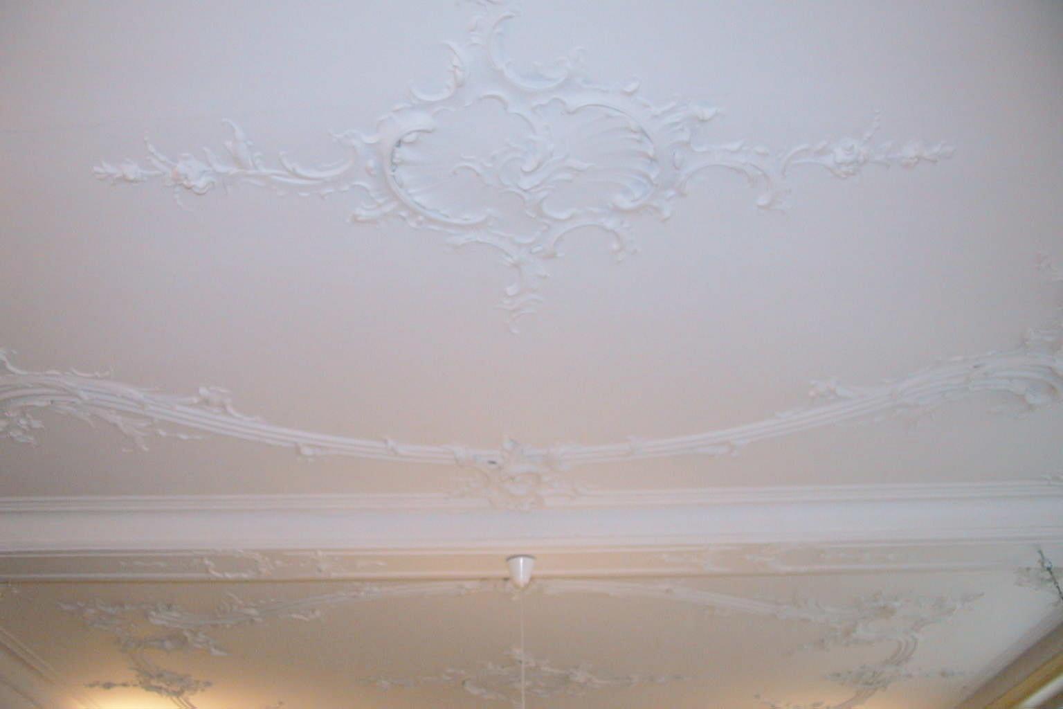 Zwart marmeren 19de-eeuwse schoorsteenmantel; deur met getoogd paneel, 18de eeuw, in geprofileerde omlijsting. Op de verdieping een eclectisch stucplafond en schoorsteenmantel, tweede helft 19 eeuw.