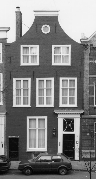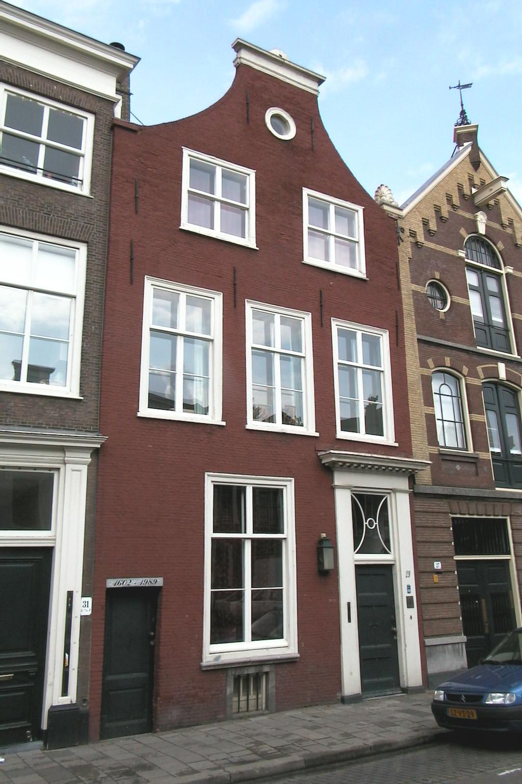 Pand, drie vensterassen breed, uit de 17de eeuw met ingezwenkte lijstgevel, oeuil-de-boeuf en deuromlijsting met kroonlijst op klossen. Vierruitsschuiframen op 2e verdieping.
