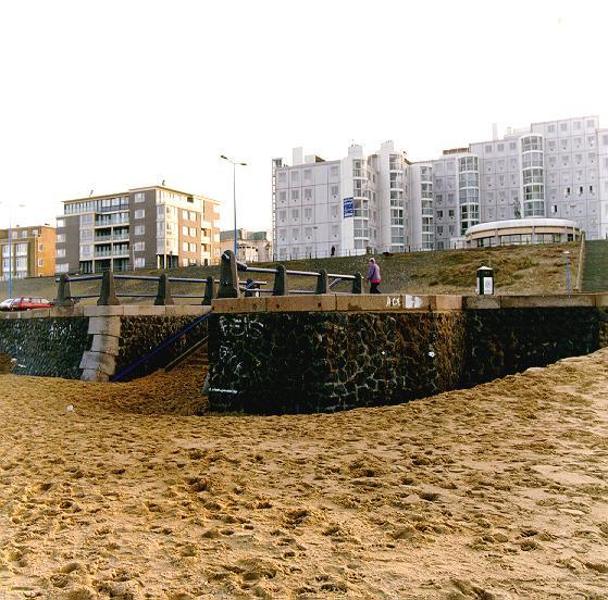 De mitrailleurkzamatten zijn op drie plekken opgenomen in de strandmuur, die daar voor aangepast werd. Zij liggen steeds in het richting zee uitstulpende bouwdeel, waarin een trap is verwerkt.