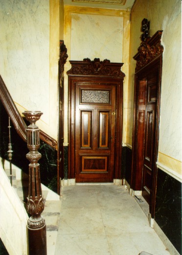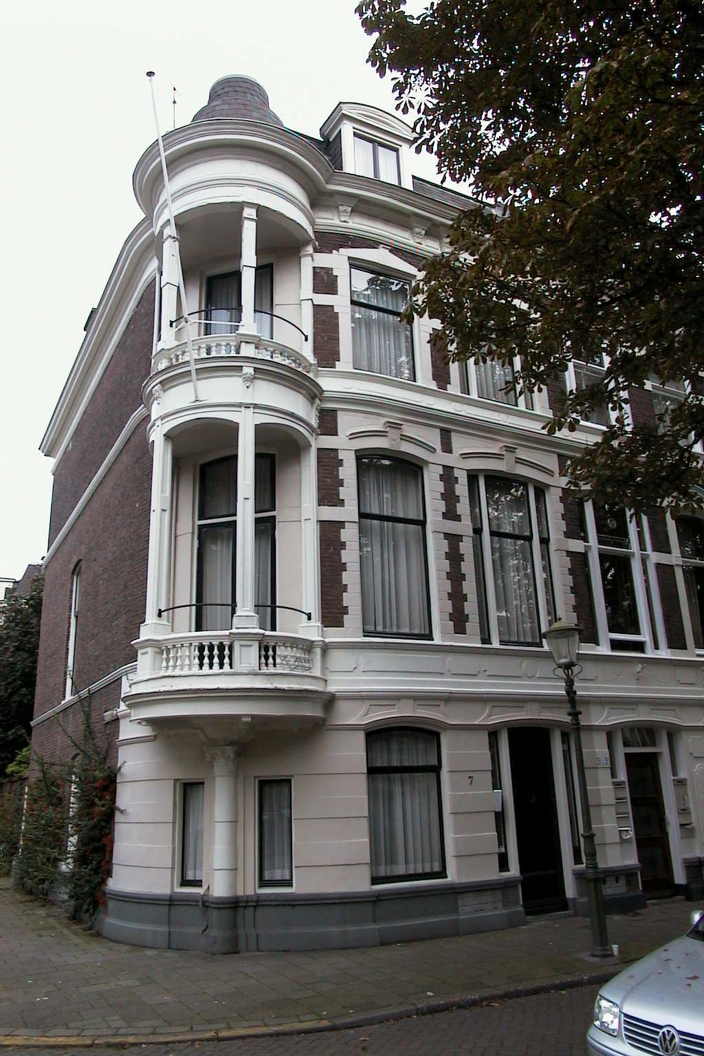 Hoekpand, bestaande uit parterre en twee verdiepingen, 1882-1884. Eclectische lijstgevel met blokken en banden van pleister en sluitstenen in terracotta. Met hardsteen beklede plint, in pleister gebosseerde parterre. Houten kroonlijst met neo-Lodewijk XIV consoles en panelen in het fries. De hoekpartij wordt geaccentueerd door een open erker langs de eerste en tweede verdieping met balustrades. De erker rust via voluten op een gebosseerde muurpijler met een composiet kapiteel. Aan de Paramaribostraat een sobere zijgevel.