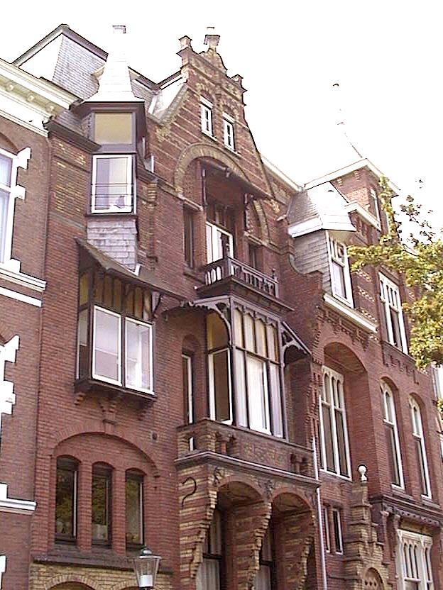 Pand in neo-renaissance trant uit het einde van de 19e eeuw met souterrain. Balcon op consoles, waarboven een houten erker. Afgeknotte trapgevel. Links een driezijdig torentje.