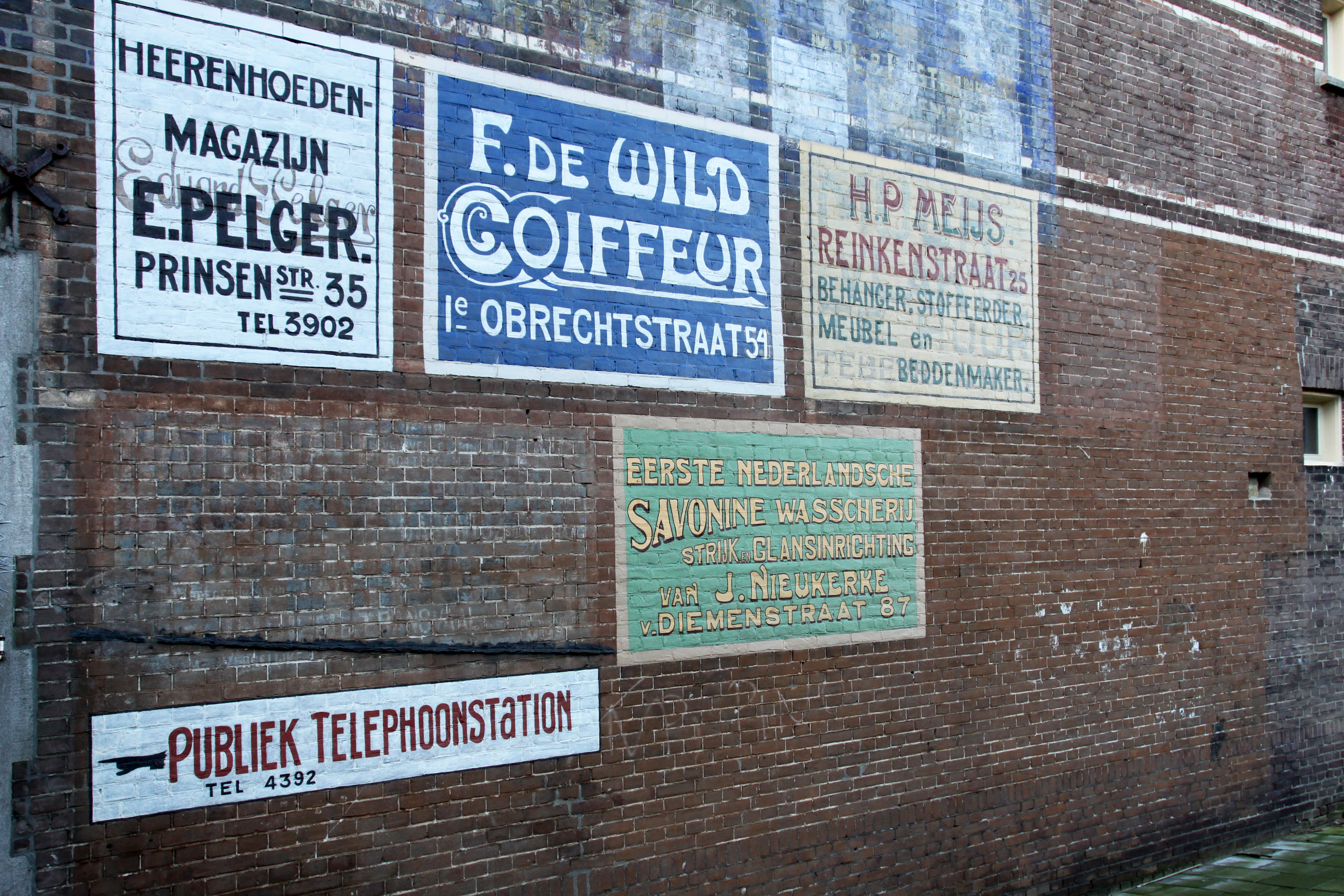 De eerste eigenaar van het pand aan de Tasmanstraat, L.K.C. de Haas, uitgever en drukker, verhuurde zijn vrijstaande zijmuur aan bedrijven. Zij lieten door schildersbedrijven de reclame aanbrengen en betaalden vervolgens daarvoor per vierkante meter per jaar een bepaald tarief aan de eigenaar. Werd er niet meer betaald, dan ging er weer een nieuwe reclame overheen. Zo ontstond in de loop van een aantal decennia een laag van in totaal 22 muurreclames, die door weer en wind werden aangetast en later door elkaar heen gingen schemeren. Het grote aantal reclames op één muurvlak is uniek voor Den Haag. Langs deze muur reed tot circa 1915 de stoomtram van station Hollands Spoor naar het Vredespaleis en hier ter plekke was een halte. Er kwam dus veel publiek langs wat het zeer aantrekkelijk maakte om hier een muurvlakte te huren voor reclamedoeleinde. Tussen 2009 en 2012 zijn door het restauratiebedrijf Klarenbeek-Melissen zeven reclames gerestaureerd en weer goed zichtbaar gemaakt: