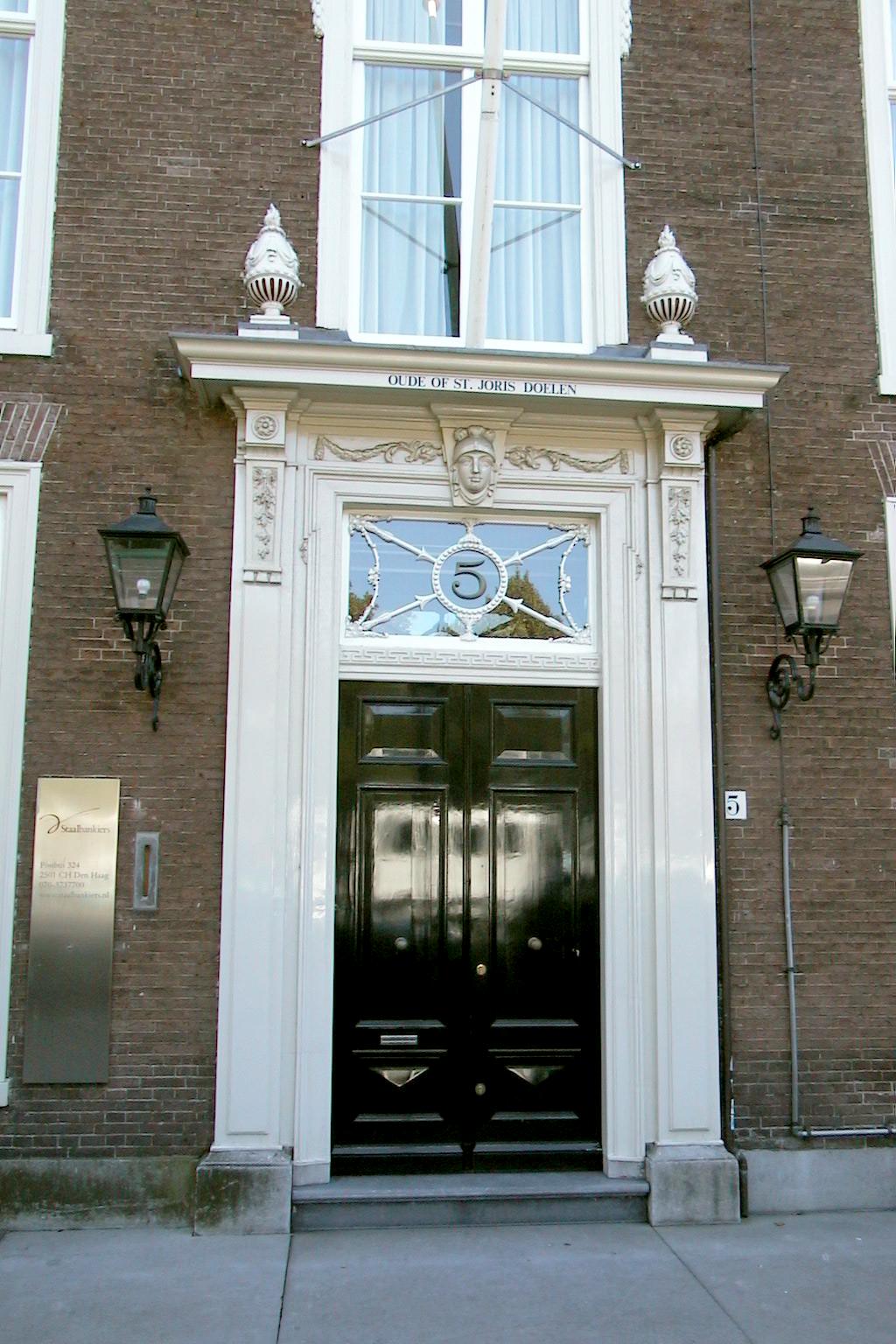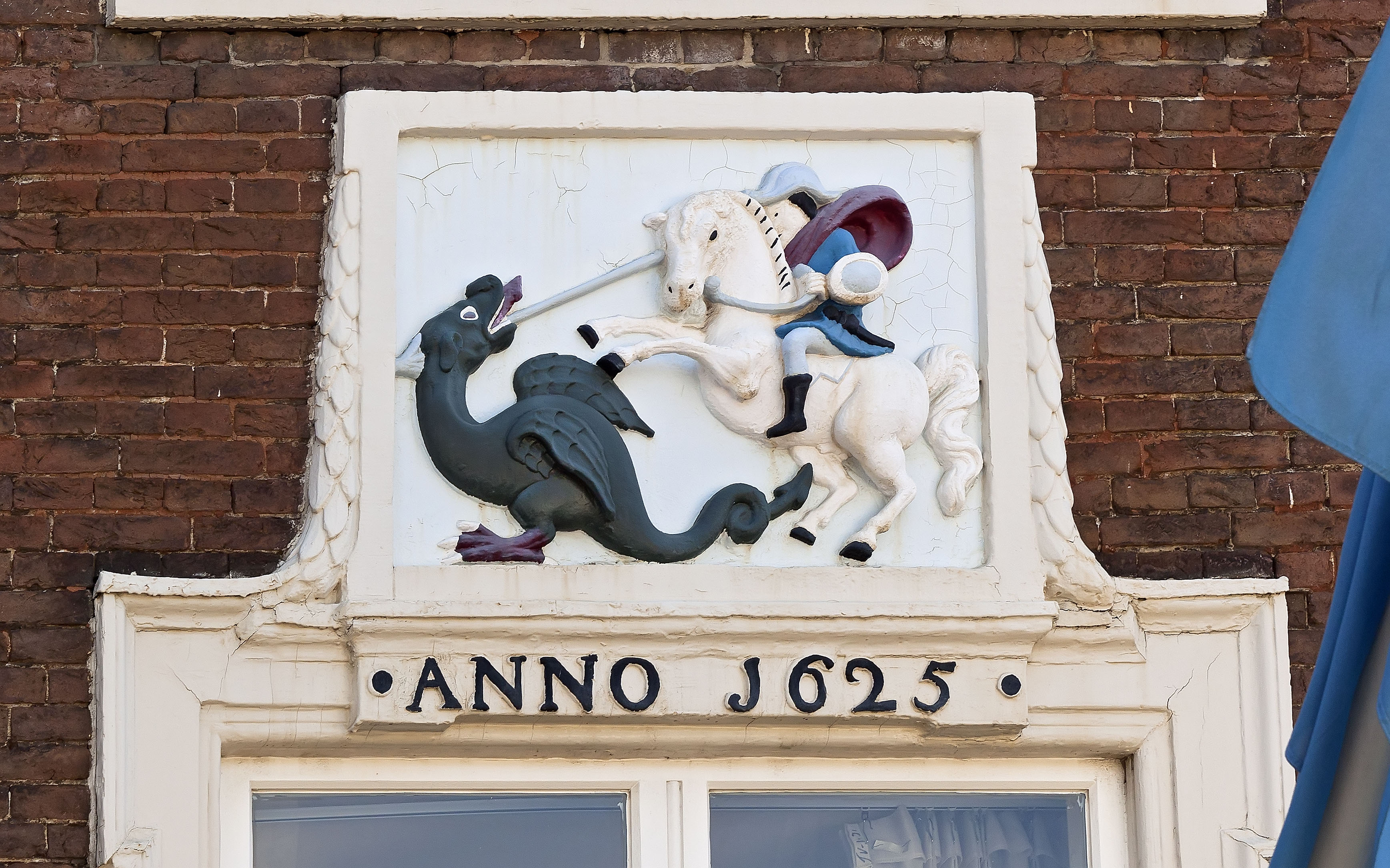 Gevel van pl.m. 1750 met versierde ingangspartij, gevelsteen: St. Joris en jaartal: 1625 - torentje van pl.m. 1700 - inwendig restanten van een ouder gebouw en een Lodewijk XIV schoorsteen.