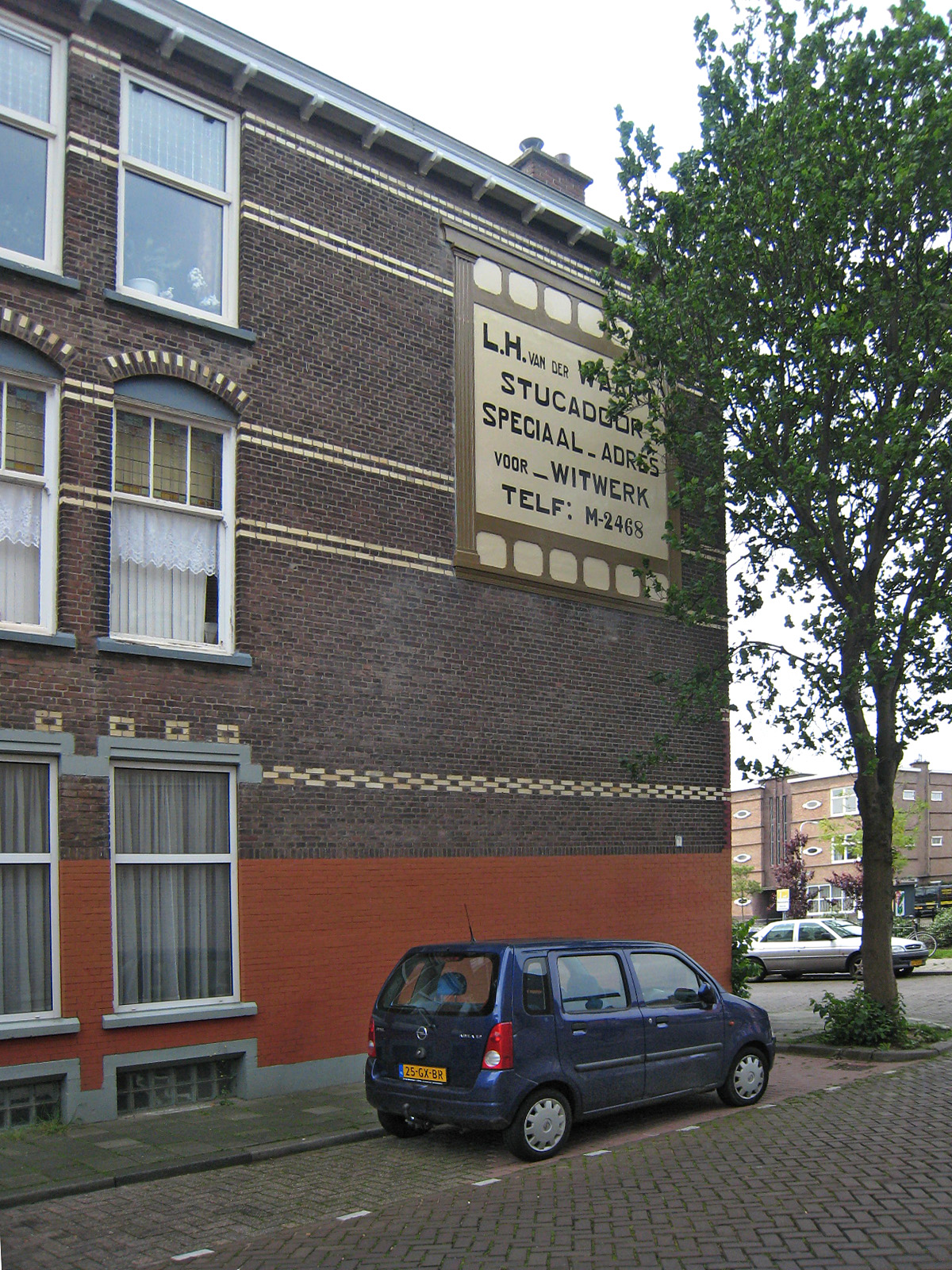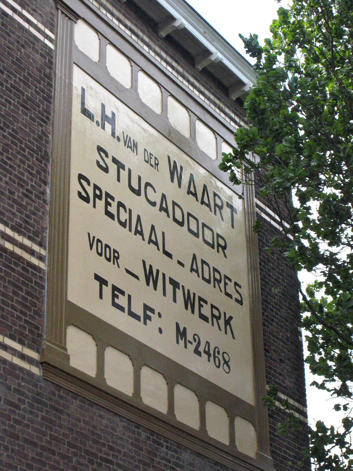 Muurreclame voor stucadoor L.H. van der Waart in zijn huidige opzet daterend uit circa 1920, aangebracht op de zijgevel aan de Frederik Ruijschstraat van het uit 1915 daterende hoekpand met boven- en benedenwoning.