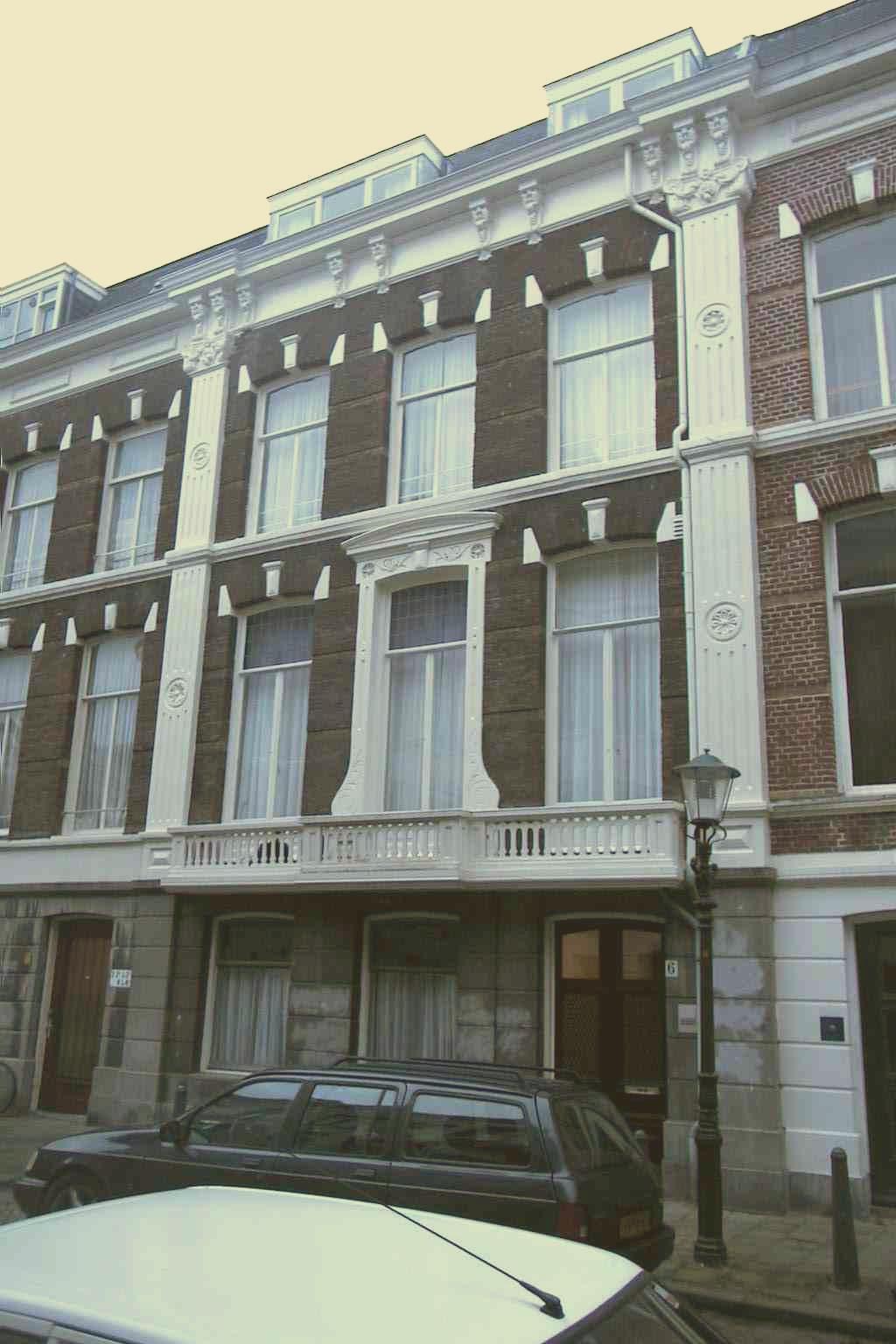 Pand met lijstgevel in eclectisohe trant! Gebouwd in 1881 door L.N. Leyendekkers, timmerman, en L.F. Leyendekkers. Parterre en twee ver diepingen. Gecanneleerde pilasters van de kolossale orde met rozetver- sieringen en kapitelen in een vrije versie van de Corinthische orde. Het middenvenster van de verdieping bezit zijvoluten en een gebogen fronton. Voor de eerste verdieping een balkon met houten balustrade. Dubbele deur uit de bouwtijd met gietijzeren roosters. ' 'Speklagen' ' van verdiepte gele baksteen. De huizen met de nrs. 2 t/m 10 vormen een symmetrische groep.