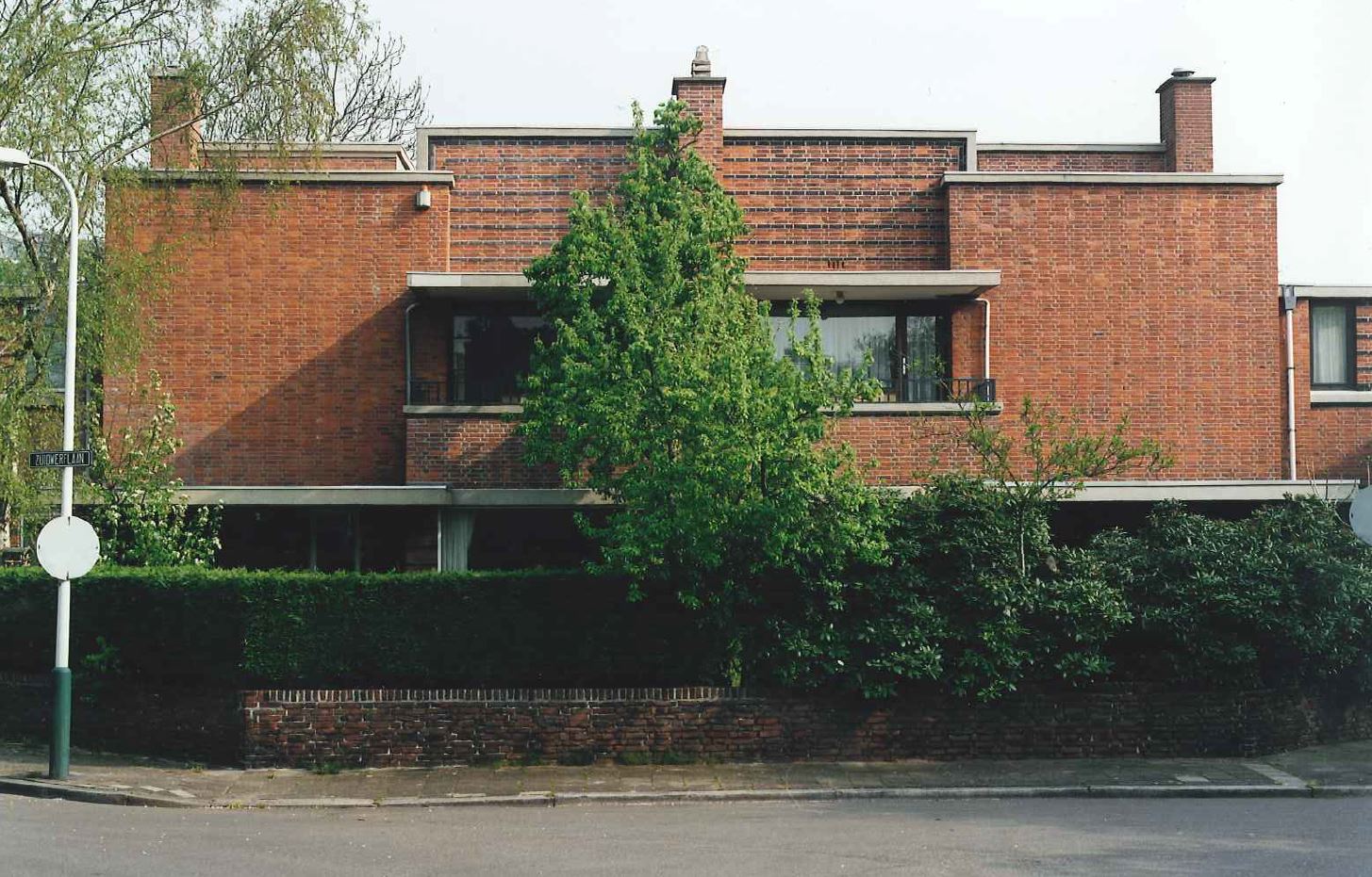 Twee geschakelde herenhuizen die onder een hoek van 45 graden ten opzichte van de rechthoekige kruising liggen, bestaande uit twee bouwlagen onder platte daken. Kenmerkend voor de hier uitgevoerde rode baksteenarchitectuur is onder meer de kubistische opzet van in elkaar grijpende bouwdelen, verspringende gevelvlakken, de ritmische herhaling van de schoorstenen, de toepassing van overdekte balkons, erkers en terassen, pergola's en lage tuinmuren, de overheersende horizontaliteit in de vorm van betonnen lateien, dorpels, afdekplaten en luifels en het aansmeren van horizontale baksteen met zwarte teer. De tuinmuren en de pergola's vormen een wezenlijk onderdeel van de architectuur waarmee de geleidelijke overgang van binnen naar buiten wordt geaccentueerd. De vensters van no.14 zijn door kunststoframen vervangen; die van no.24 door aluminium.