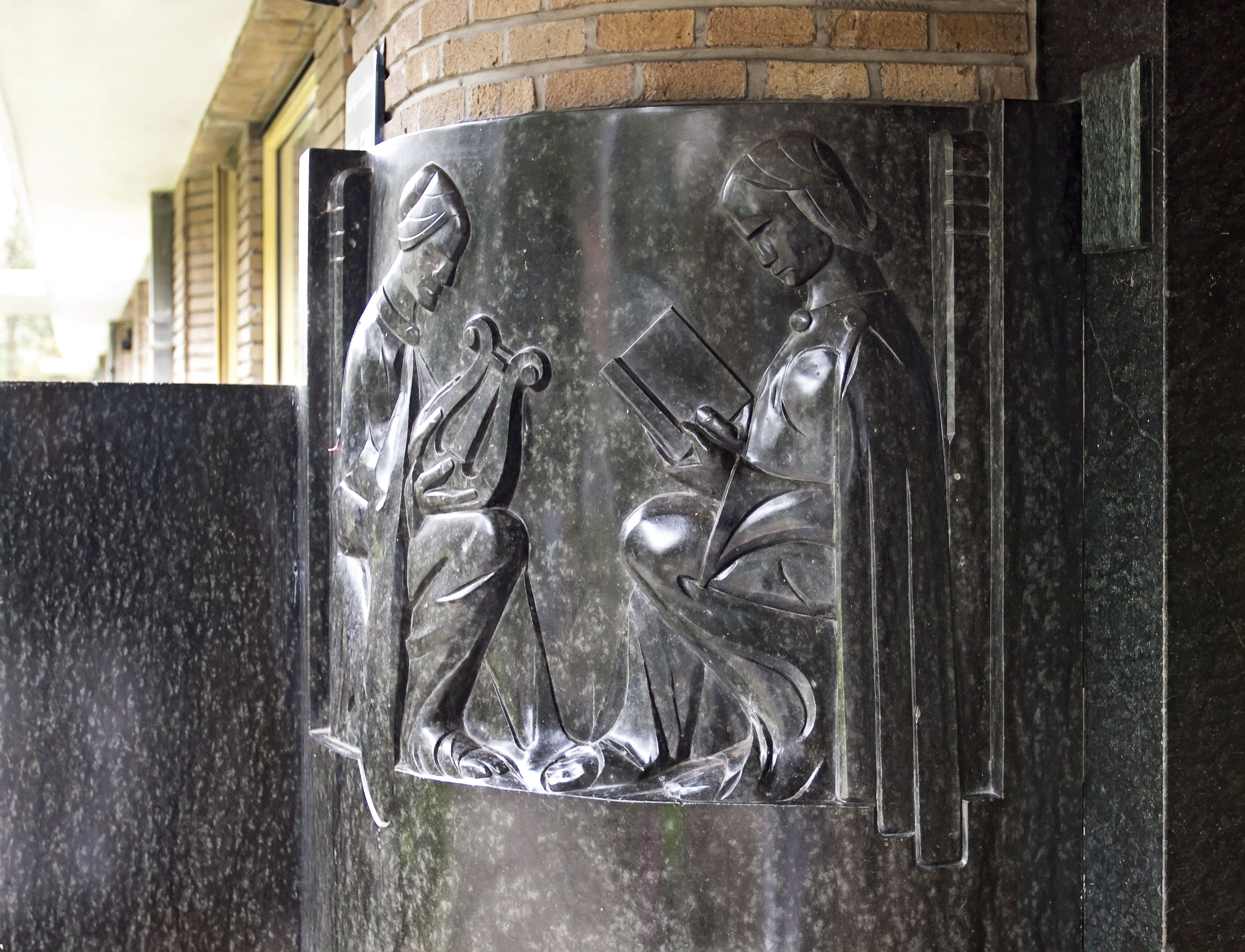 Het gebouw is opgetrokken in gele baksteen en vertoont boven de parterre een doorlopende, betonnen cordonlijst die bij de middenpartij en de linker vleugel verdubbeld is.