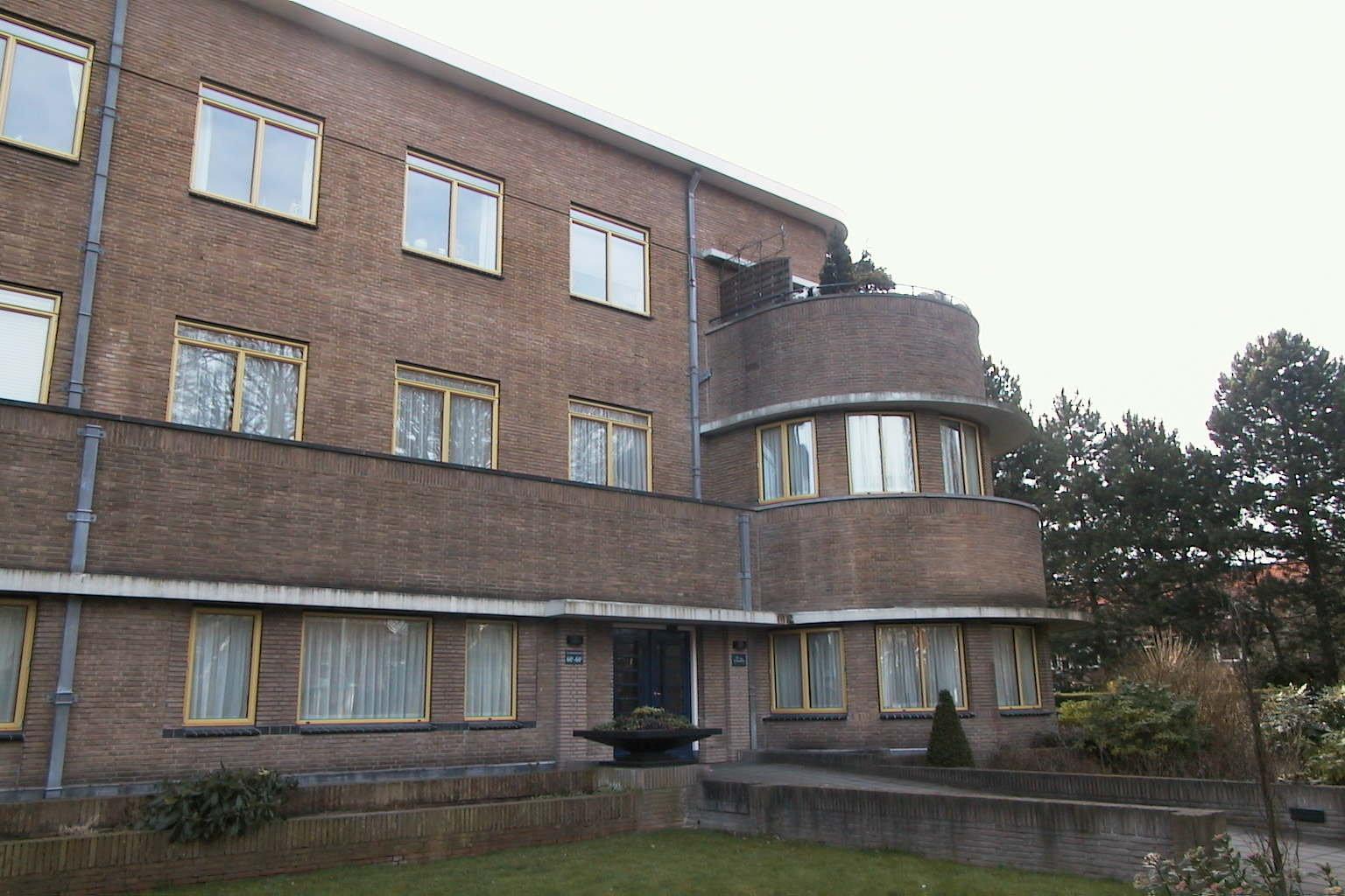 Door een tuin met gemetselde tuinmuur omgeven voormalig appartementengebouw op rechthoekige plattegrond met uitbouwen. Het vrijstaande pand is in 1929-1930 gebouwd naar ontwerp van F.L.J. Lourijsen in opdracht van de "N.V. Nederlandsche Flatbouw" en vertoont de kenmerken van de Nieuwe Haagse School. In de jaren vijftig werd het verbouwd tot kantoor.