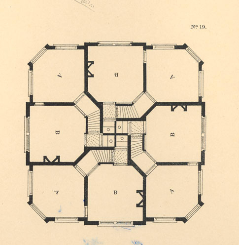 In het midden van de langgerekte blokken woningen bevinden zich drie blokken die een rijkere opzet en decoratie vertonen (Jacob Catsstraat 65/39-65/58, 65/22 en 65/75). Het middelste van deze blokken bestaat uit vier woningen rug-aan-rug en is versierd met trapgevels op het midden van de vier zijden en boven de afgeschuinde hoeken. Bovendien zijn hier sierankers en rijk vlechtwerk in de boogtrommels toegepast. De panden 65/22 en 65/75 bezitten traptorens met vierzijdige spitsen en een half-rond uitgebouwd toilet op de verdieping.