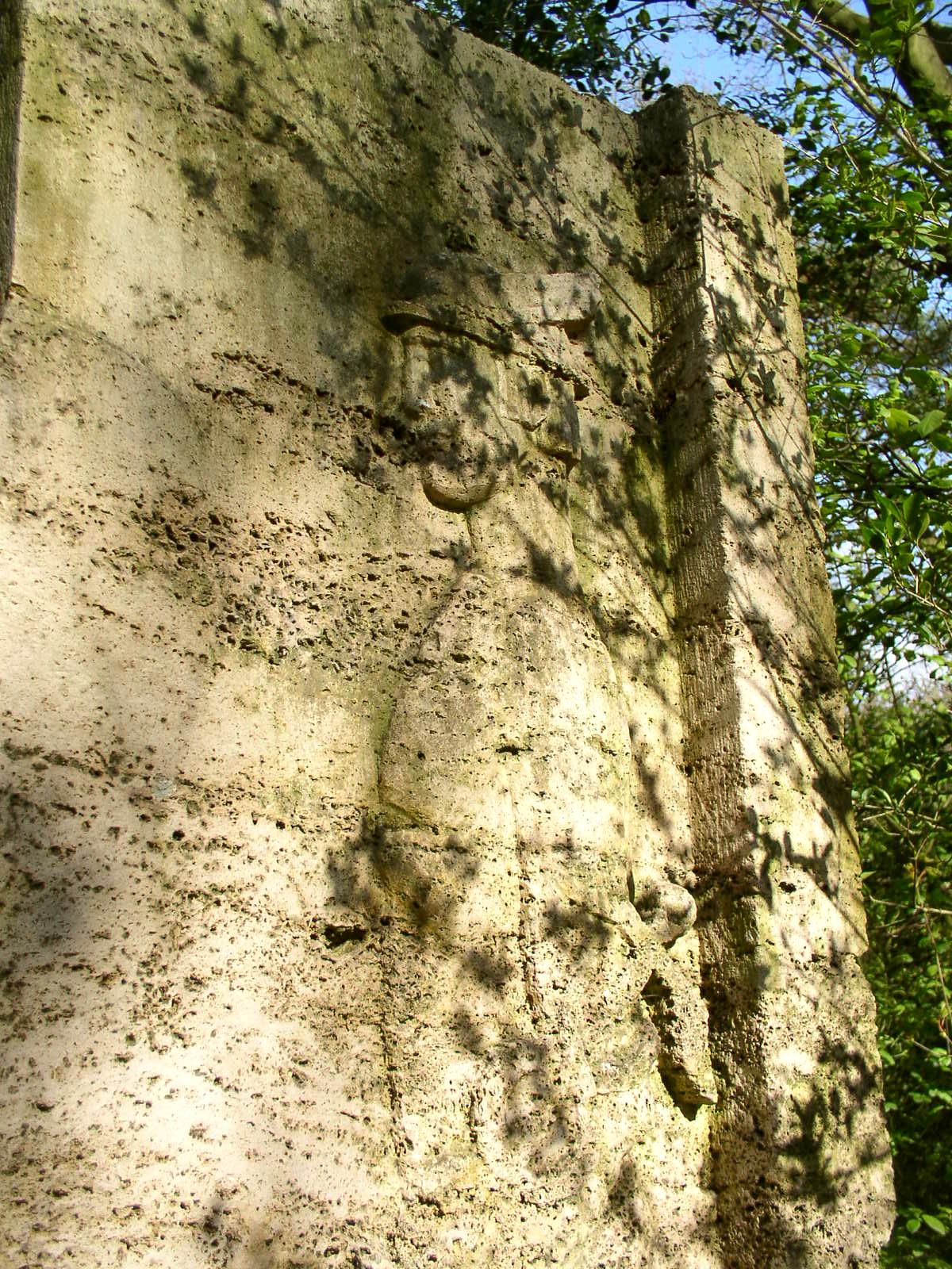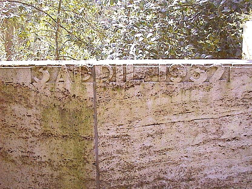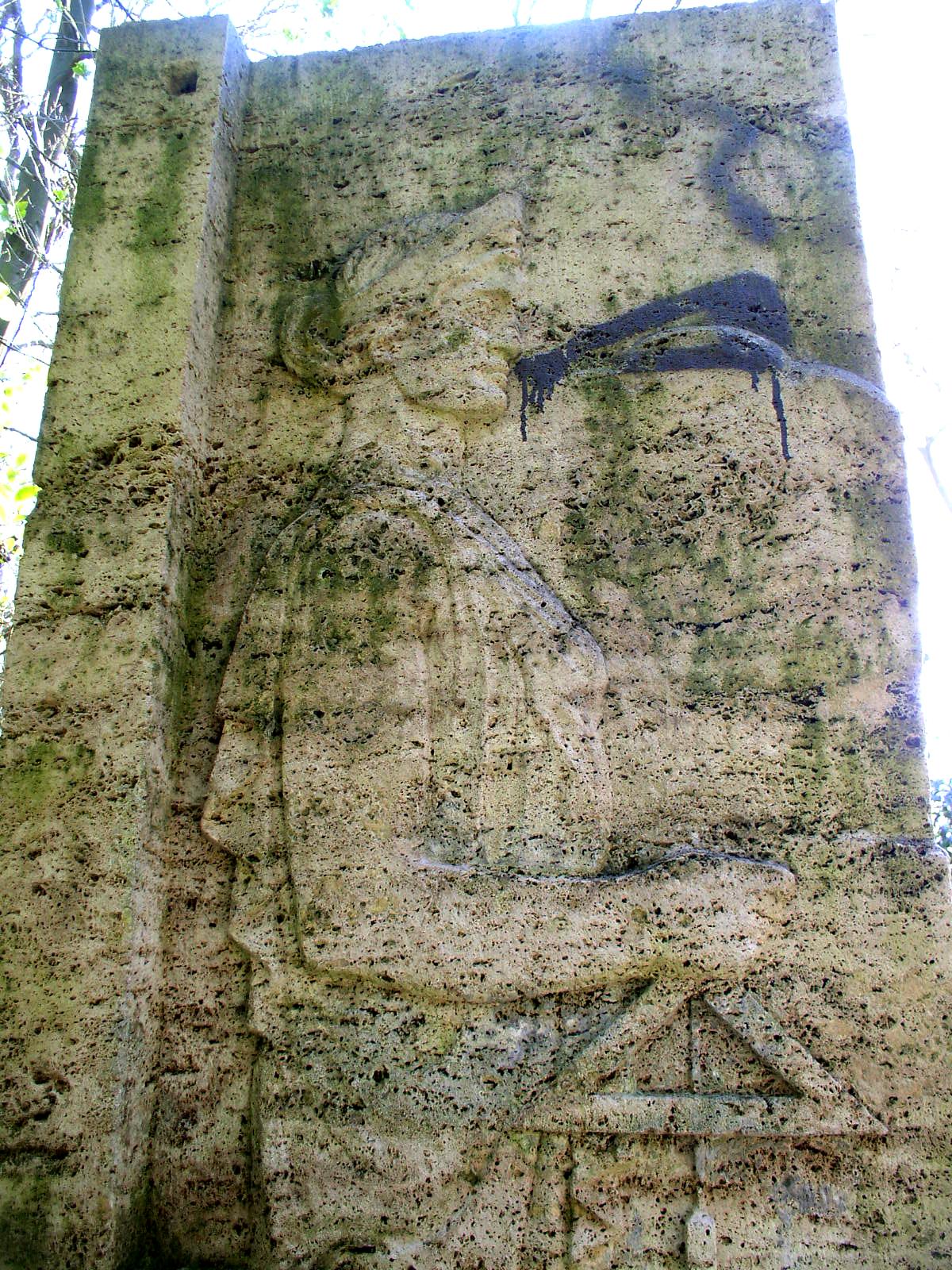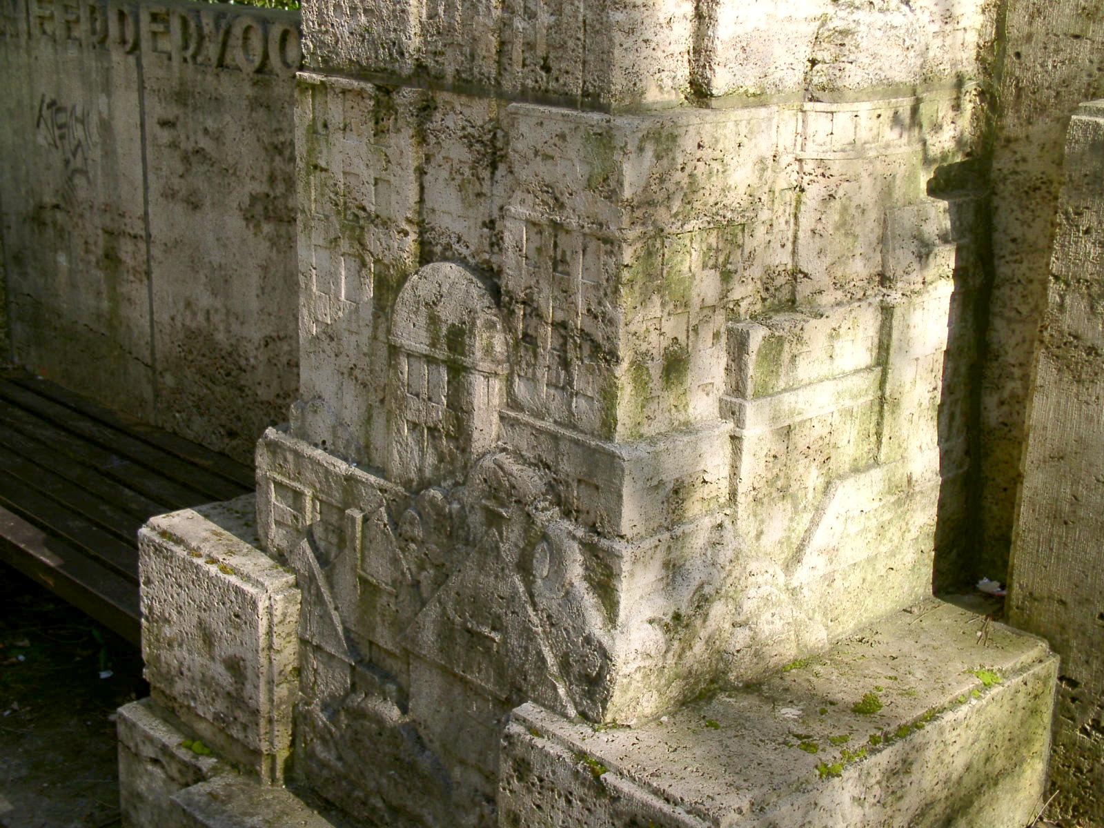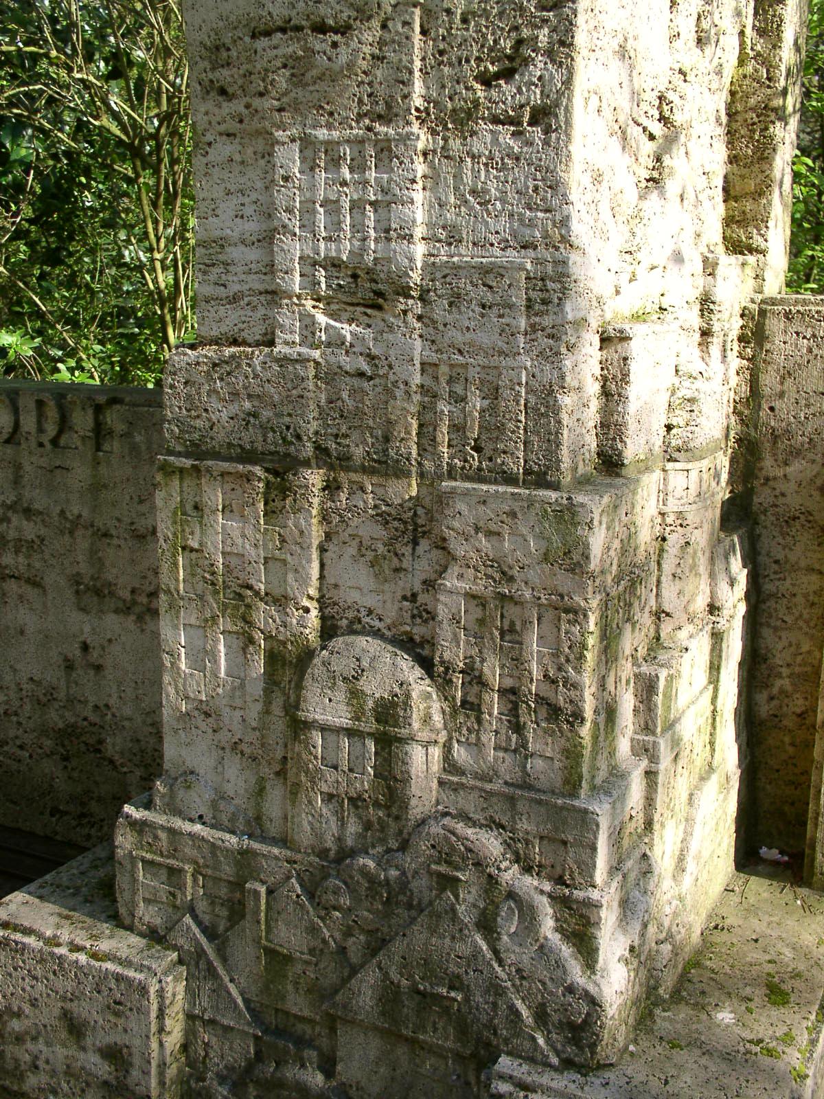 In de vloer is een lange achthoek gespaard voor een bloemen- bed. De bank wordt geflankeerd door een hoge zuil van recht hoekige vorm waaromheen een symboliek van de stedenbouw in bas-reliëf is uitgehouwen. Langs de voorzijde en beide zijkan ten van de zuil is een geïdealiseerd modern stadsbeeld gehakt, beginnend aan de onderzijde met een villa in een buitenwijk, daarachter de bebouwing in de stadswijken en als kern de hoog oprijzende bebouwing van de moderne binnenstad, die zich in zijn onbegrensde hoogte in de wolken verliest.