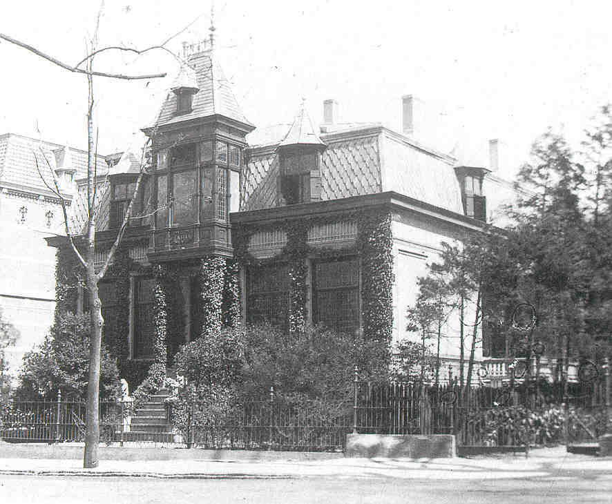 De tuin wordt van de straat gescheiden door een gietijzeren hek op hardstenen voet.