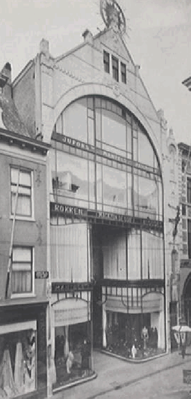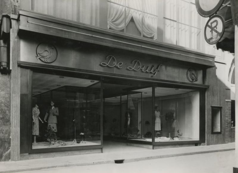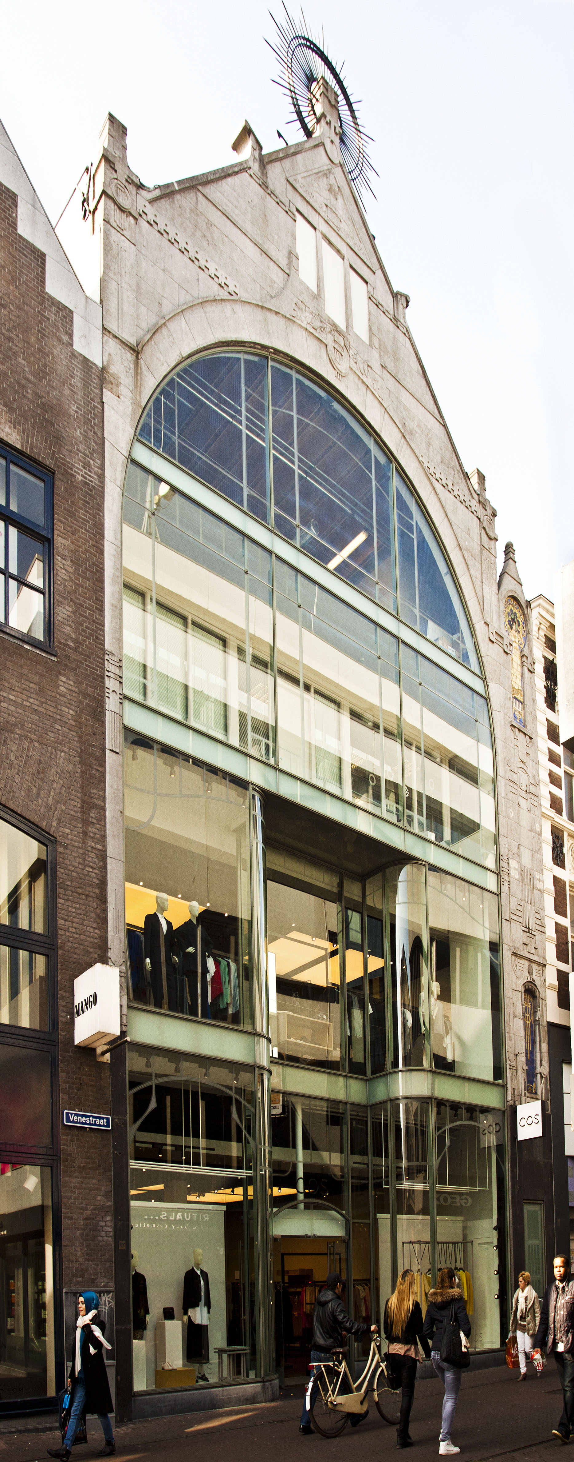 Gevel van het in 1905 naar ontwerp van W. Molenbroek gebouwde winkelmagazijn "De Duif". Rijzige, natuurstenen puntgevel grotendeels in beslag genomen door een over alle bouwlagen doorlopend rondboogvenster met ijzeren onderverdeling. In de geveltop sculptuur (hoekpilasters, een gebeeldhouwde adelaar, een drielichtszoldervenster en een toppilaster met ijzeren zonmotief) in door de Wiener Sezession beïnvloede stijl. De gevel wordt aan de rechterzijde afgesloten door een pilasterachtige penant waarin nissen met polychrome tegeltableaux in Jugendstil.